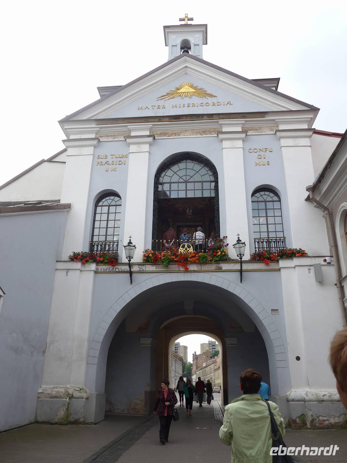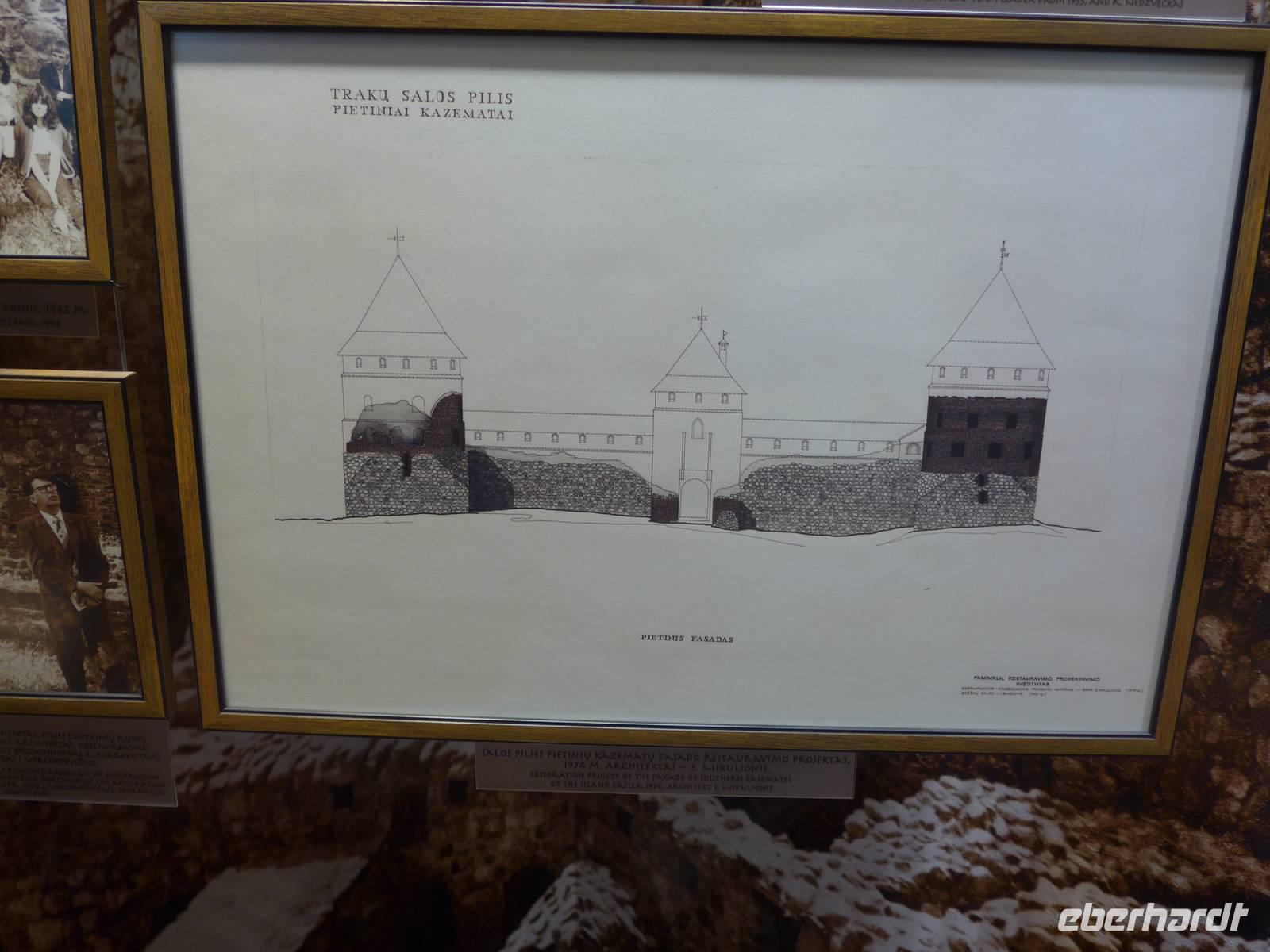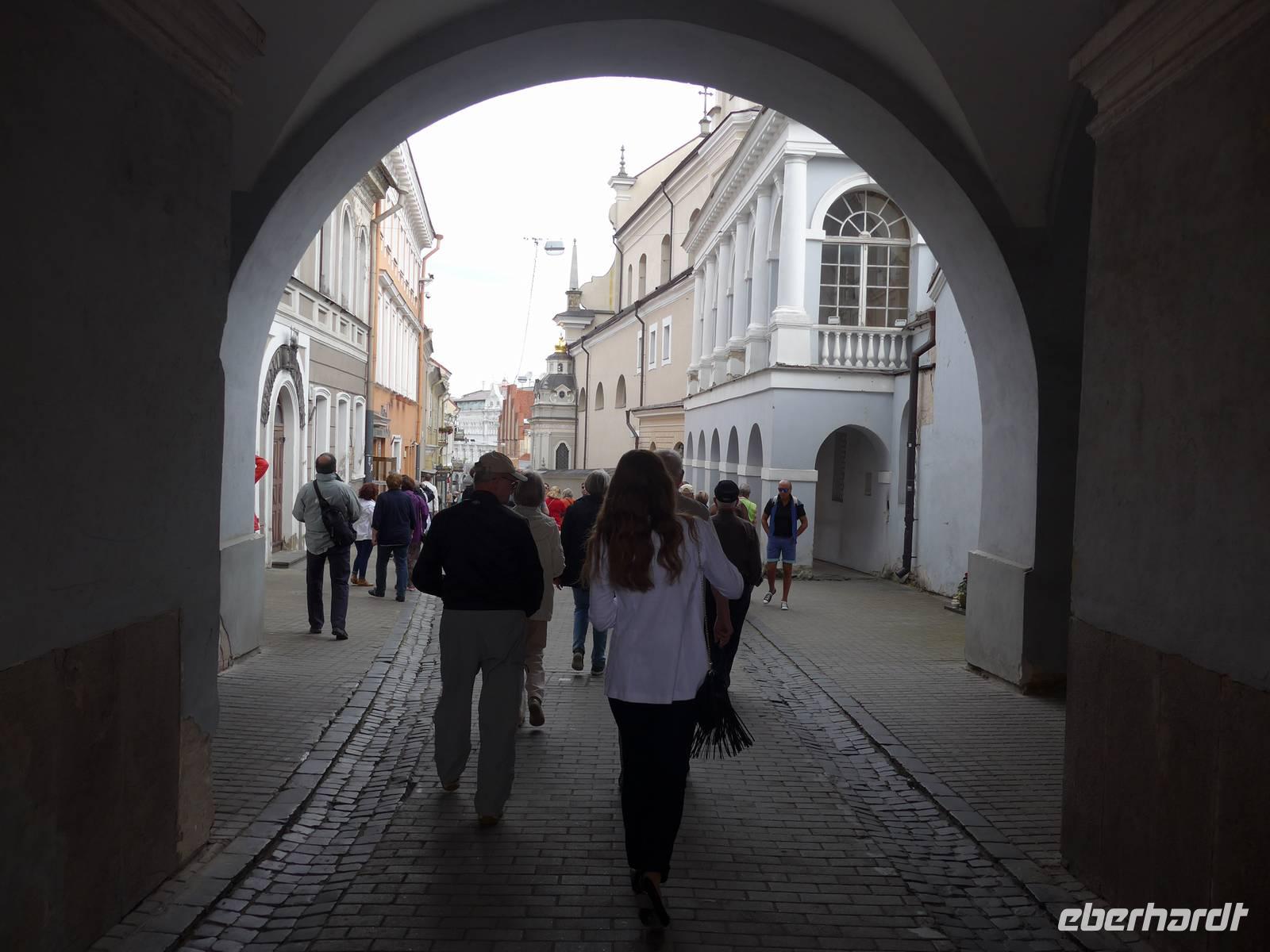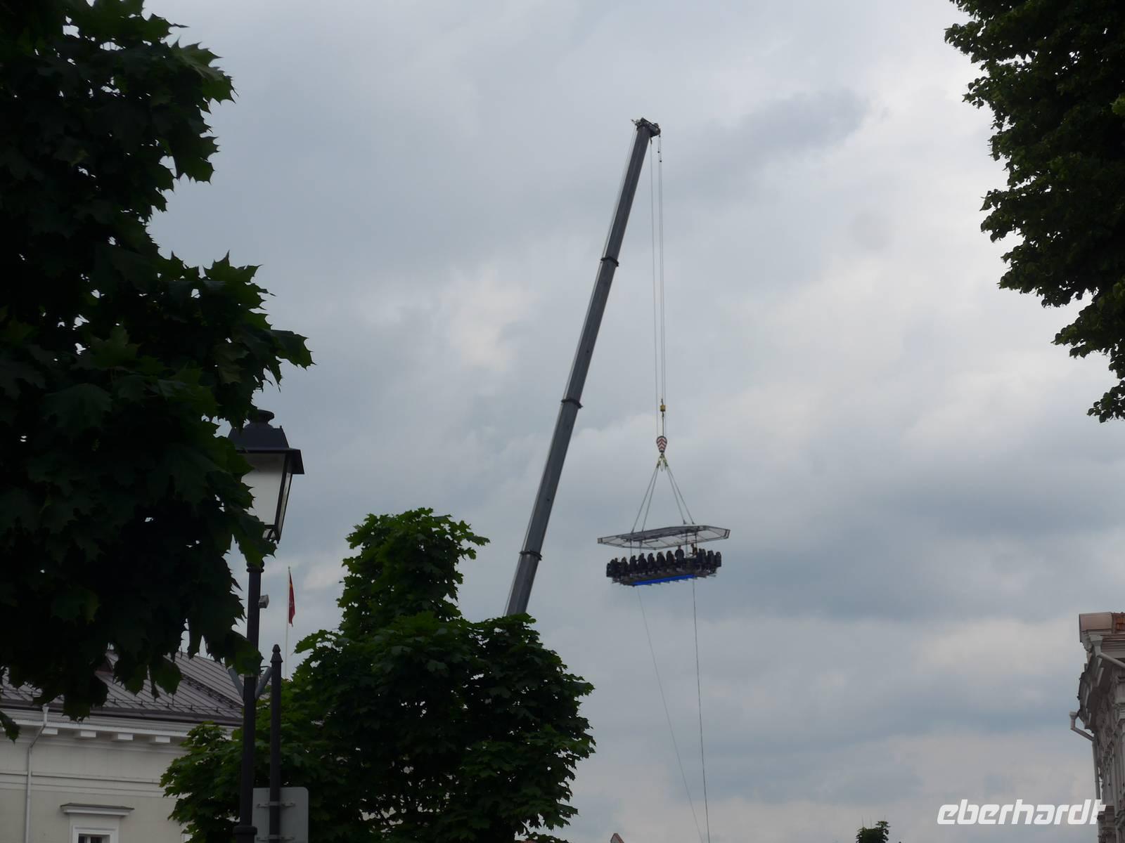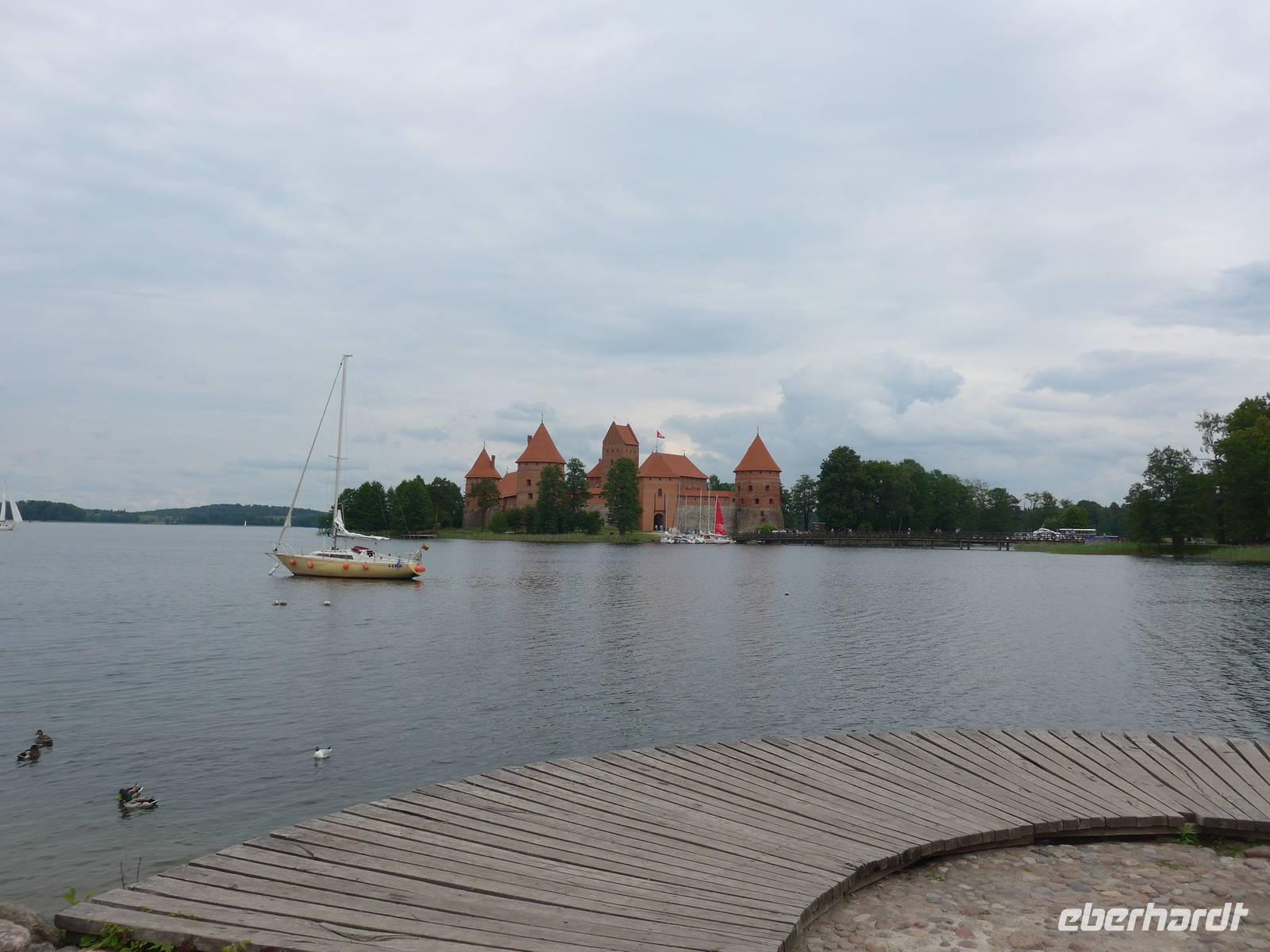 Ab 7 Uhr gab es immer Frühstück und 9 Uhr begannen unsere Ausflüge oder Besichtigungen. Heute fuhren wir mit dem Bus zur Kirche Peter und Paul. Die barocke Kirche ist mit ca. 2000 weiß schimmernden Stuckfiguren geschmückt und wurde im 17.Jahrhundert erbaut. Dann ging es hinauf zu einem Aussichtspunkt mit herrlichem Blick auf Vilnius und wir machten unser erstes Gruppenfoto. Am Tor der Morgenröthe verließen wir unseren Bus und spazierten in das alte Stadtzentrum hinein. Dort besichtigten wir zunächst die Heiliggeistkirche, die wichtigste orthodoxe Kirche Litauens und danach den oberen Teil der Burgstraße. Am Rathaus gab es eine neue Attraktion - Speisen im Restaurant am Kran in luftiger Höhe - zu bestaunen. Auf dem Rückweg zum Bus konnte die schwarze Madonna noch aus der Nähe betrachtet werden. Wir verließen Vilnius und fuhren mit dem Bus nach Trakai.