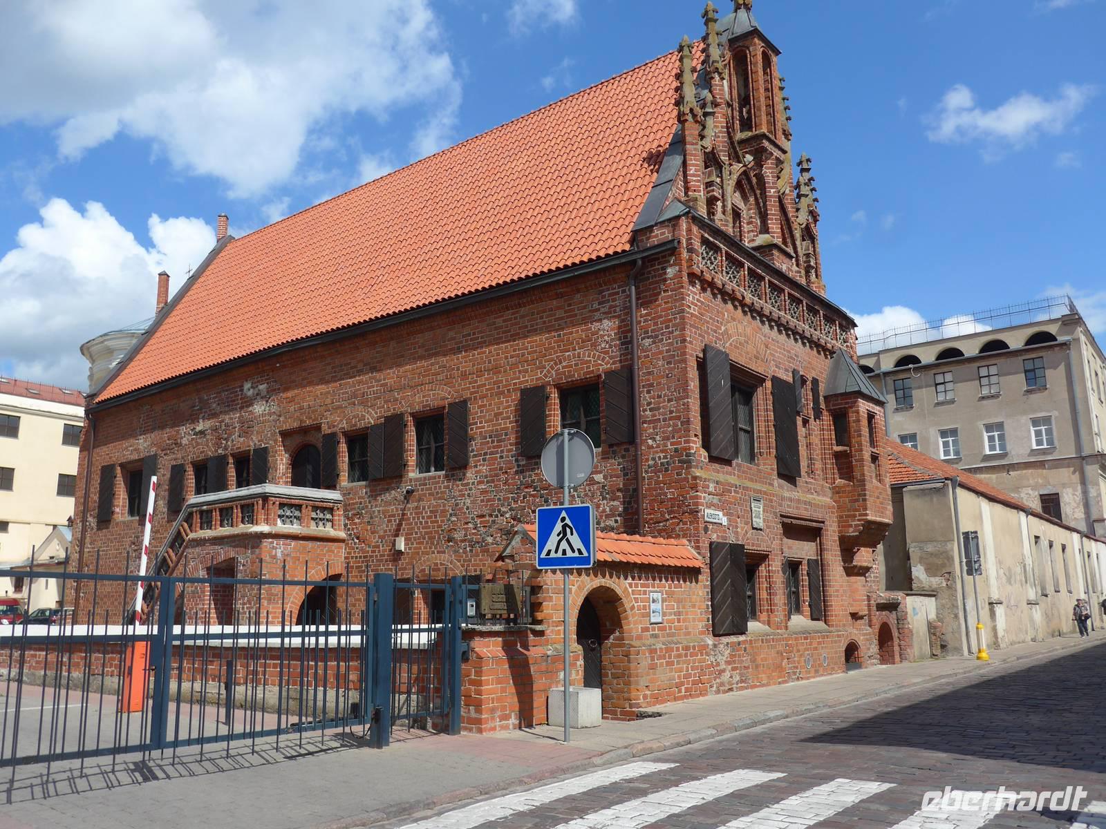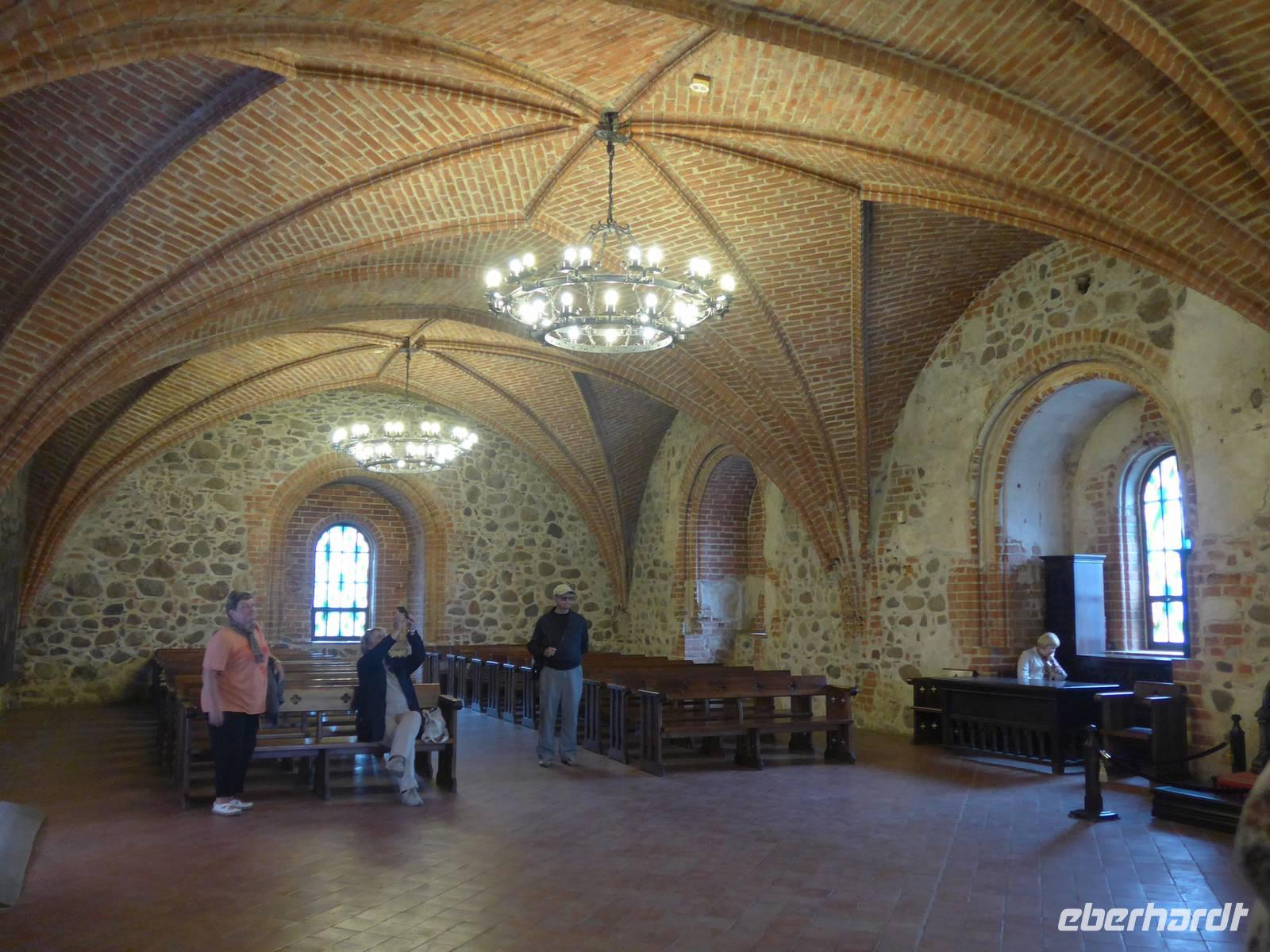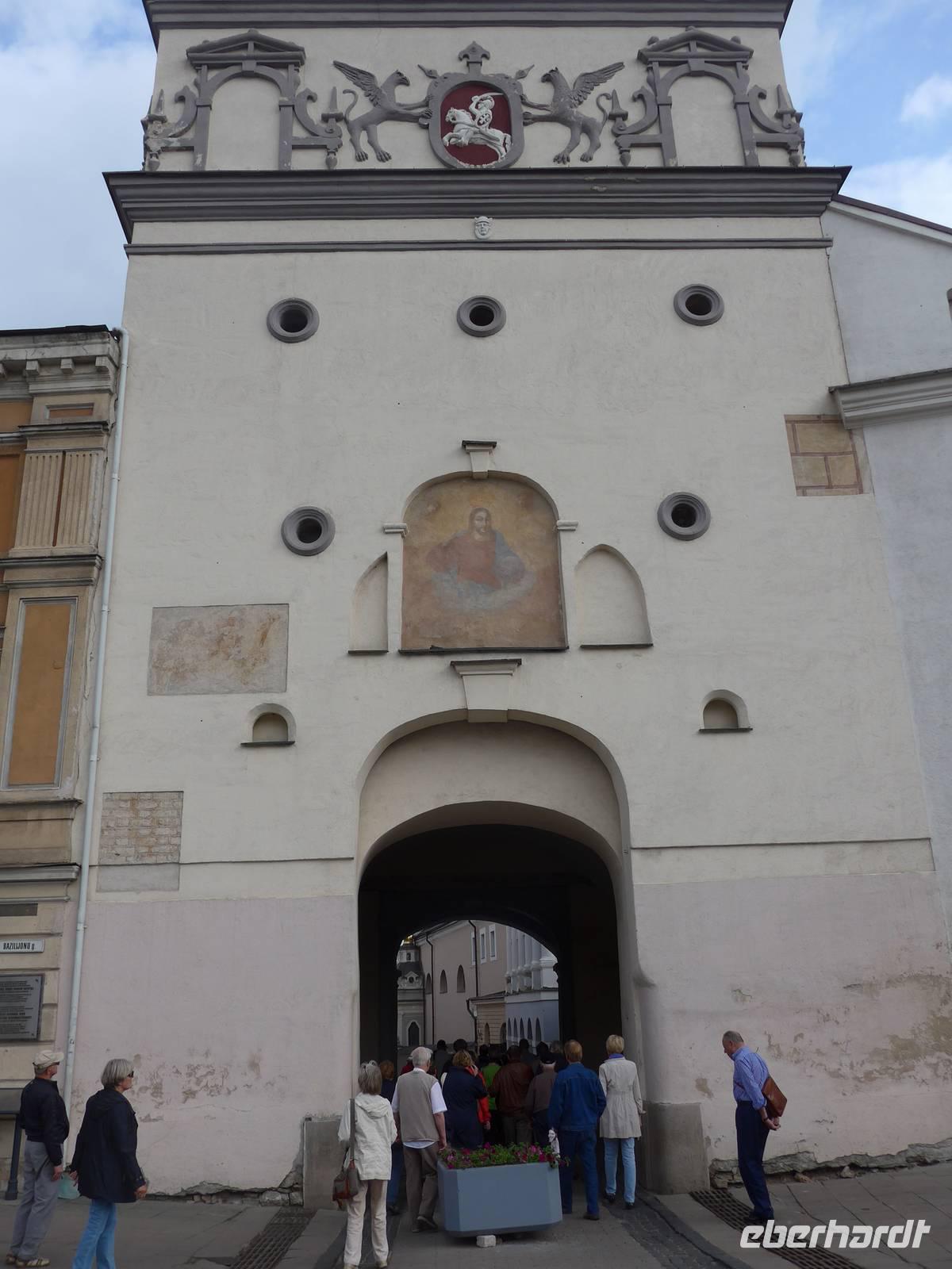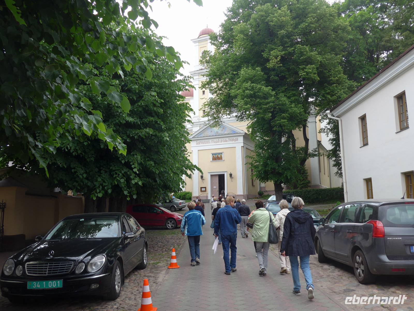 Ab 7 Uhr gab es immer Frühstück und 9 Uhr begannen unsere Ausflüge oder Besichtigungen. Heute fuhren wir mit dem Bus zur Kirche Peter und Paul. Die barocke Kirche ist mit ca. 2000 weiß schimmernden Stuckfiguren geschmückt und wurde im 17.Jahrhundert erbaut. Dann ging es hinauf zu einem Aussichtspunkt mit herrlichem Blick auf Vilnius und wir machten unser erstes Gruppenfoto. Am Tor der Morgenröthe verließen wir unseren Bus und spazierten in das alte Stadtzentrum hinein. Dort besichtigten wir zunächst die Heiliggeistkirche, die wichtigste orthodoxe Kirche Litauens und danach den oberen Teil der Burgstraße. Am Rathaus gab es eine neue Attraktion - Speisen im Restaurant am Kran in luftiger Höhe - zu bestaunen. Auf dem Rückweg zum Bus konnte die schwarze Madonna noch aus der Nähe betrachtet werden. Wir verließen Vilnius und fuhren mit dem Bus nach Trakai.