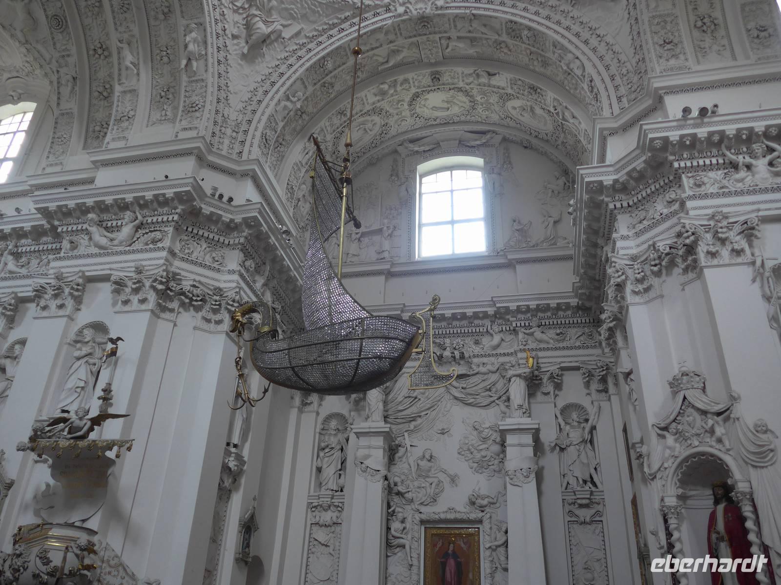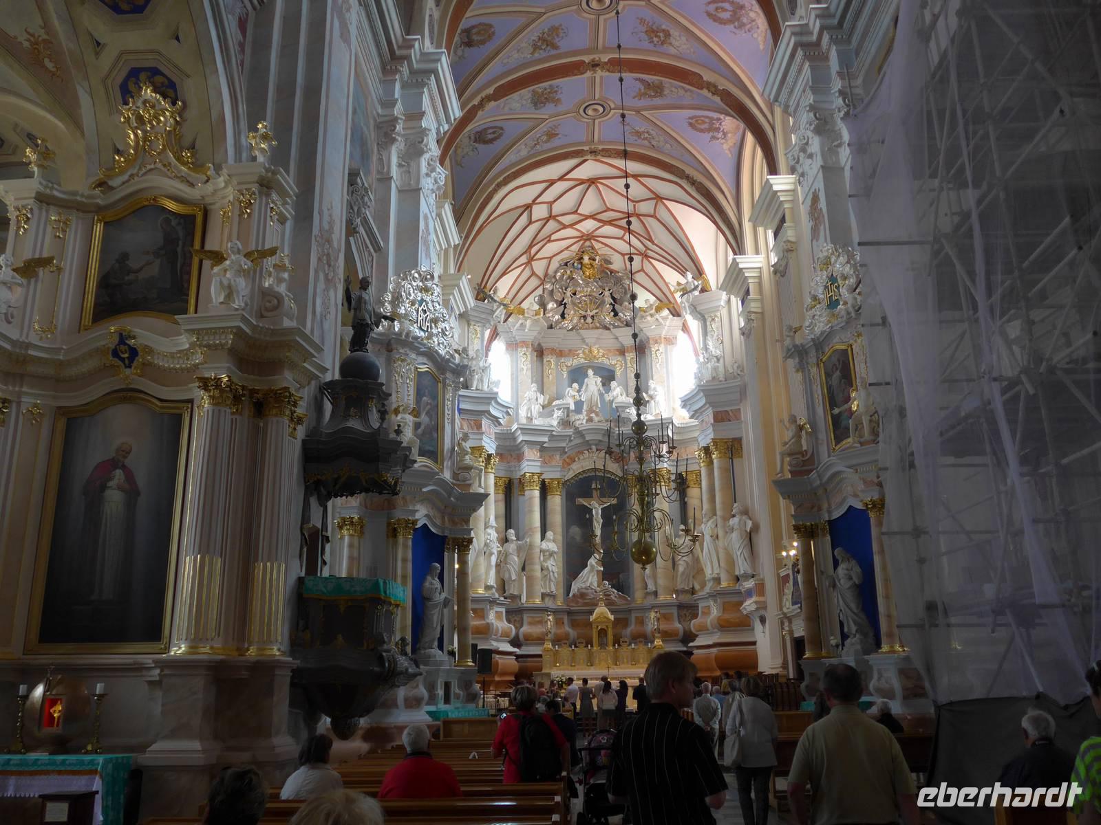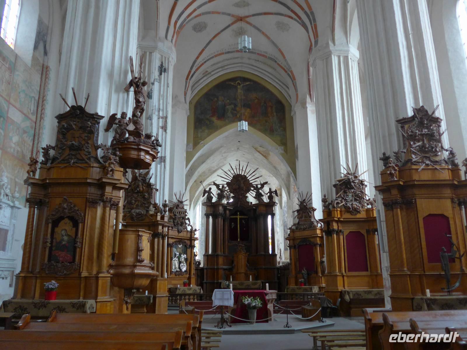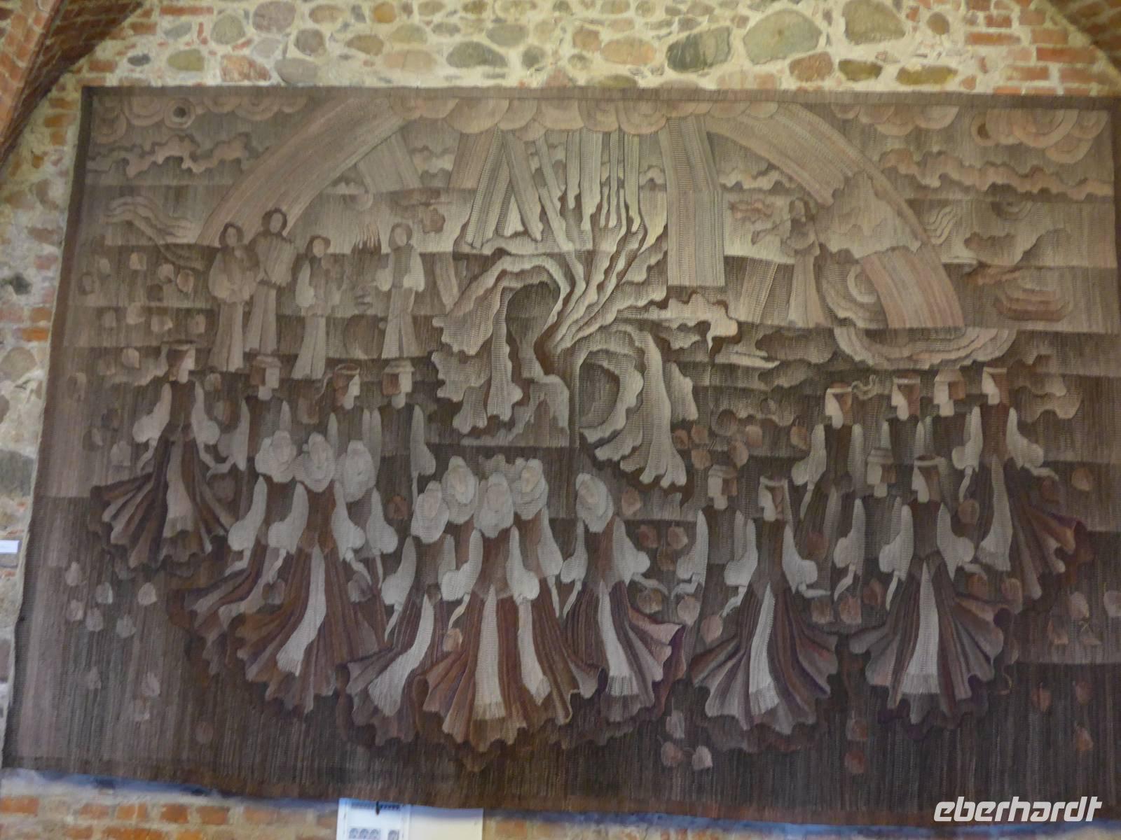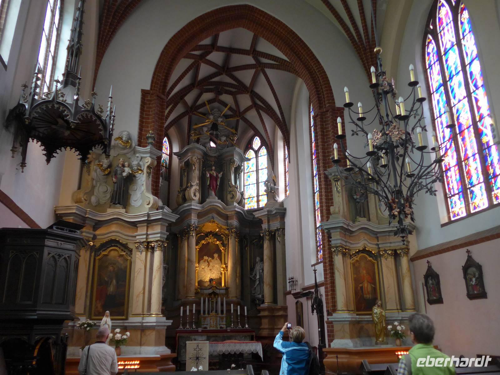 Ab 7 Uhr gab es immer Frühstück und 9 Uhr begannen unsere Ausflüge oder Besichtigungen. Heute fuhren wir mit dem Bus zur Kirche Peter und Paul. Die barocke Kirche ist mit ca. 2000 weiß schimmernden Stuckfiguren geschmückt und wurde im 17.Jahrhundert erbaut. Dann ging es hinauf zu einem Aussichtspunkt mit herrlichem Blick auf Vilnius und wir machten unser erstes Gruppenfoto. Am Tor der Morgenröthe verließen wir unseren Bus und spazierten in das alte Stadtzentrum hinein. Dort besichtigten wir zunächst die Heiliggeistkirche, die wichtigste orthodoxe Kirche Litauens und danach den oberen Teil der Burgstraße. Am Rathaus gab es eine neue Attraktion - Speisen im Restaurant am Kran in luftiger Höhe - zu bestaunen. Auf dem Rückweg zum Bus konnte die schwarze Madonna noch aus der Nähe betrachtet werden. Wir verließen Vilnius und fuhren mit dem Bus nach Trakai.