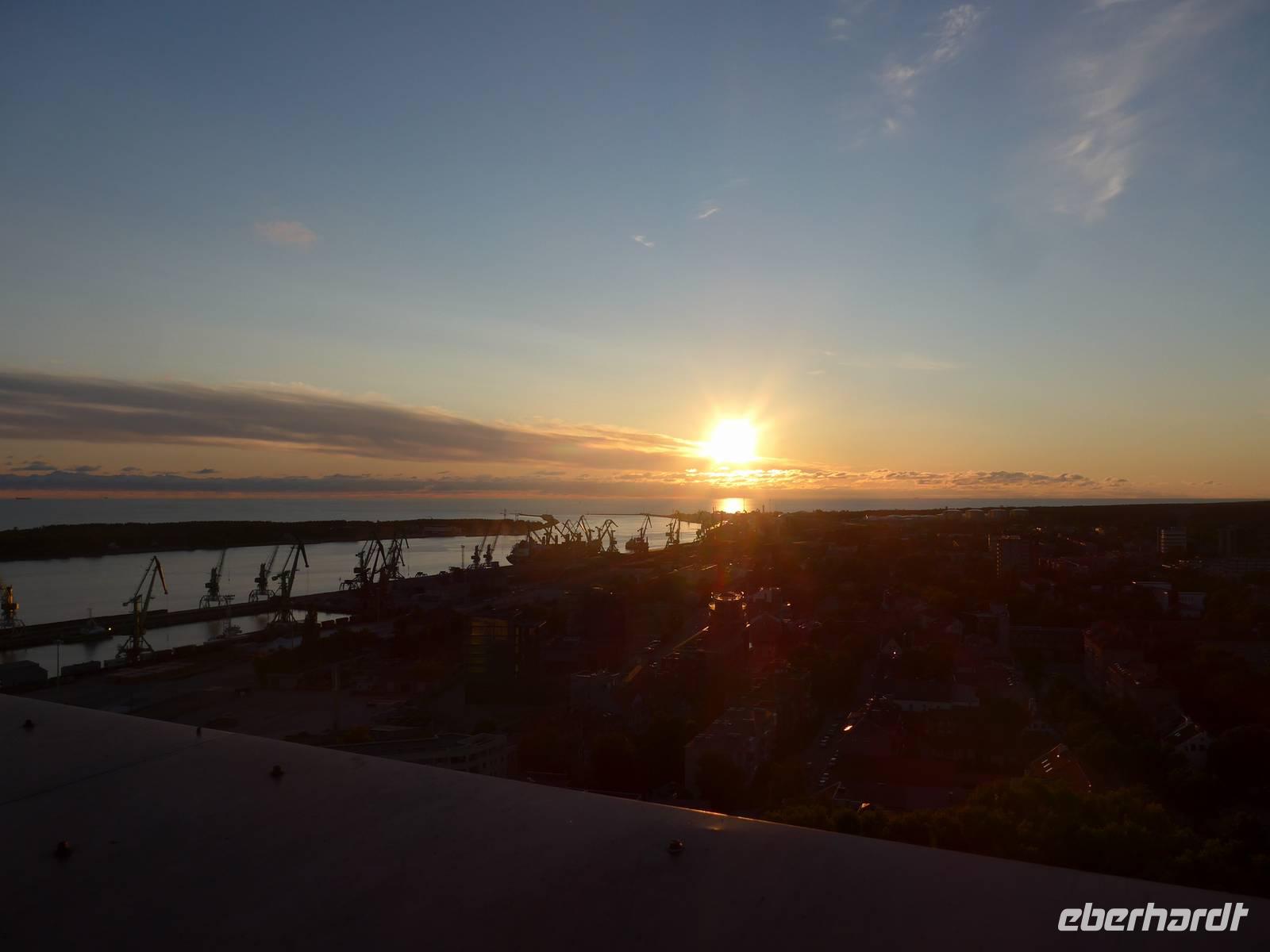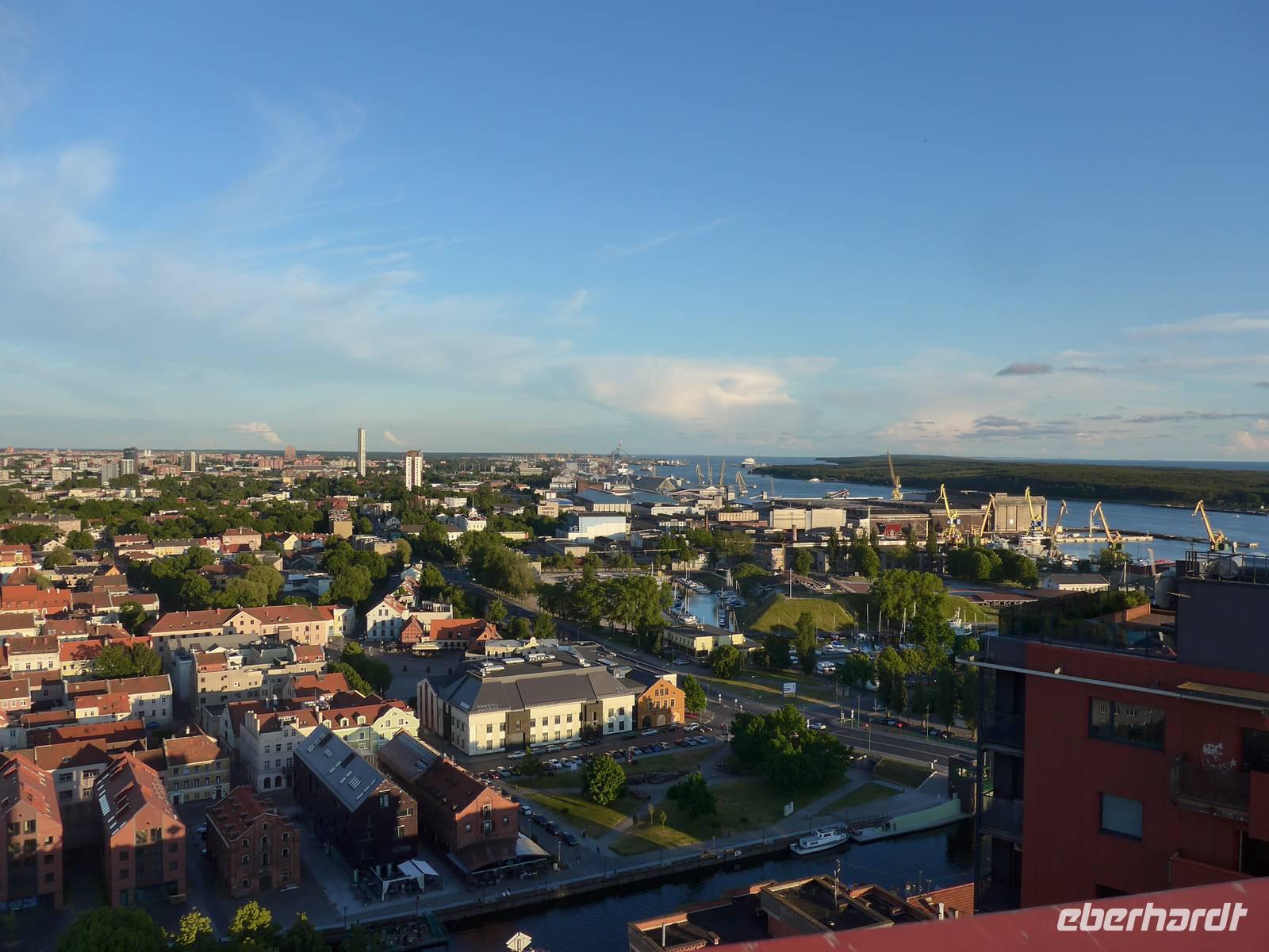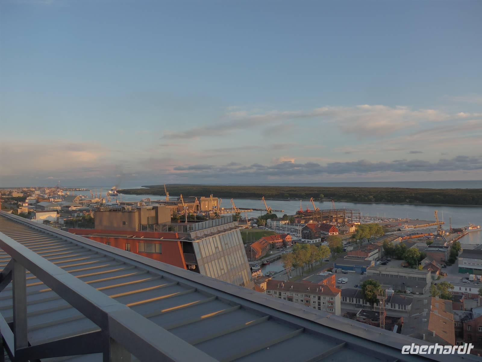 Nach dem Abendessen im Hotel fuhren wir in den 21.Stock hinauf und genossen in der Abendsonne den Blick über das Haff auf die Kurische Nehrung und die Ostsee.