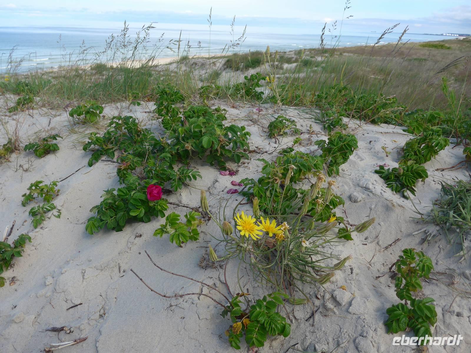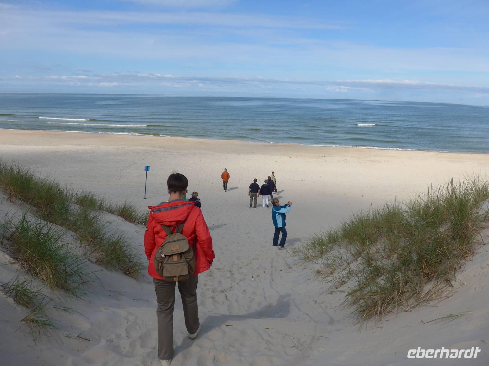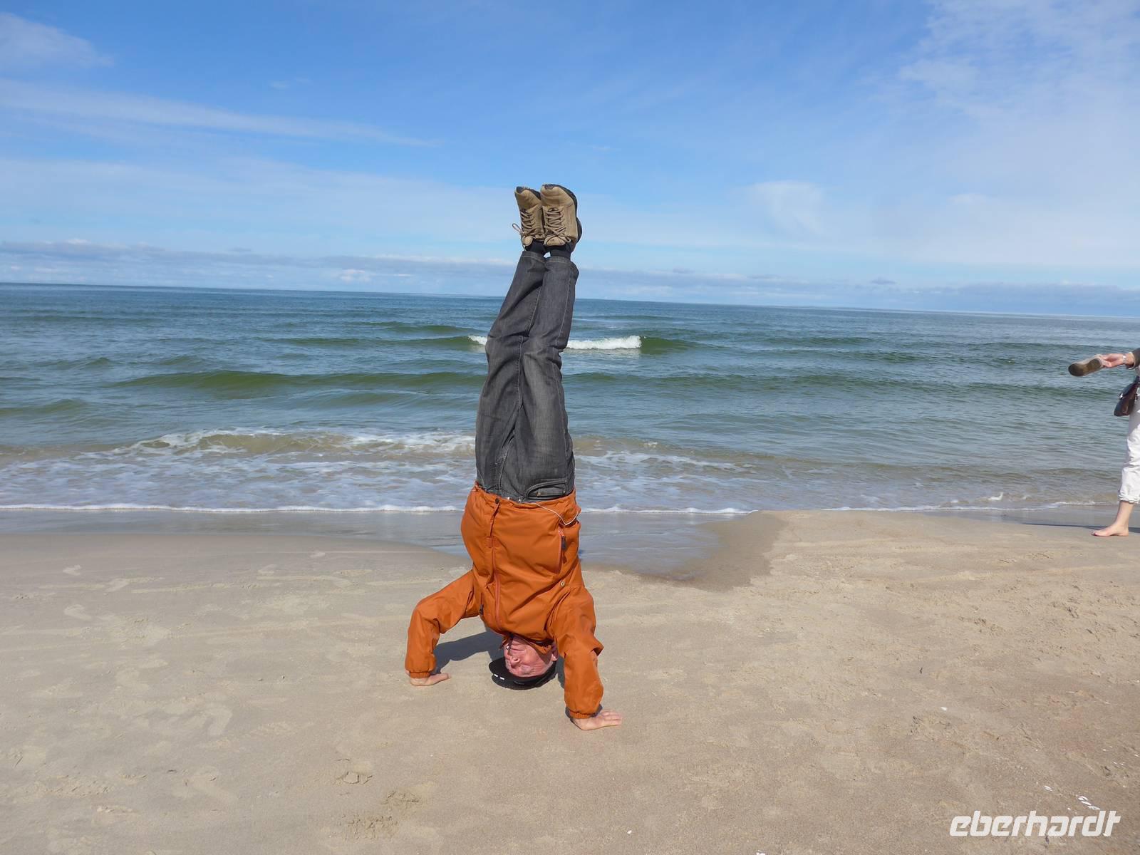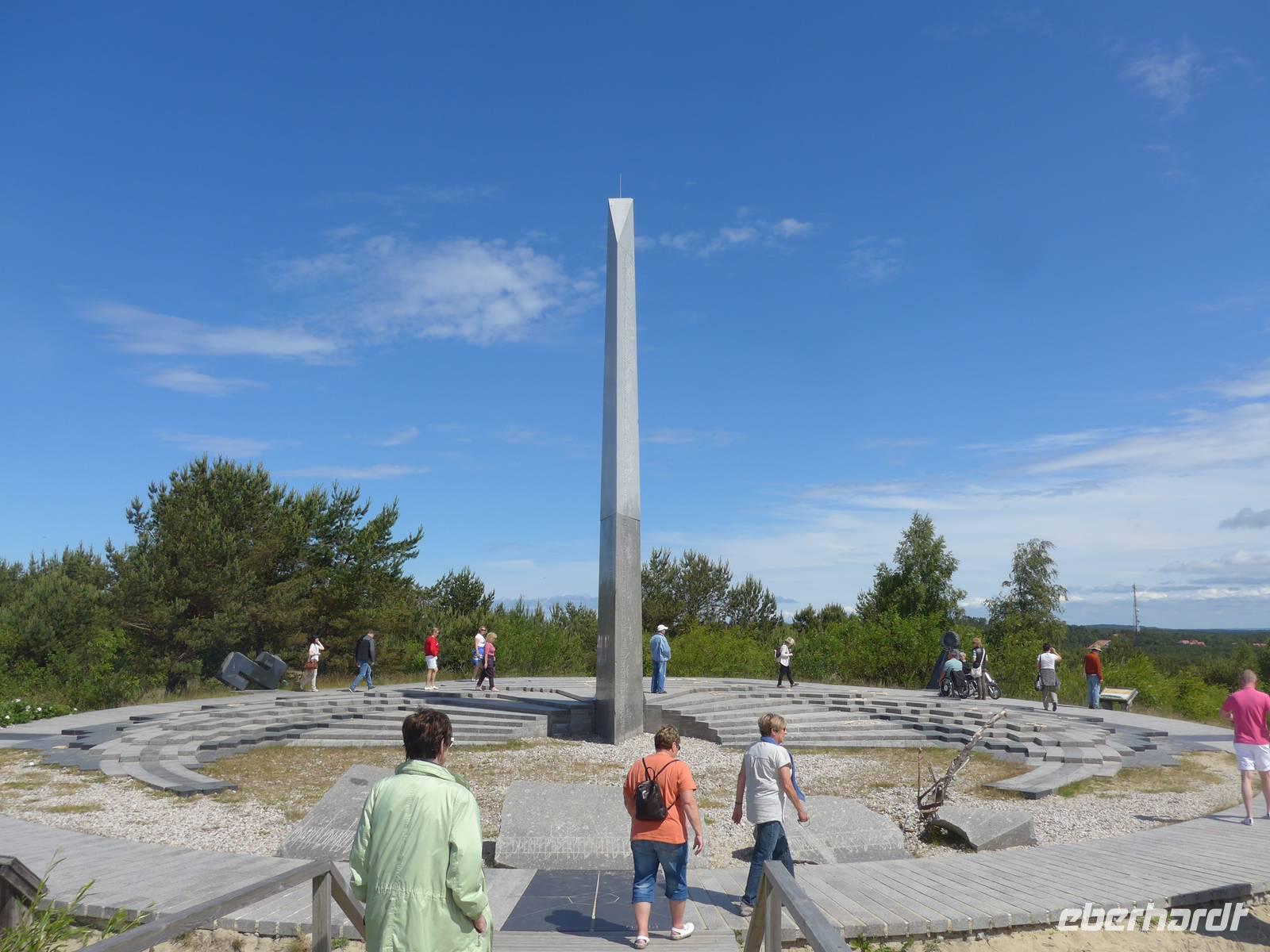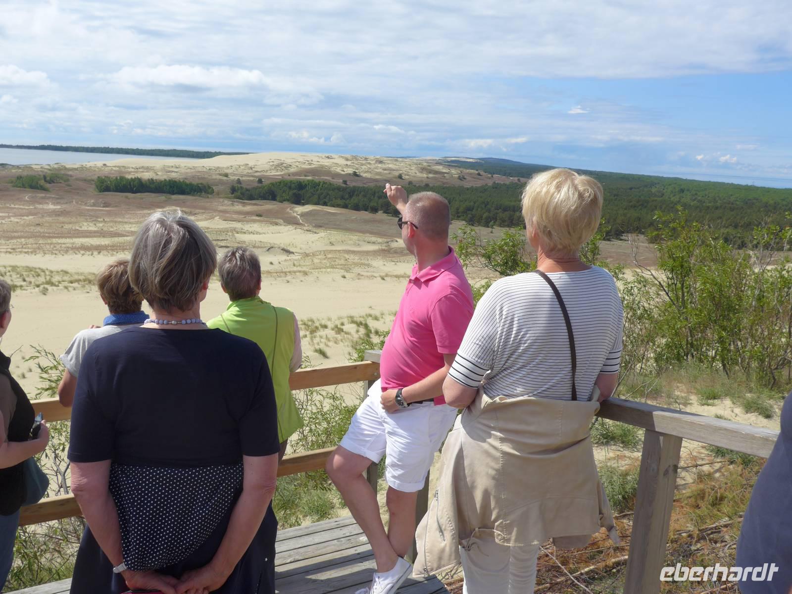 Roland erschien nach dem Frühstück in kurzer Hose und versprach uns Sonne und einen unvergeßlichen Ausflug auf die Nehrung. An der Fähre trafen wir den Rollstuhlbus von Eberhardt und gemeinsam fuhren wir mit der aus Bulgarien stammenden Fähre über das HAFF auf die Kurische Nehrung. Nach kurzer Fahrt stoppte unser Bus an einer Düne und wir gingen die steilen Stufen hinauf und sahen die Ostsee. Freudig wie Kinder liefen wir hinunter zum Strand und Jo machte einen Kopfstand. Barfuß gingen wir durch den feinen Sand und in die Ostsee. Die 50 km lange Straße auf Litauischen Boden ist mautpflichtig und man darf nur an ausgewiesenen Plätzen parken. Wir erfuhren viel über die Landschaft, die Probleme mit den Komoranen und vor Nidden hörten wir das Gedicht "Die Frauen von Nidden" im Originalton gesprochen von Agnes Miegel. Das stimmte uns eindrucksvoll auf den Besuch der 48 m hohen Düne ein. Dort trafen wir die Rollstuhlfahrer wieder, schauten hinüber nach Rußland zur Epha-Düne und bestaunten die große Sonnenuhr. Im Urlaubsort Nidden machten wir gemeinsam einen Rundgang, aßen lecker zu Mittag und besuchten danach das Bernsteinmuseum.