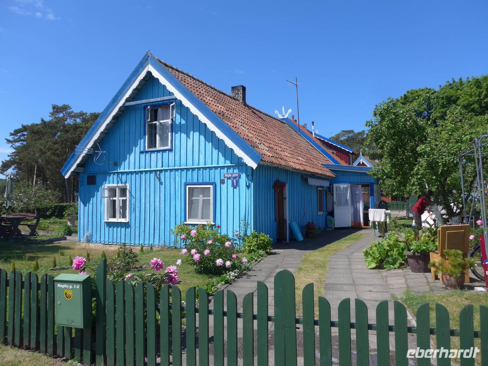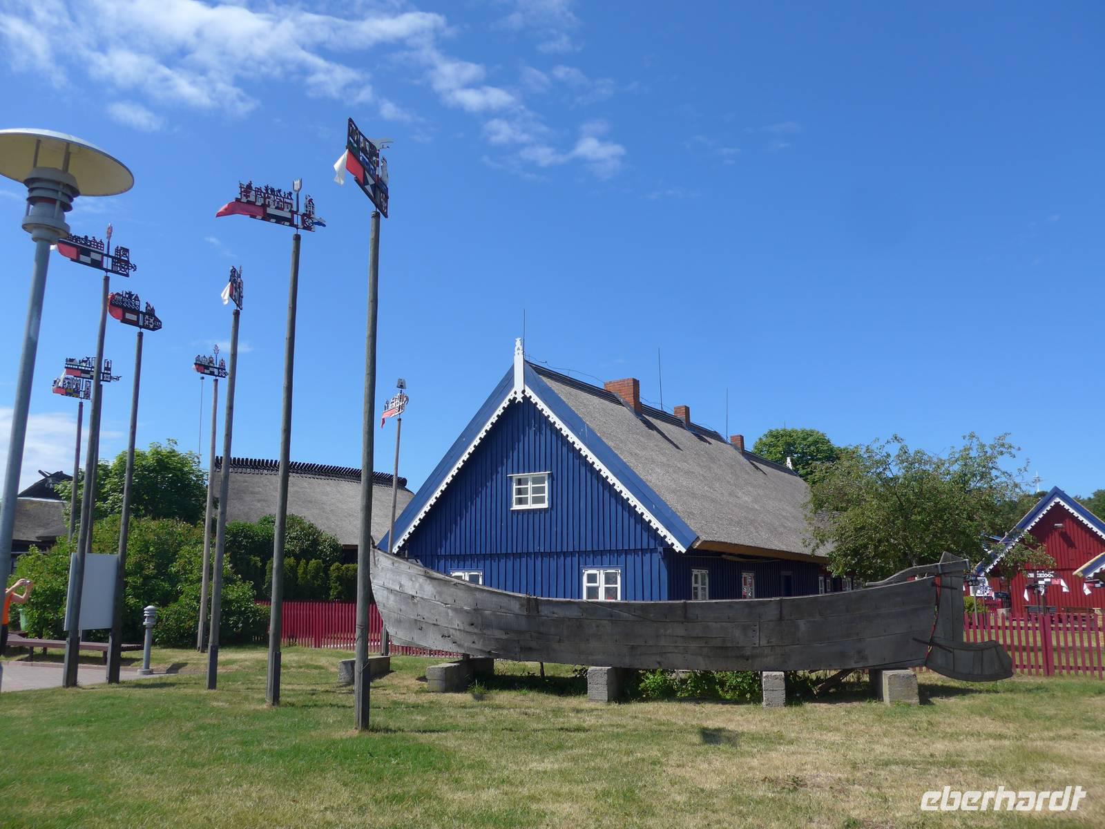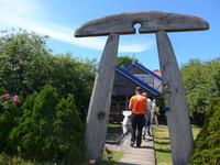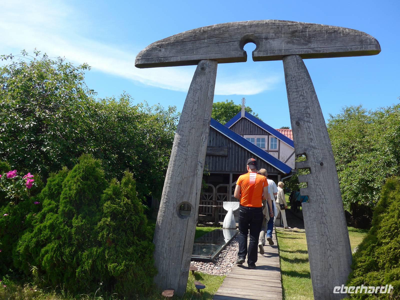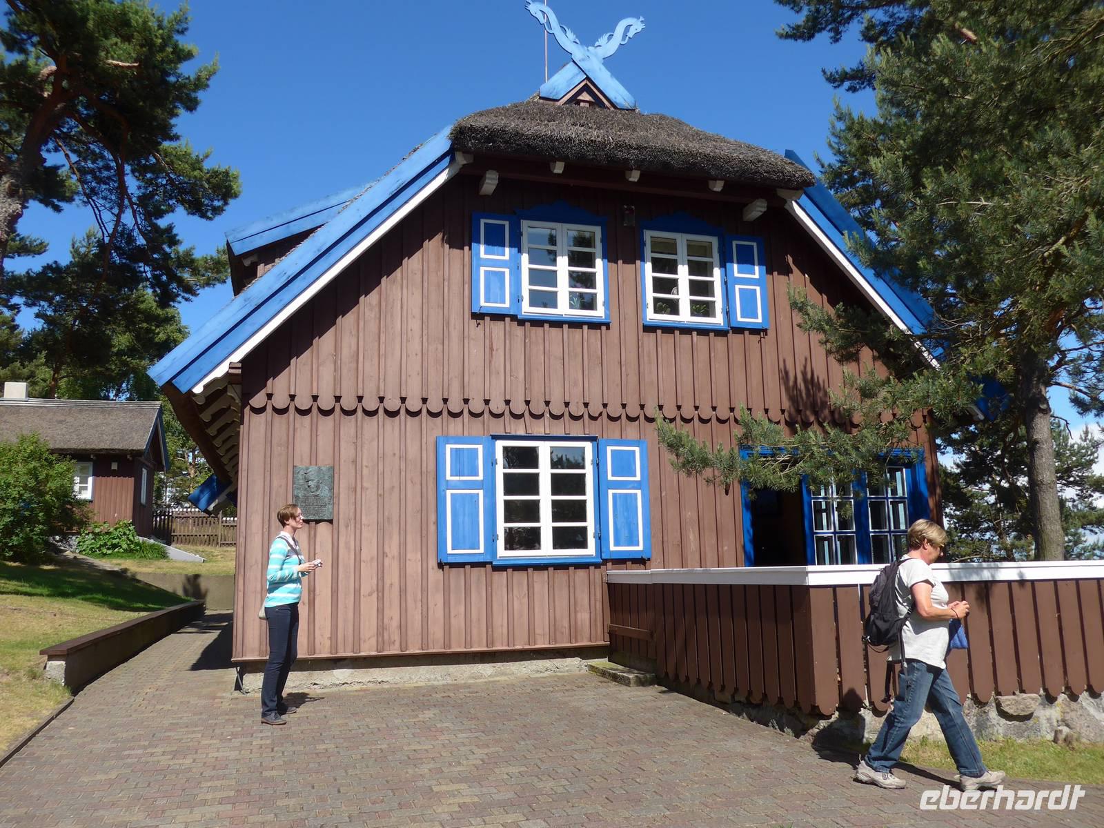 Im Museum sahen wir seltene Bernsteinstücke mit verschiedenen Einschlüssen und staunten über die Farbenvielfalt. Auch durfte jeder 7 Tropfen vom seltenen Bernsteinschnaps probieren. Weiter ging es zur Kirche von Nidden, über den Friedhof und zum Parkplatz. In einem Souvenirgeschäft erklärte man uns das "Geheimnis" der Fahnen von der Nehrung und danach besuchten wir noch das Thomas-Mann-Haus. Das sonnige und warme Wetter lud zu einem Strandaufenthalt ein und 5 Gäste unserer Gruppe wagten ein Bad in der Ostsee. Auf der Rückfahrt hielten wir in Schwarzort und erkundeten den Hexenberg mit seinen in Holz geschnitzten Märchen- und Fabelwesen. Es war eine wunderschöne, abendliche Wanderung durch den Wald und ein würdiger Abschluß dieses erlebnisreichen Sonntages.