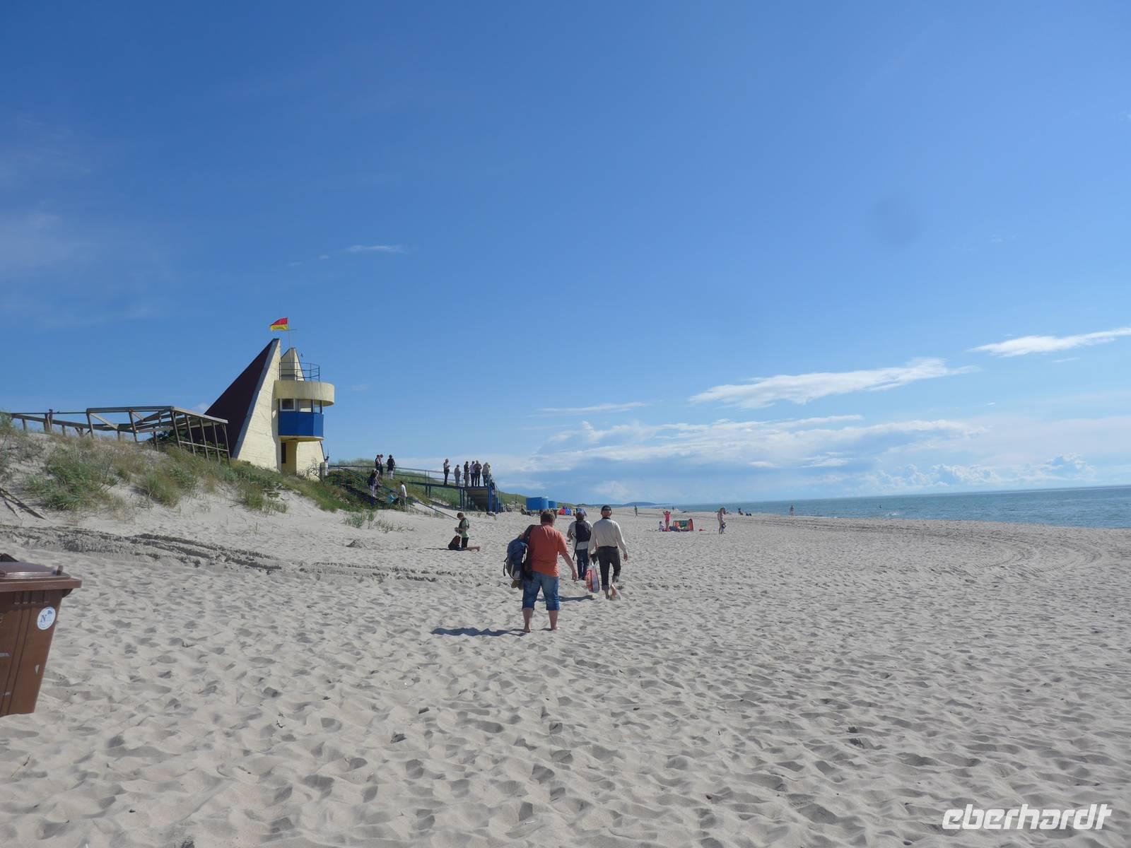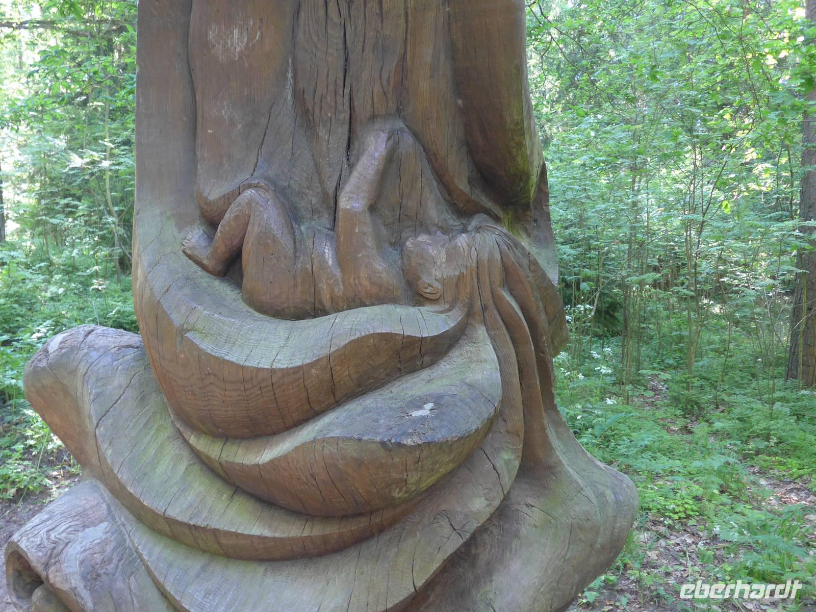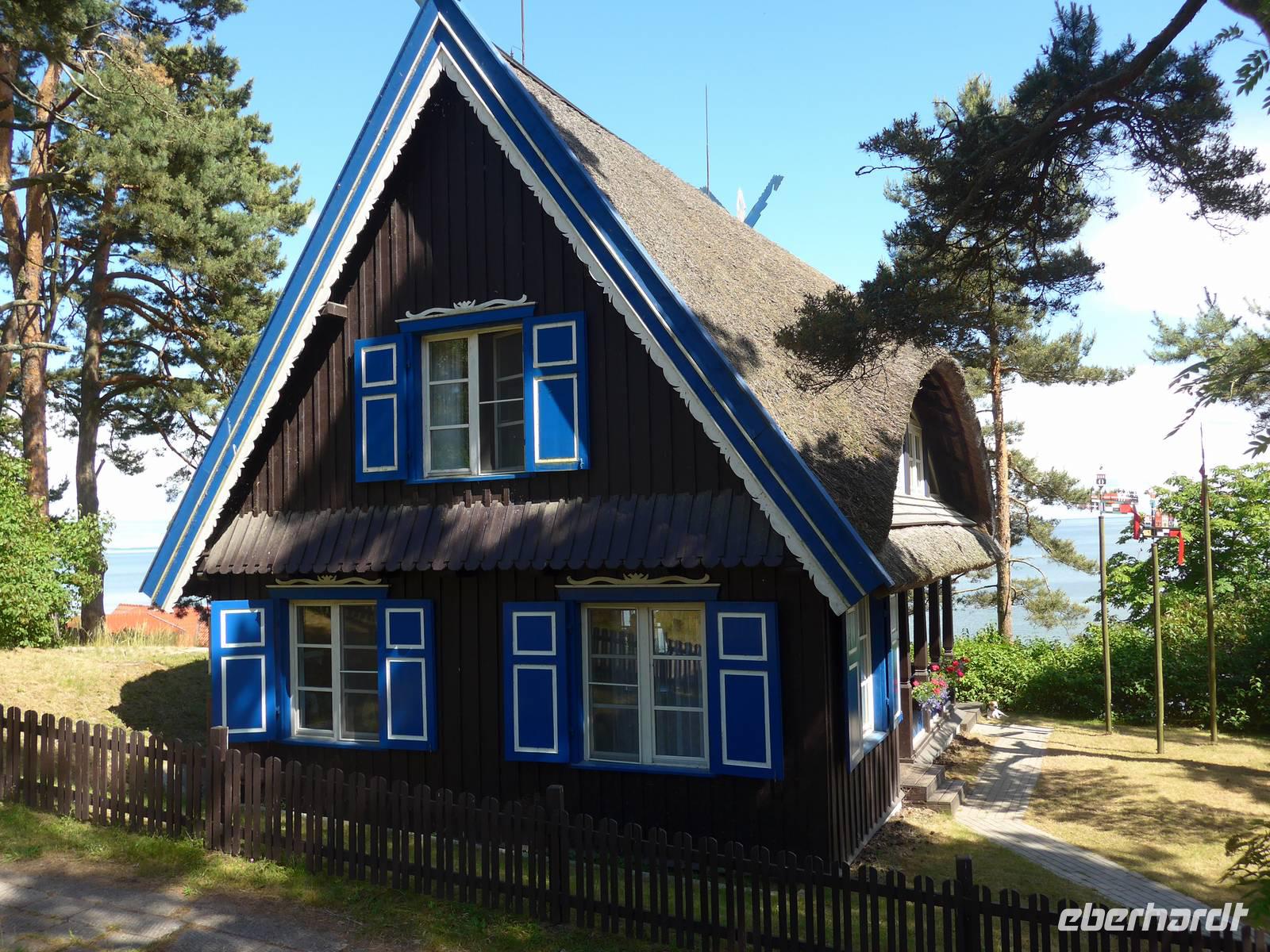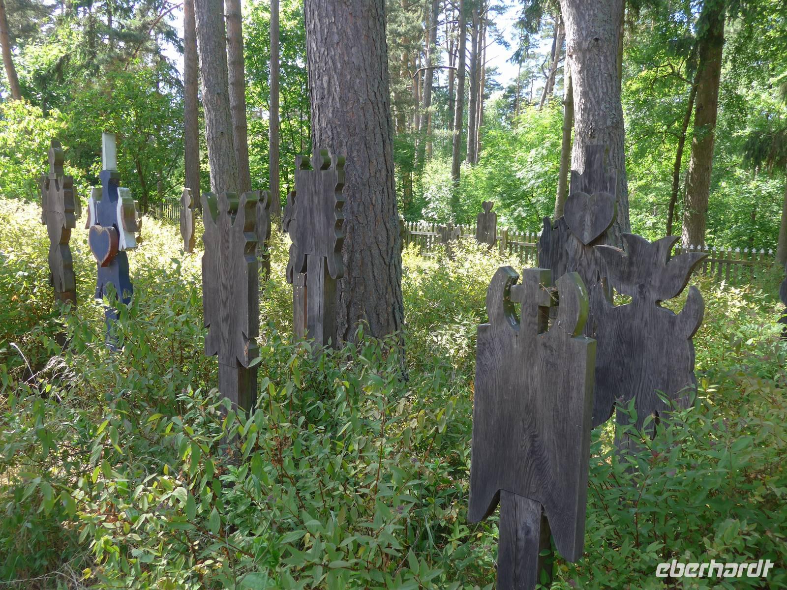 Im Museum sahen wir seltene Bernsteinstücke mit verschiedenen Einschlüssen und staunten über die Farbenvielfalt. Auch durfte jeder 7 Tropfen vom seltenen Bernsteinschnaps probieren. Weiter ging es zur Kirche von Nidden, über den Friedhof und zum Parkplatz. In einem Souvenirgeschäft erklärte man uns das "Geheimnis" der Fahnen von der Nehrung und danach besuchten wir noch das Thomas-Mann-Haus. Das sonnige und warme Wetter lud zu einem Strandaufenthalt ein und 5 Gäste unserer Gruppe wagten ein Bad in der Ostsee. Auf der Rückfahrt hielten wir in Schwarzort und erkundeten den Hexenberg mit seinen in Holz geschnitzten Märchen- und Fabelwesen. Es war eine wunderschöne, abendliche Wanderung durch den Wald und ein würdiger Abschluß dieses erlebnisreichen Sonntages.