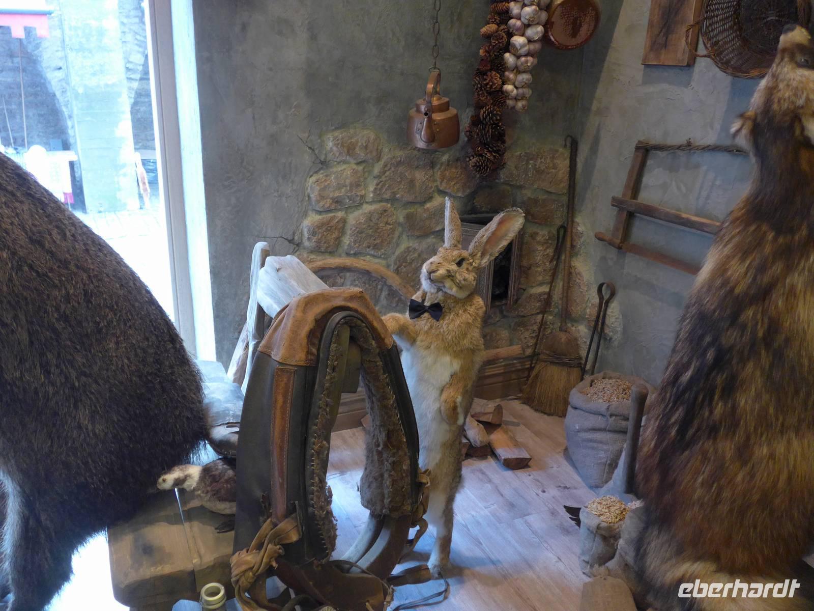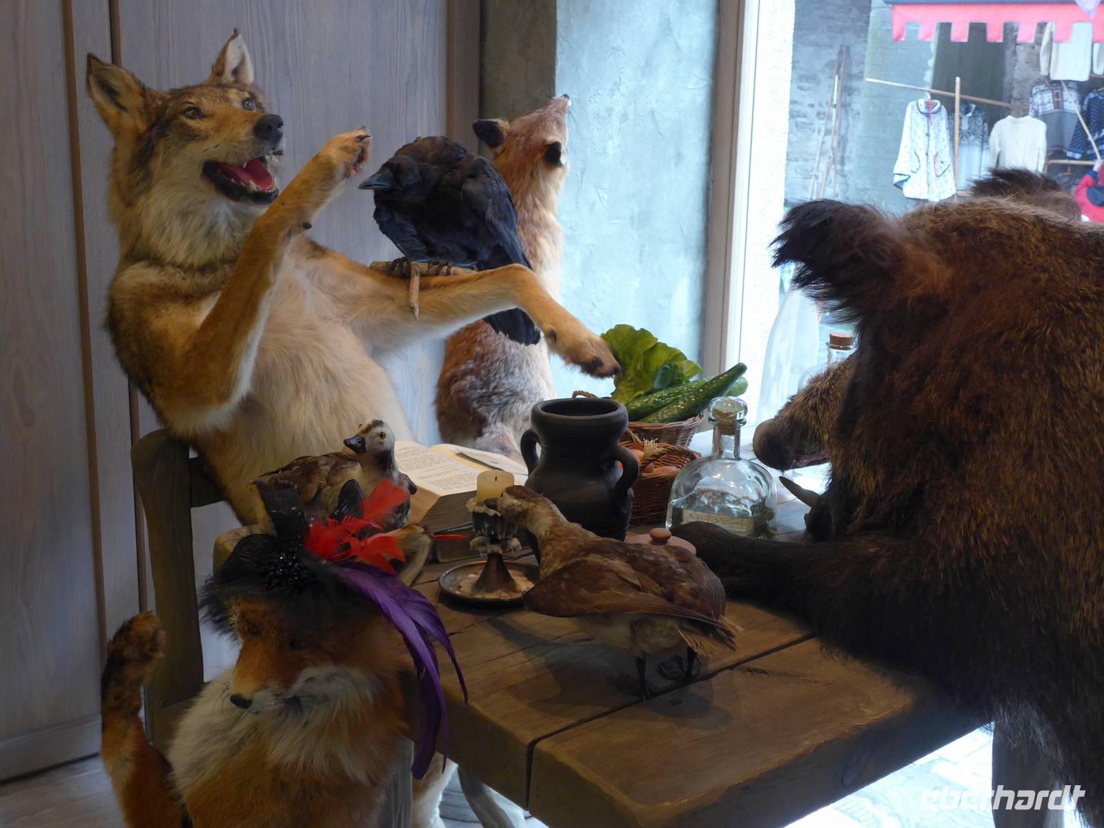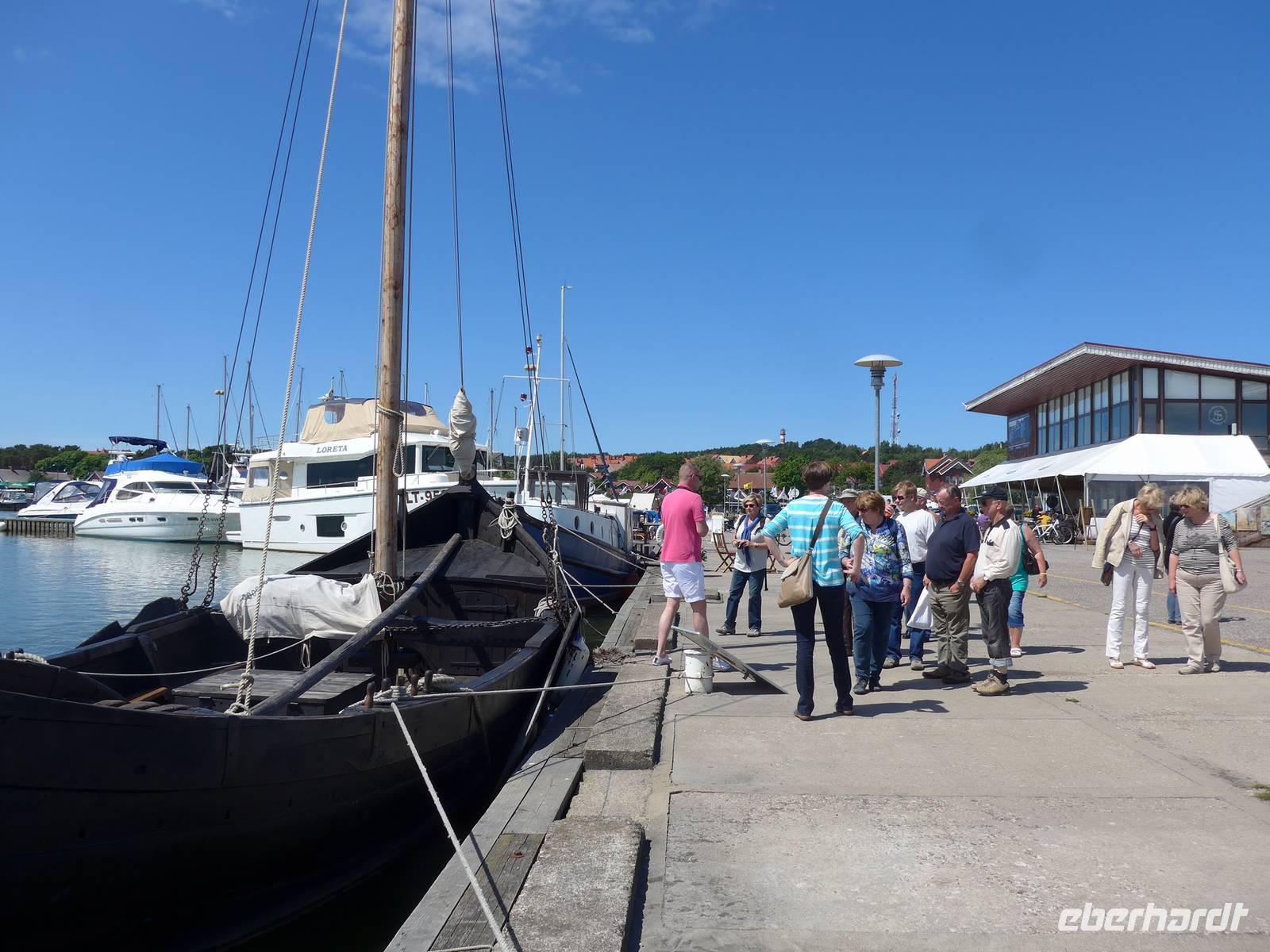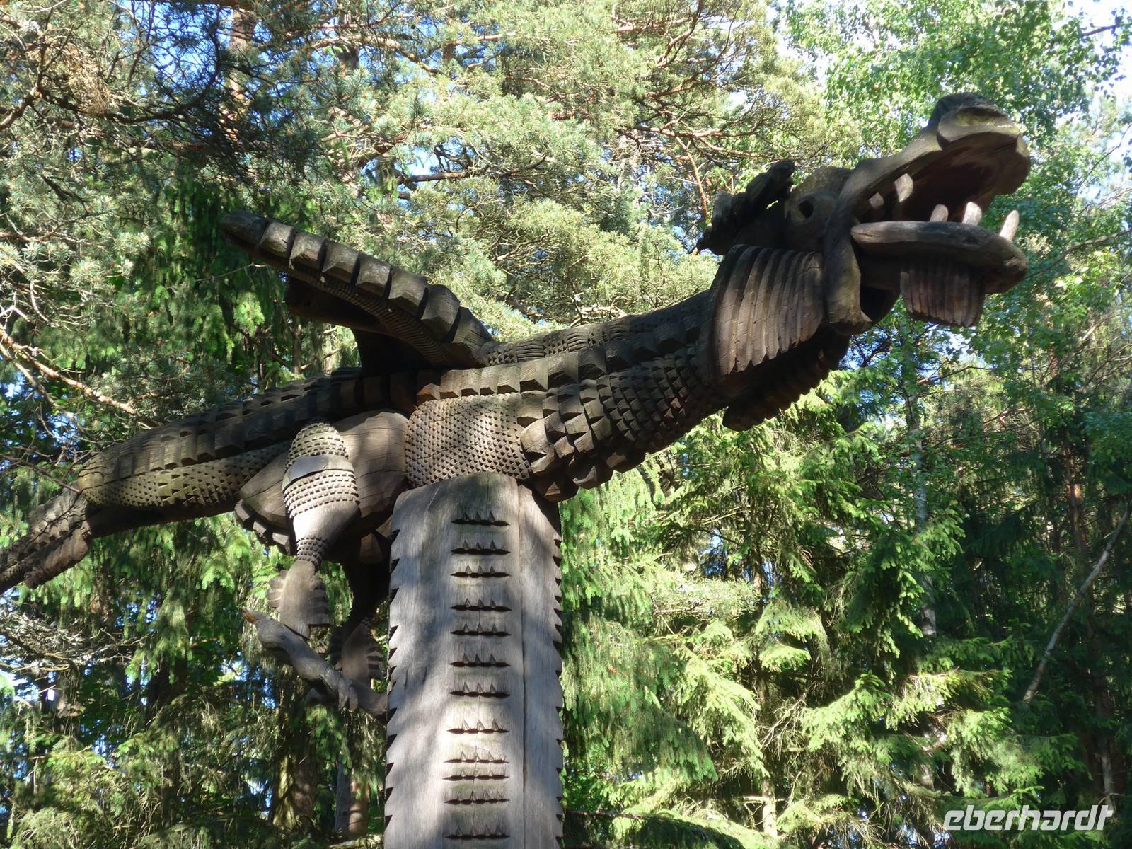 Im Museum sahen wir seltene Bernsteinstücke mit verschiedenen Einschlüssen und staunten über die Farbenvielfalt. Auch durfte jeder 7 Tropfen vom seltenen Bernsteinschnaps probieren. Weiter ging es zur Kirche von Nidden, über den Friedhof und zum Parkplatz. In einem Souvenirgeschäft erklärte man uns das "Geheimnis" der Fahnen von der Nehrung und danach besuchten wir noch das Thomas-Mann-Haus. Das sonnige und warme Wetter lud zu einem Strandaufenthalt ein und 5 Gäste unserer Gruppe wagten ein Bad in der Ostsee. Auf der Rückfahrt hielten wir in Schwarzort und erkundeten den Hexenberg mit seinen in Holz geschnitzten Märchen- und Fabelwesen. Es war eine wunderschöne, abendliche Wanderung durch den Wald und ein würdiger Abschluß dieses erlebnisreichen Sonntages.