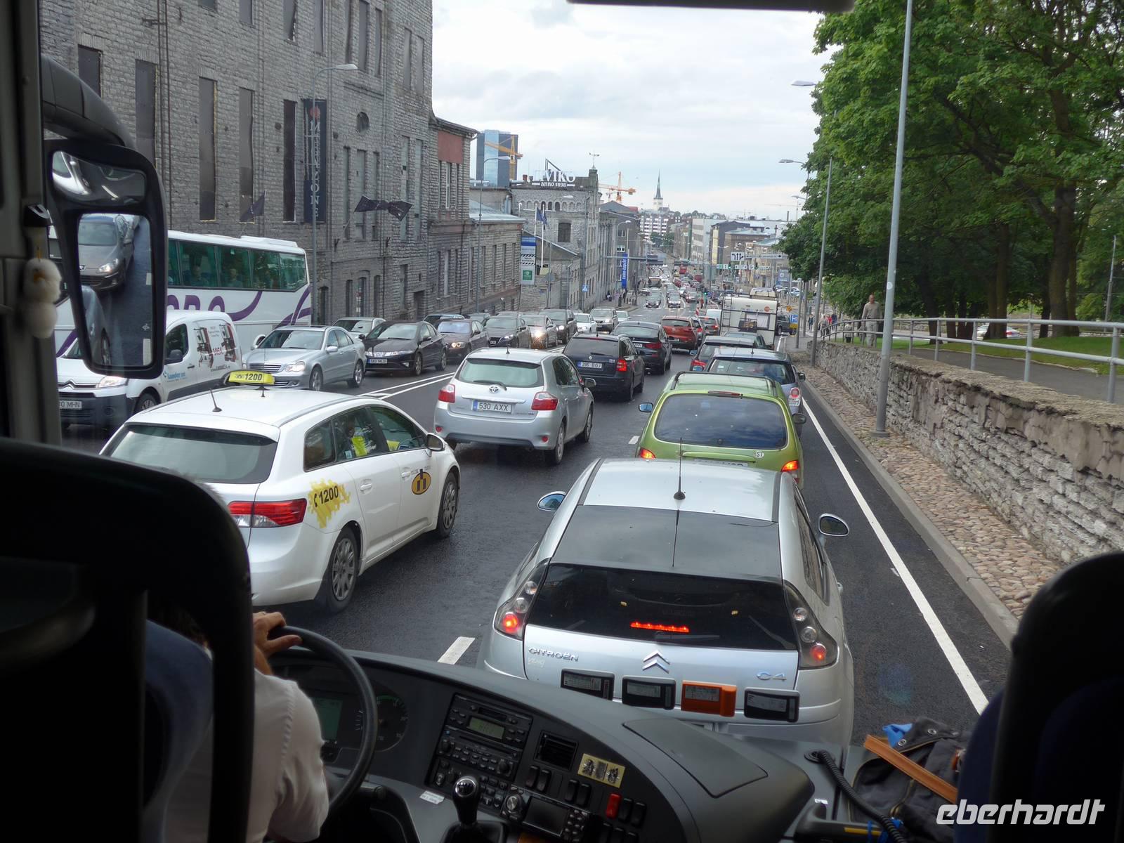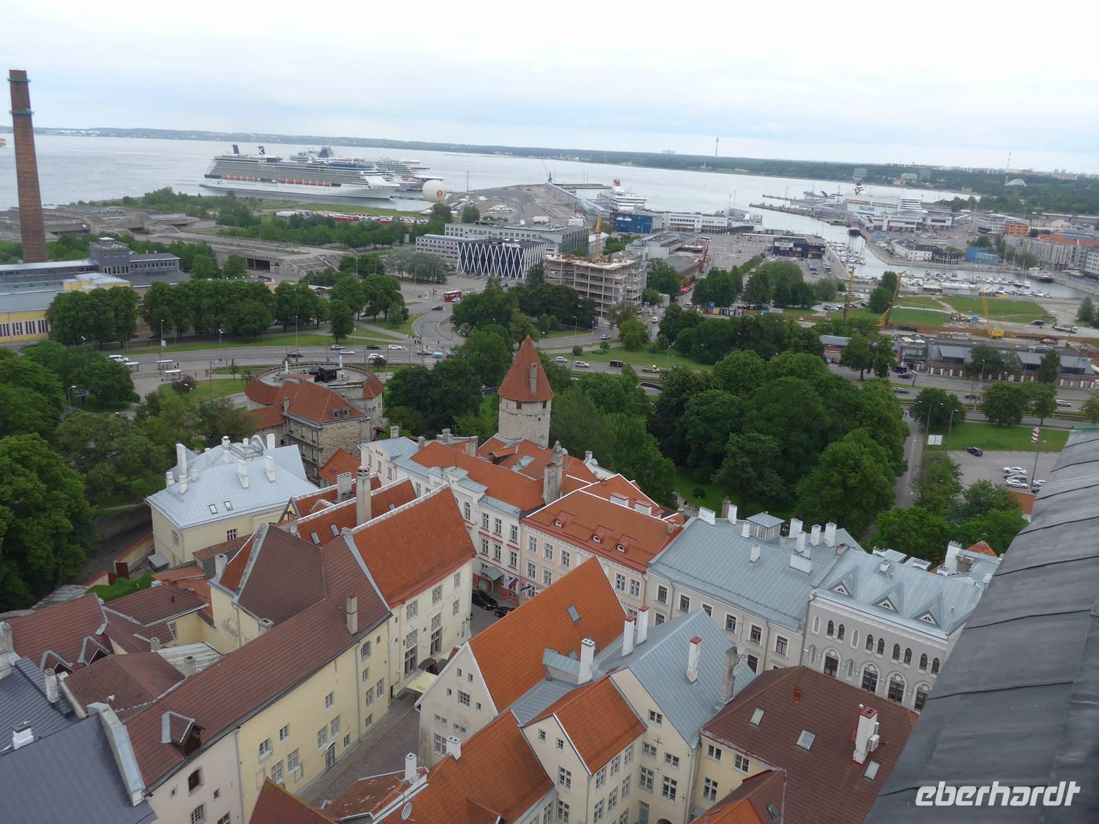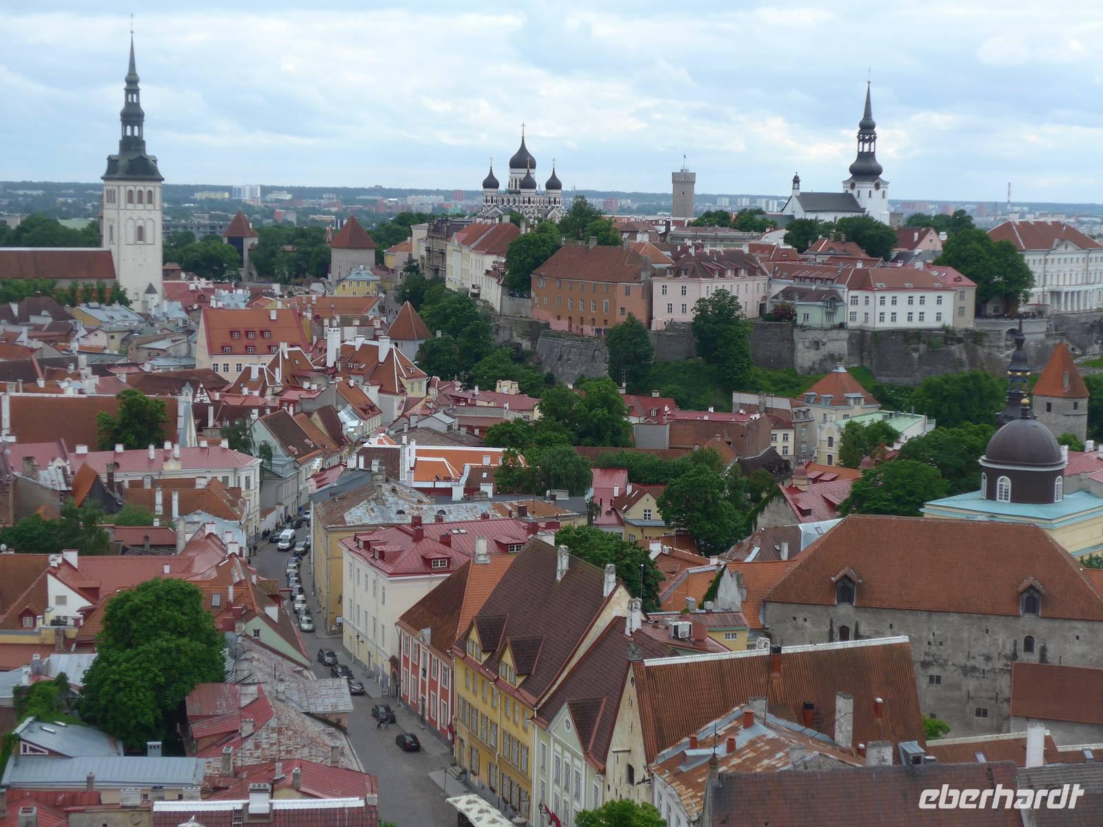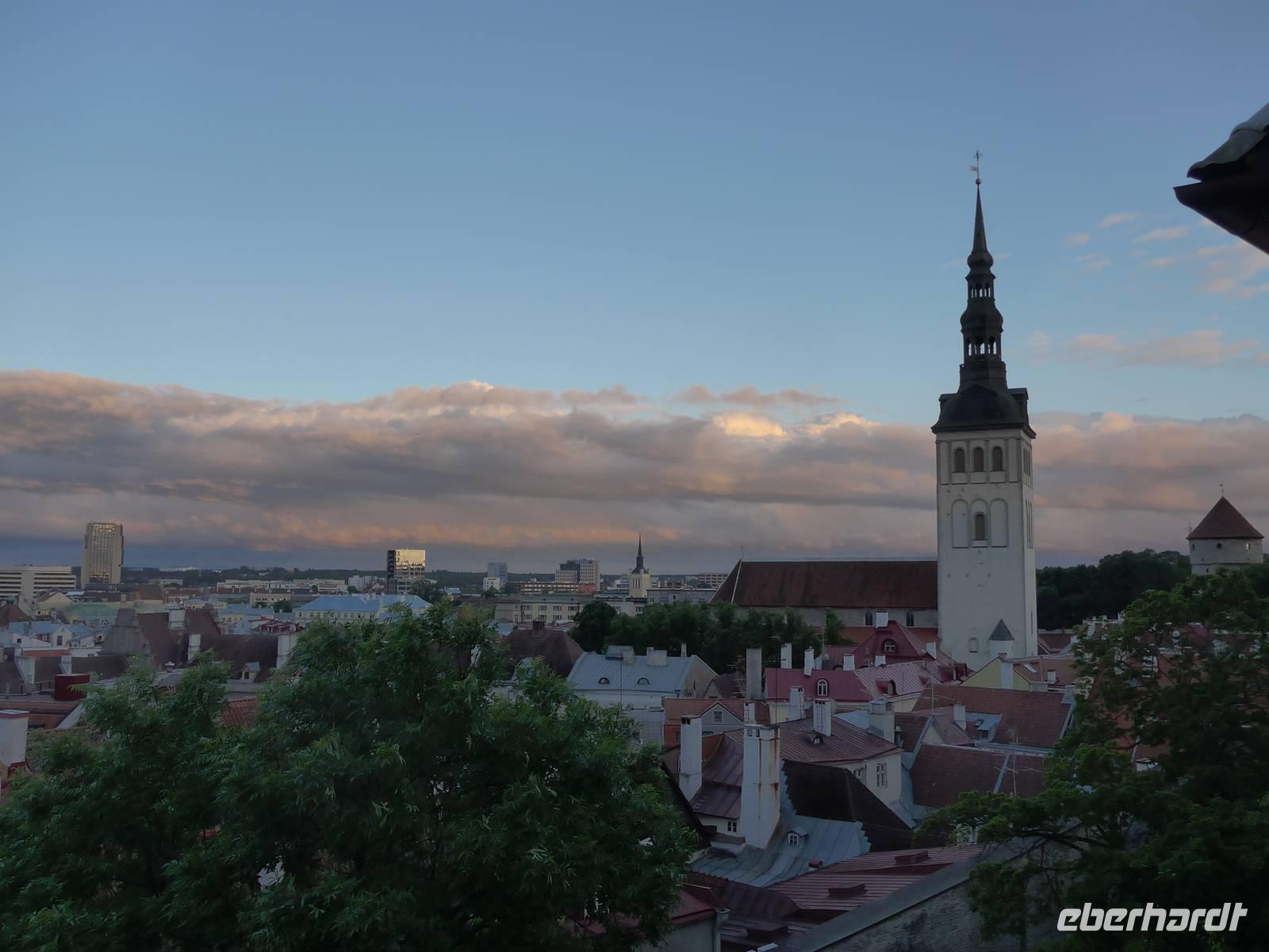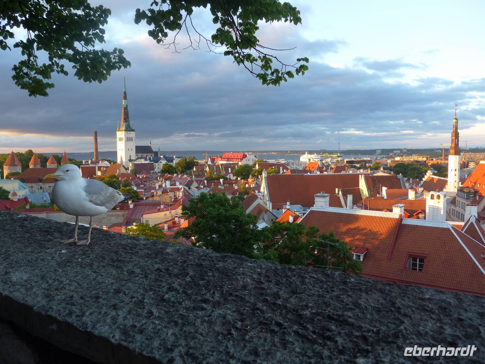 In Pärnu besorgte Roland uns Prospekte von Estland und wir spazierten durch die Hauptstrasse. Es war stürmisch und regenete immer wieder. Deshalb trafen wir uns recht schnell alle im Bus, wo unser Fahrer Jonas eine Flasche Balsam auf seinen Namenstag spendierte. Die letzten 140 km bis nach Tallinn vergingen recht schnell, da wir mit Walzermusik verwöhnt wurden. Unser Hotel in Tallinn lag direkt in der Altstadt und bis dorthin konnte unser Bus nicht fahren. Die Koffer wurden abgeholt und wir gingen das letzte Stück zu Fuß. Nach dem Abendessen im Hotel war noch herrliches Wetter und so erkundeten wir schon mal die mittelalterliche Stadt mit den 2 Aussichtsterrassen und schossen die ersten Fotos von Tallinn.