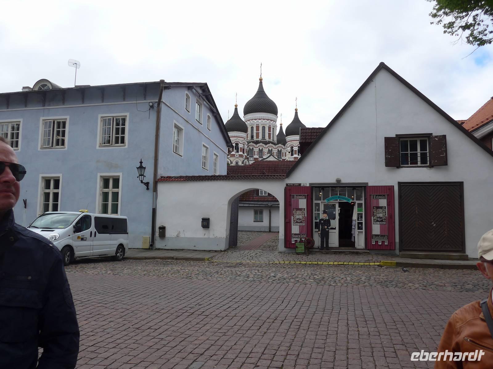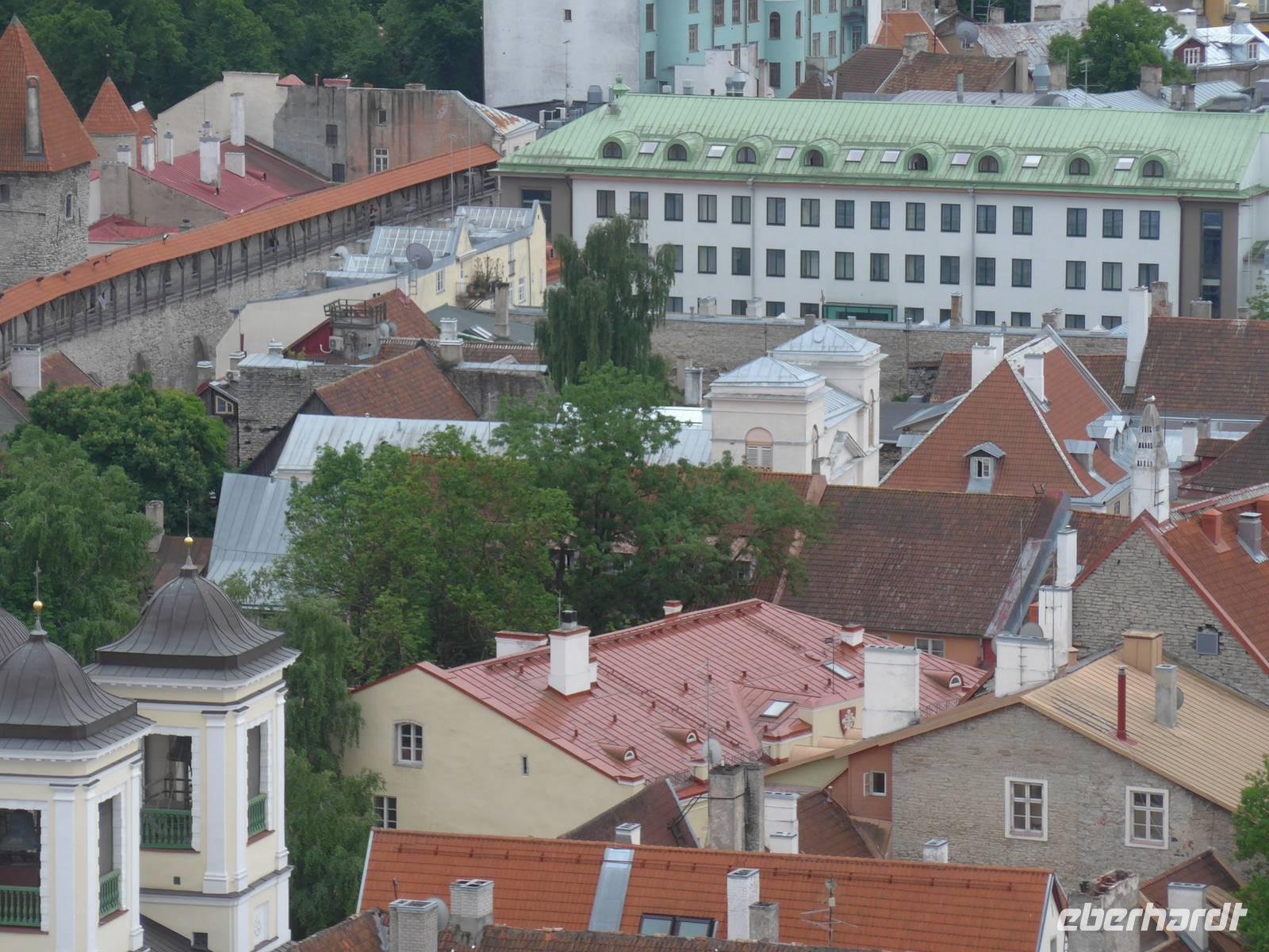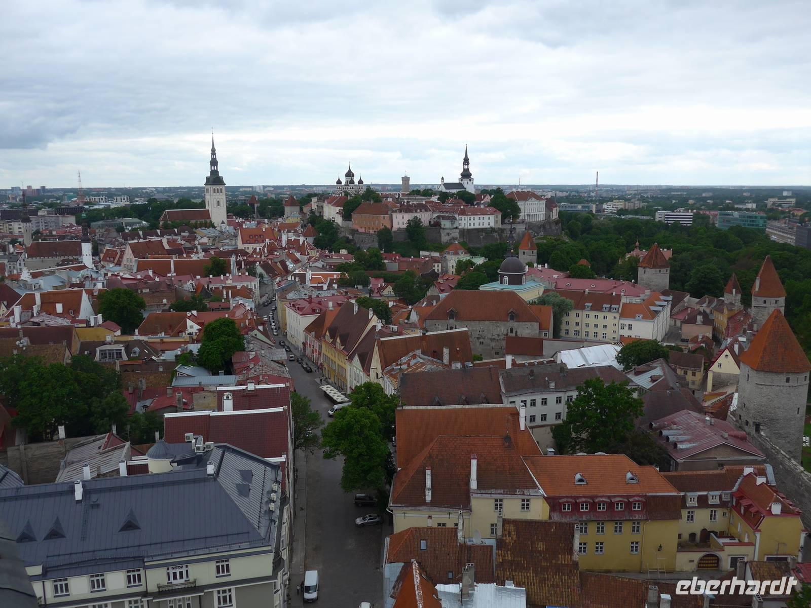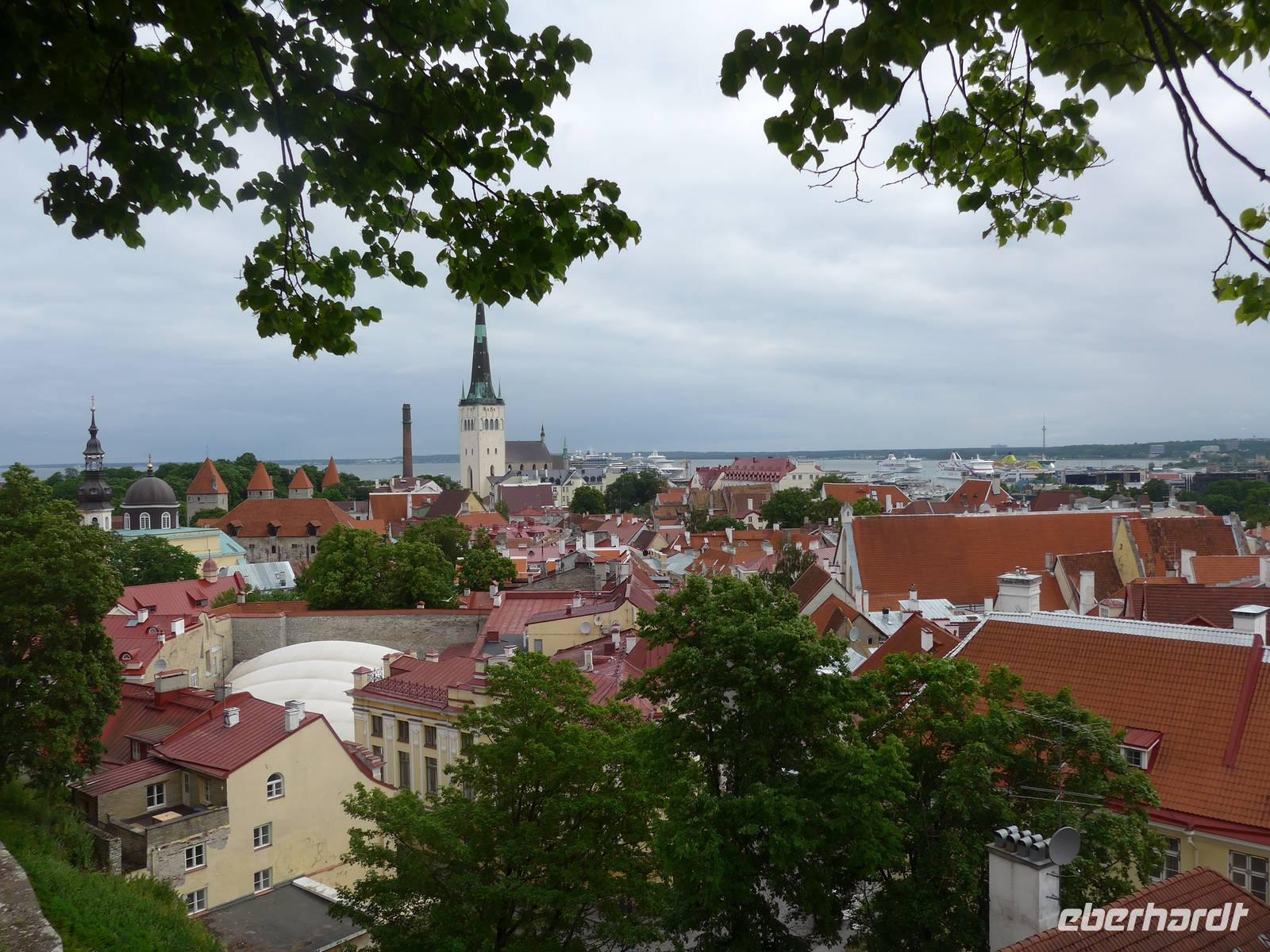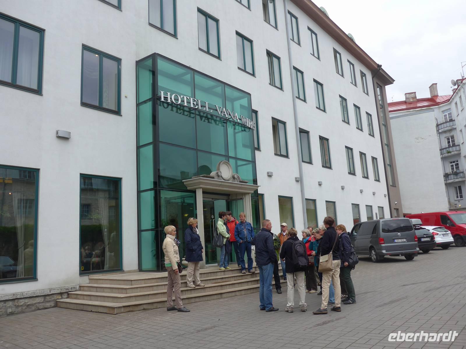 In Pärnu besorgte Roland uns Prospekte von Estland und wir spazierten durch die Hauptstrasse. Es war stürmisch und regenete immer wieder. Deshalb trafen wir uns recht schnell alle im Bus, wo unser Fahrer Jonas eine Flasche Balsam auf seinen Namenstag spendierte. Die letzten 140 km bis nach Tallinn vergingen recht schnell, da wir mit Walzermusik verwöhnt wurden. Unser Hotel in Tallinn lag direkt in der Altstadt und bis dorthin konnte unser Bus nicht fahren. Die Koffer wurden abgeholt und wir gingen das letzte Stück zu Fuß. Nach dem Abendessen im Hotel war noch herrliches Wetter und so erkundeten wir schon mal die mittelalterliche Stadt mit den 2 Aussichtsterrassen und schossen die ersten Fotos von Tallinn.