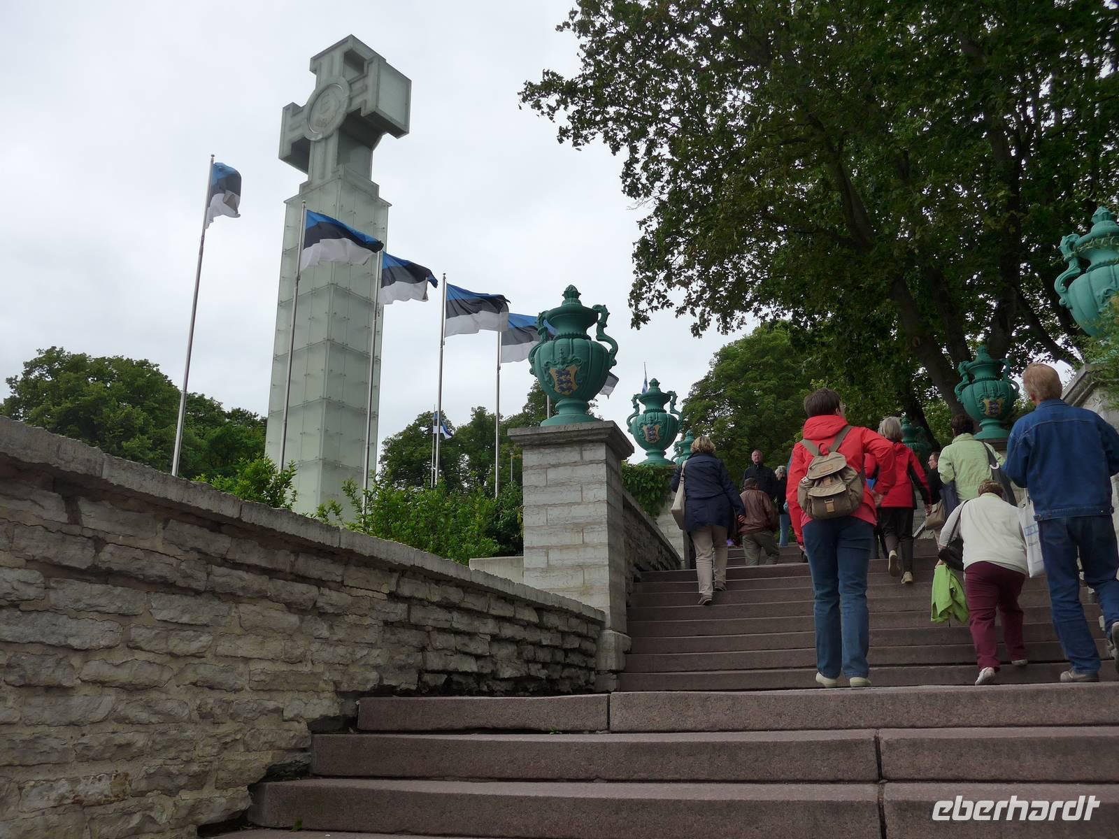 Die Stadtbesichtigung von Tallinn startete an unserem Hotel Vana Viru in der Altstadt und führte uns vorbei an der Rückseite des Rathauses und der Olde Hanse zur Nikolaikirche. Die Kirche und das benachbarte Stadtviertel wurden im zweiten Weltkrieg durch sowjetische Luftangriffe schwer beschädigt. Den Freiheitsplatz mit dem neuen unterirdischen Omnibusbahnhof und das Freiheitsdenkmal sahen wir während unseres Aufstieges zur alten Stadtmauer. Kiek in de Kök ist der größte Kanonenturm des Baltikums und spielte bei der Verteidigung Tallinns eine wichtige Rolle. Von dort gingen wir zum Domberg und sahen das Schloß, heutiger Sitz des Ministerrates von Estland, die Alexander-Newski-Kathedrale und die Domkirche St. Marien. Sehenswert sind im Dom die ca. 100 kunstvoll gestalteten Wappen deutschbaltischer Adelsfamilien. Am Stadtpalais vorbei erreichten wir die Aussichtplattform mit Blick über die Unterstadt bis hin zum Hafen und Pirita. Über die Stufen des "kurzen Beines" gingen wir in die Unterstadt und machten eine Kaffeepause im "Kalev". Danach besuchten wir den Marktplatz mit Rathaus und die älteste Apotheke der Welt. Durch die Katharinengasse mit vielen alten Handwerksbetrieben erreichten wir wieder unser Hotel. Nach einer kurzen Pause gingen wir zu unserem Bus und fuhren hinaus zum Sängerfeld und den Sportanlagen, die anläßlich der Olympiade 1980 gebaut wurden.