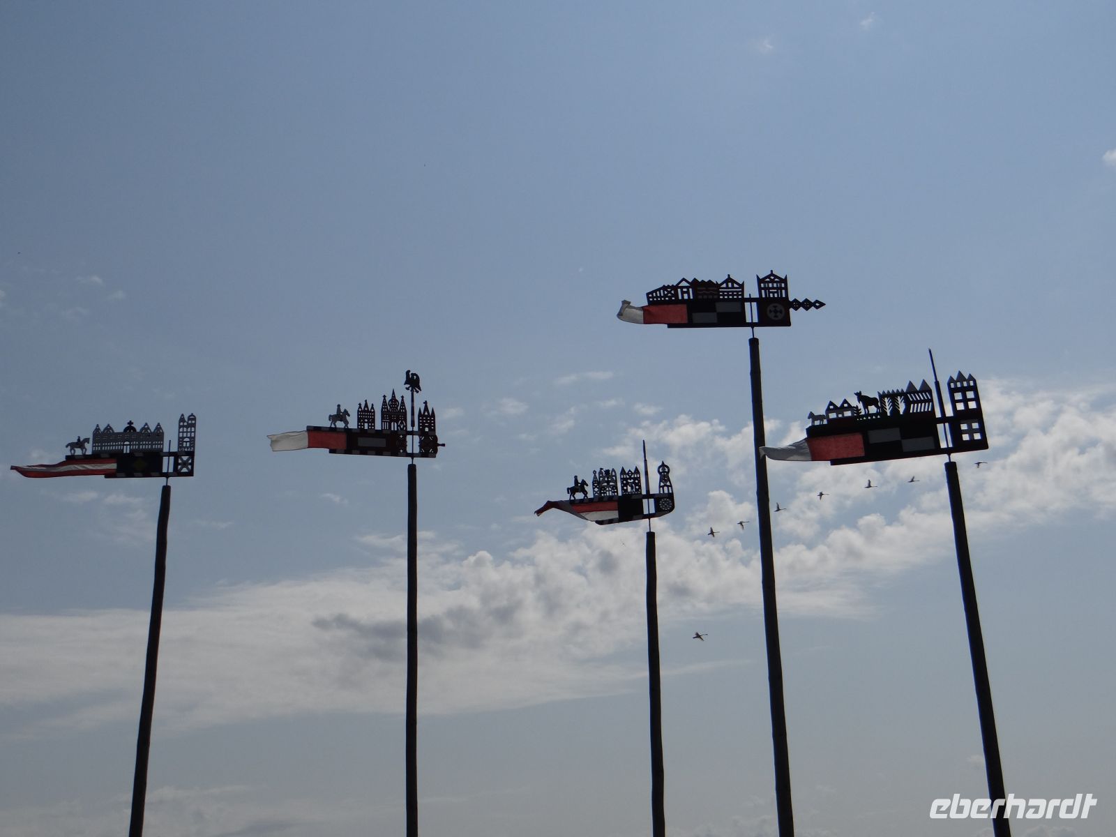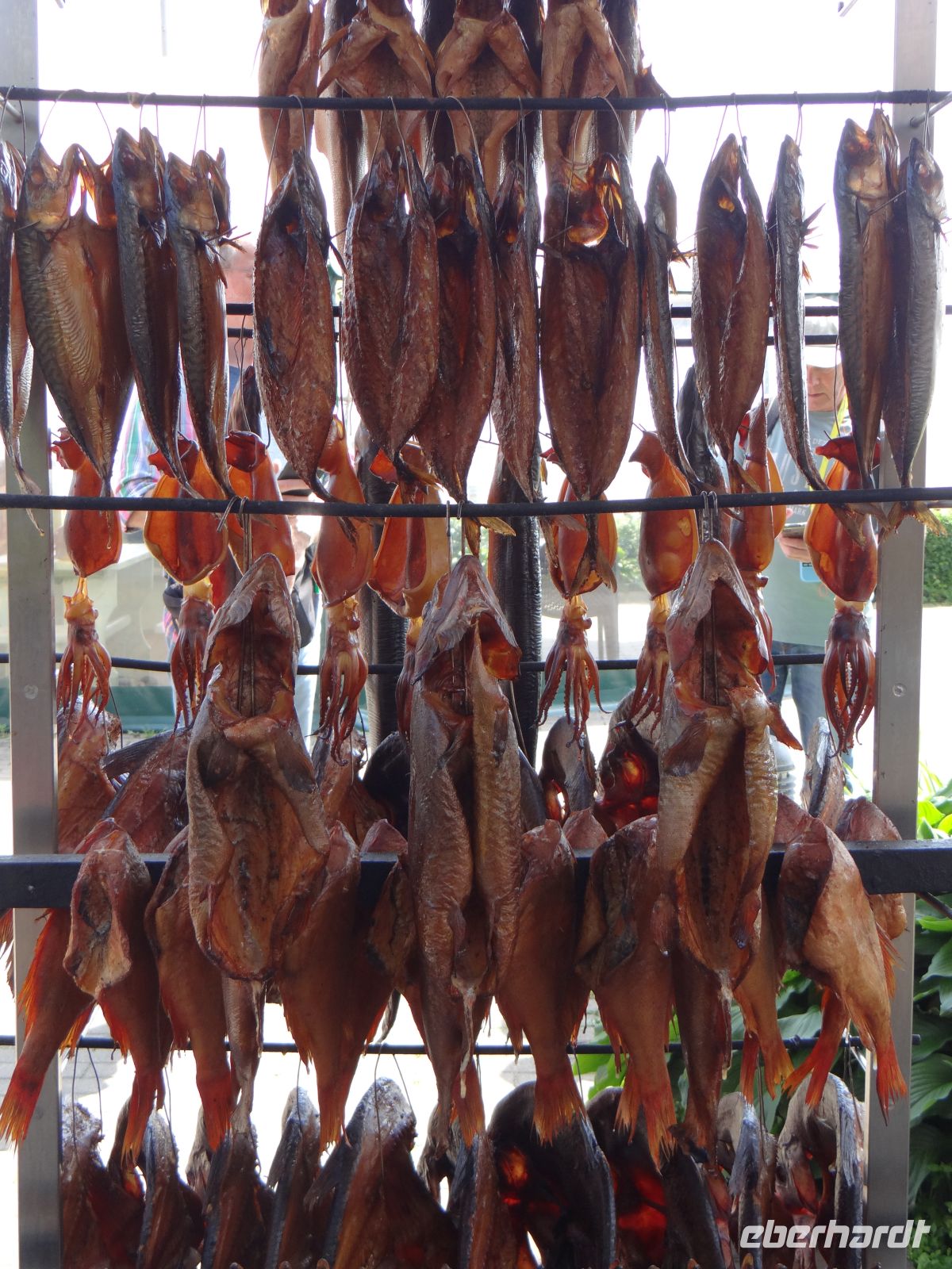 Zurück am Hafen tragen uns die Füße zur Fischräucherei. Was es da nicht alles gibt: Zander, Brasse, Stint, Zander, Aal, sogar Calamari hingen im Rauch. Danach traben wir der Seepromenade entlang, die mit vielen Kurenwimpeln geschmückt ist. Diese wurden 1844 eingeführt, um anhand des Erkennungsmusters die Kurenkäne unterscheiden zu können. Diese breiten Schiffe waren das wichtigste Transportmittel und hatten viel Platz.