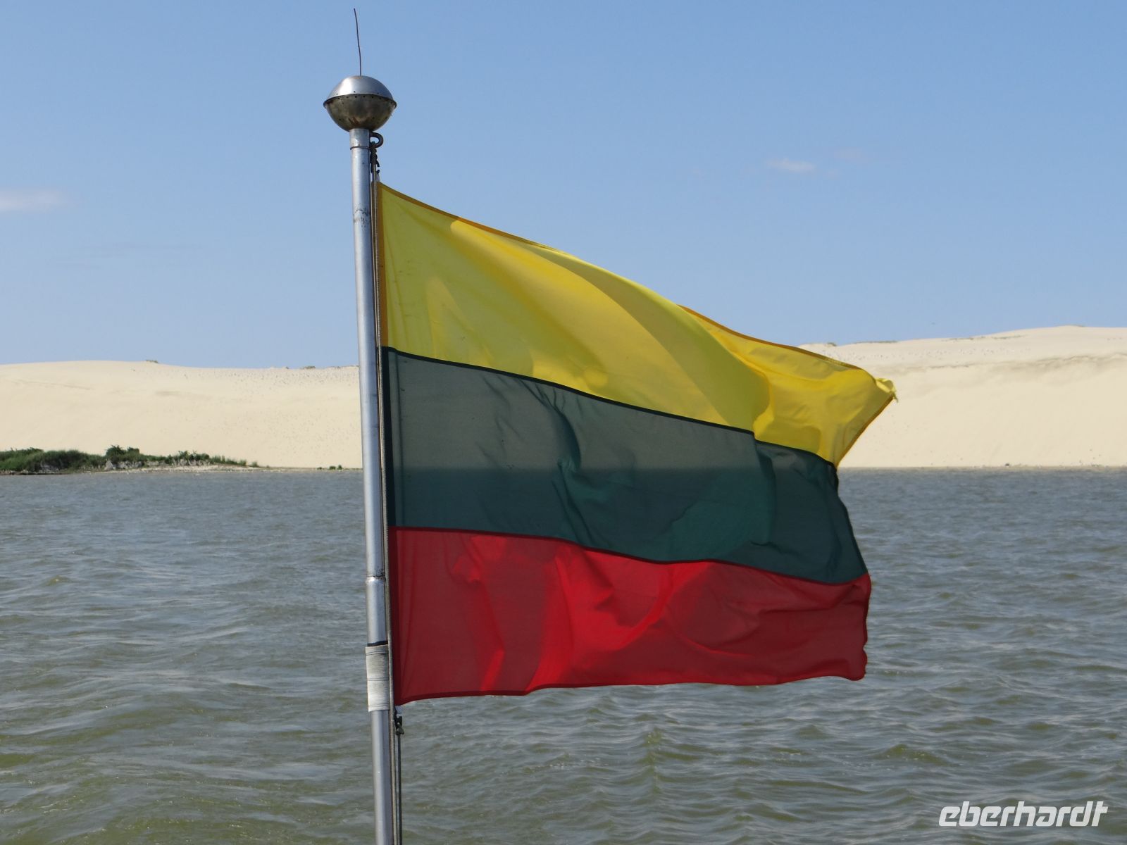 Wir fahren über die Hohe Düne hinaus entlang der Dünenlandschaft, die nur noch von Möwen betreten wird, die sich dort sehr wohlzufühlen scheinen. In großen Scharen sitzen sie am goldenen Hang, schwingen sich mit großem Lärm in die Luft, drehen eine Runde, um dann wieder an ähnlicher Stelle Platz zu nehmen. Weitere Tiere sitzen auf dem Kamm und schauen dem Treiben zu. Die rote Boje ein Stück weit voraus markiert die Seegrenze zwischen Russland und Litauen.