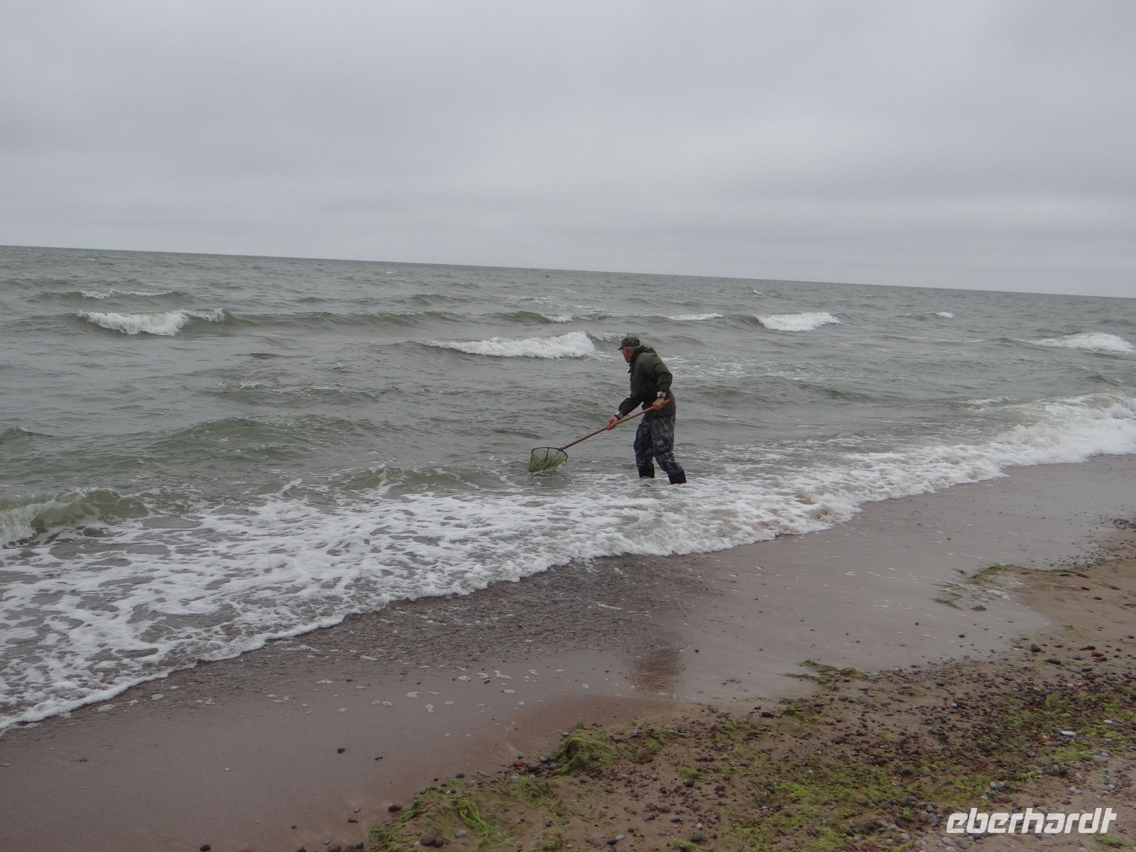 Es geht weiter zum kleinen Fischerort Karkle, wo uns Igoris, der Bernsteinfischer in Empfang nimmt. Im Naturkundezentrum erklärt er sehr anschaulich, was Bernstein auszeichnet und woran man ihn erkennt. Dann gehen wir zur nahegelegenen Ostsee, um die Theorie in Praxis umzusetzen. Igoris trägt eine Gummilatzhose, schnürt sich einen Gummigürtel um die Hüfte und um die Handgelenke, um sich vor dem Meerwasser zu schützen. Mit einem Netz stapft er in die Brandung und fängt die durch die Wellen aufgeworfenen Steine auf, schüttet sie an den Strand. In dem wirren Haufen suchen wir Bernstein anhand der Informationen, die wir vor kurzem vom Bernsteinfischer erhalten haben. Und tatsächlich, ein paar kleine Steine finden sich. 50 Mio. Jahre Erdgeschichte in diesen kleinen Leichtgewichten.