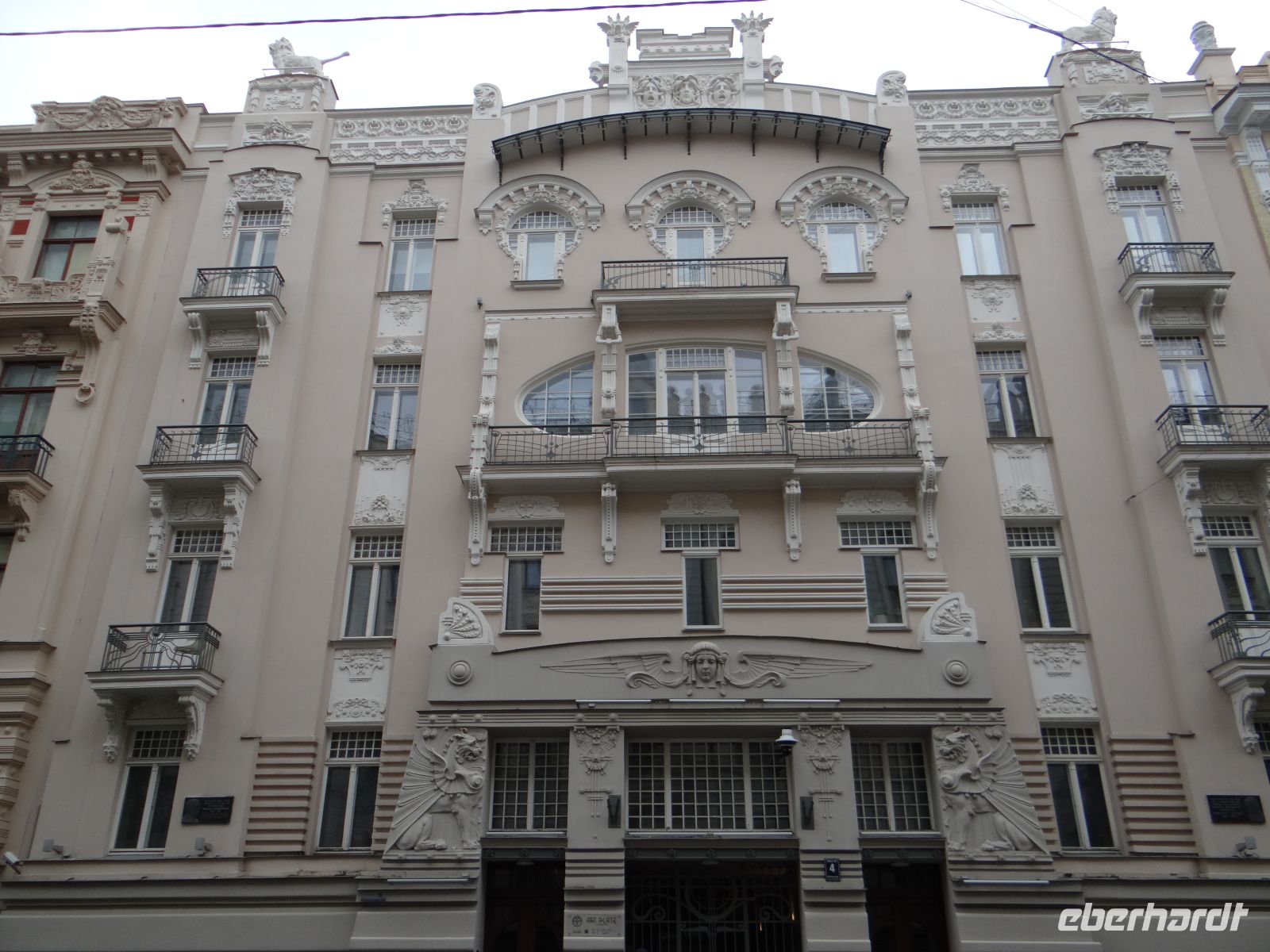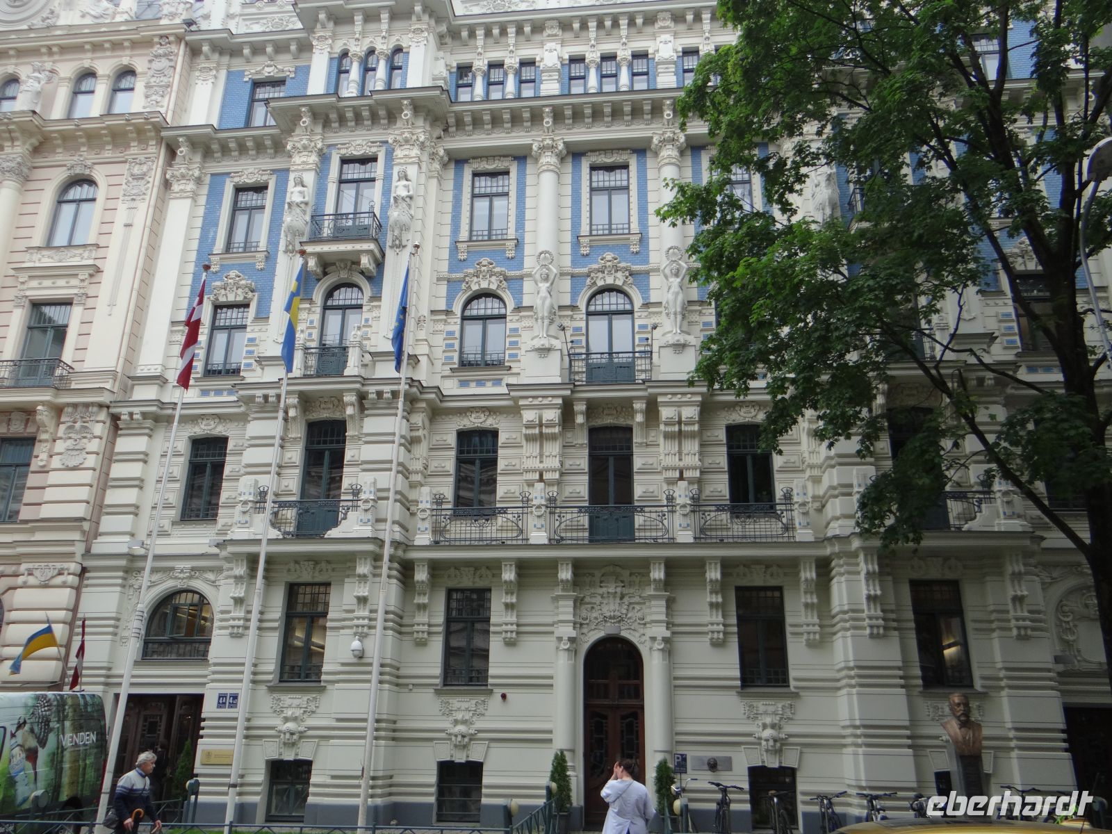 Zunächst fahren wir in das Viertel mit dem schönen Jugendstilhäusern. Mit dem Aufkommen der Eisenbahn und der Aufhebung der Leibeigenschaft wuchs Riga mit 500.000 Einwohnern zur fünftgrößten Stadt des Russischen Reiches. Die Hansestadt wurde wohlhabender und so vergrößerte man die Fläche über die Festungsanlagen hinaus – wie in Wien, Frankfurt am Main und anderen Städten – und baute neue Wohnviertel. Die eigenen Architekten kamen zum Zug und machten die Häuser zu ihren Visitenkarten. An die 800 Jugendstilgebäude hat Riga mit üppigen Fassadenverzierungen. Stilelemente aus der Antike und dem alten Ägypten, kräftige Männer tragen Balkone auf ihren Schultern, zartgliedrige Frauen recken sich dem Himmel entgegen, Sphinxen und Löwen, Elefantenköpfe und Fledermäuse, eine große Dekorationsfreude überzieht die Hausfassaden.
