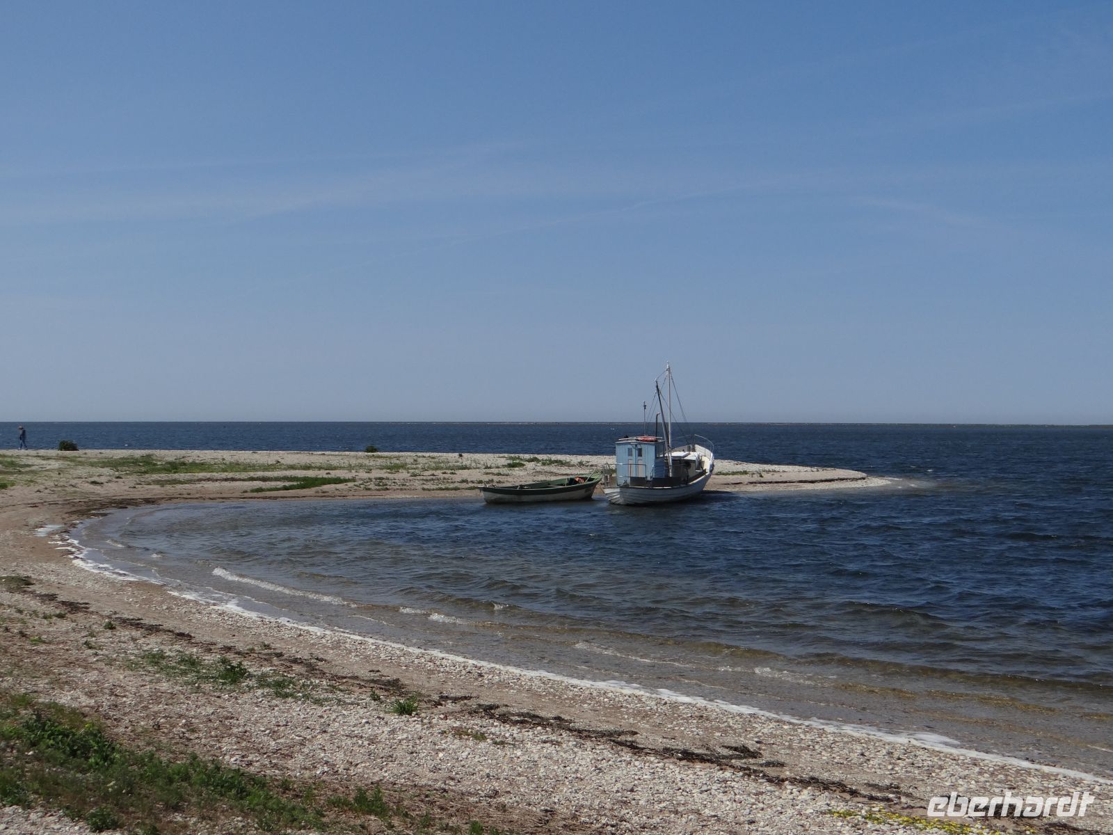 Das Dünenbild, das sich unserem Blick bieten, ist ein Bühnenbild mit Vorder-, Mittel- und Hintergrund, einem ruhigen Aufbau einer Landschaft, die das Auge erfreut. Über einen sehr soliden Holzsteg, der die Landschaft schont, laufen wir in den Ort, vorbei an einer Fischräucherei. Auf die Tür des Räucherofens ist geschrieben, dass um 13 Uhr die Köstlichkeiten aus dem Rauch genommen werden. Das sind doch Perspektiven und frohgemut treten wir unsere Bootsfahrt an. Das Schiff gehört uns ganz alleine, Platz ist vorne und hinten, blaue Kissen und Decken liegen bereit, so dass es eine vergnügliche Stunde wird, die wir gerne noch ausgedehnt hätten.