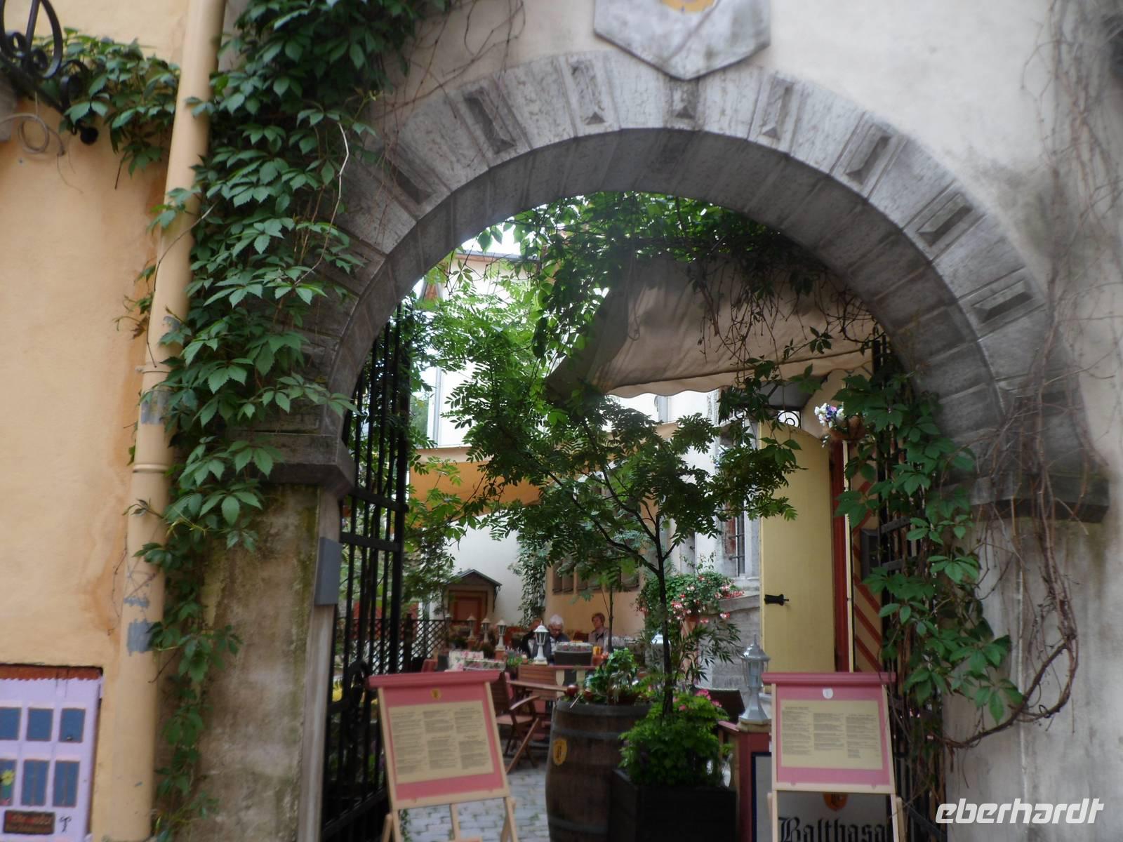 Wieder "erleichtert" bringt uns Ginteras mit dem Bus an die Stadtmauer in der Oberstadt am langen Herrmann. Dort beginnt Regina mit der Führung. Die Ausblicke sind so beeindruckend, die kleinen Gassen laden zum Bummel ein, die Kirchen zum Verweilen. An der Residenz der deutschen Botschaft spazieren wir das "lange Bein" hinab bis zum Rathausplatz.