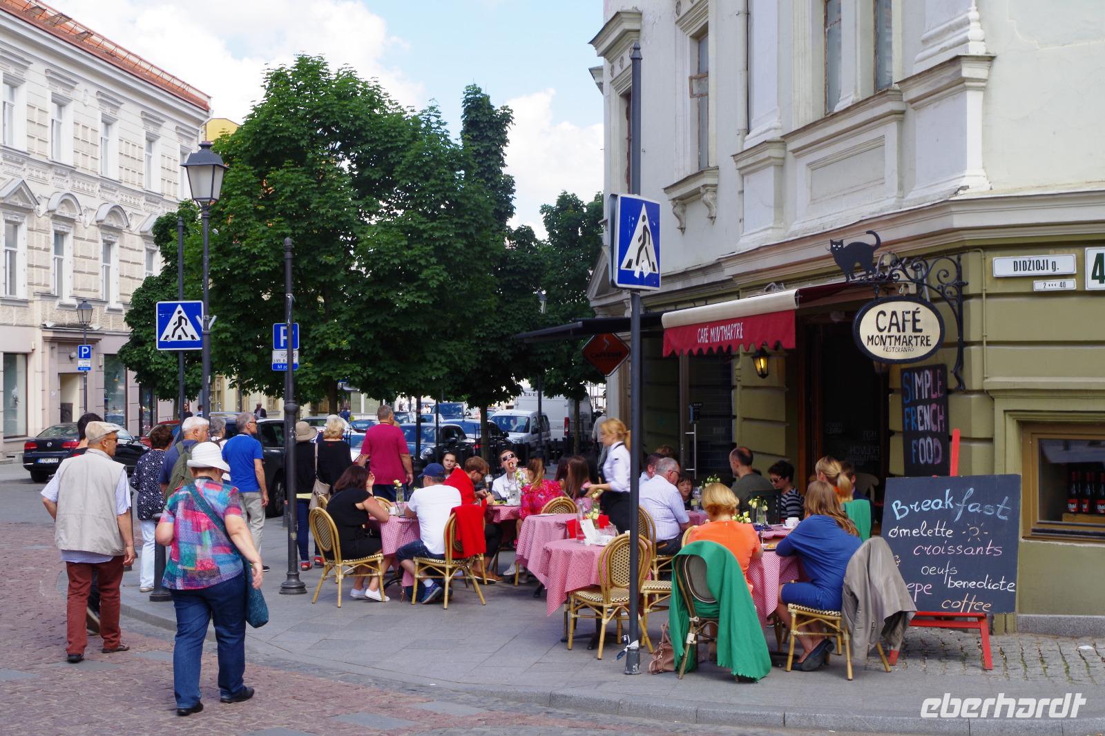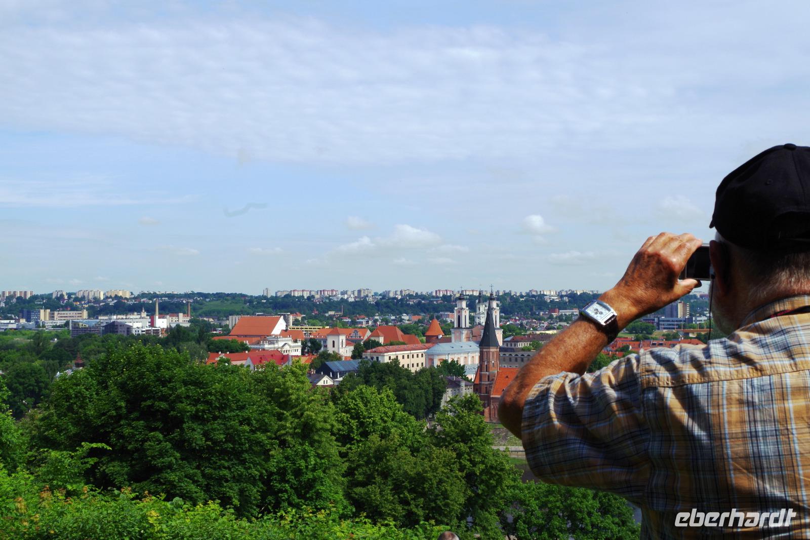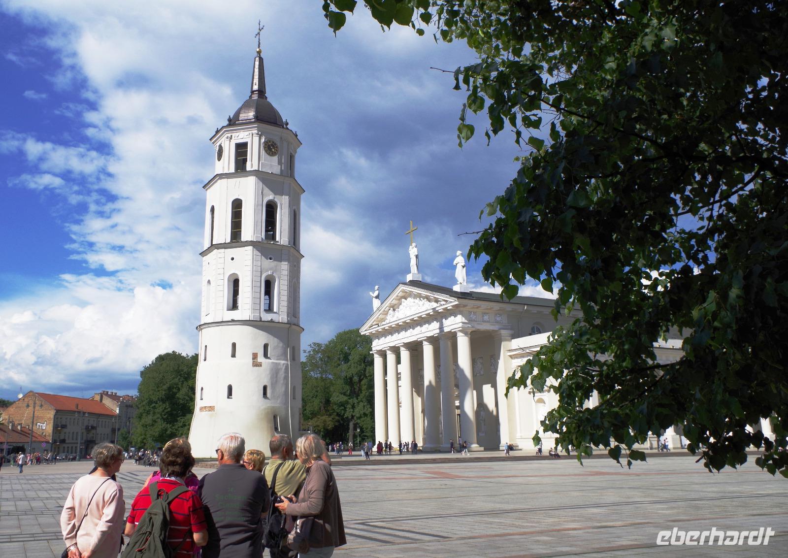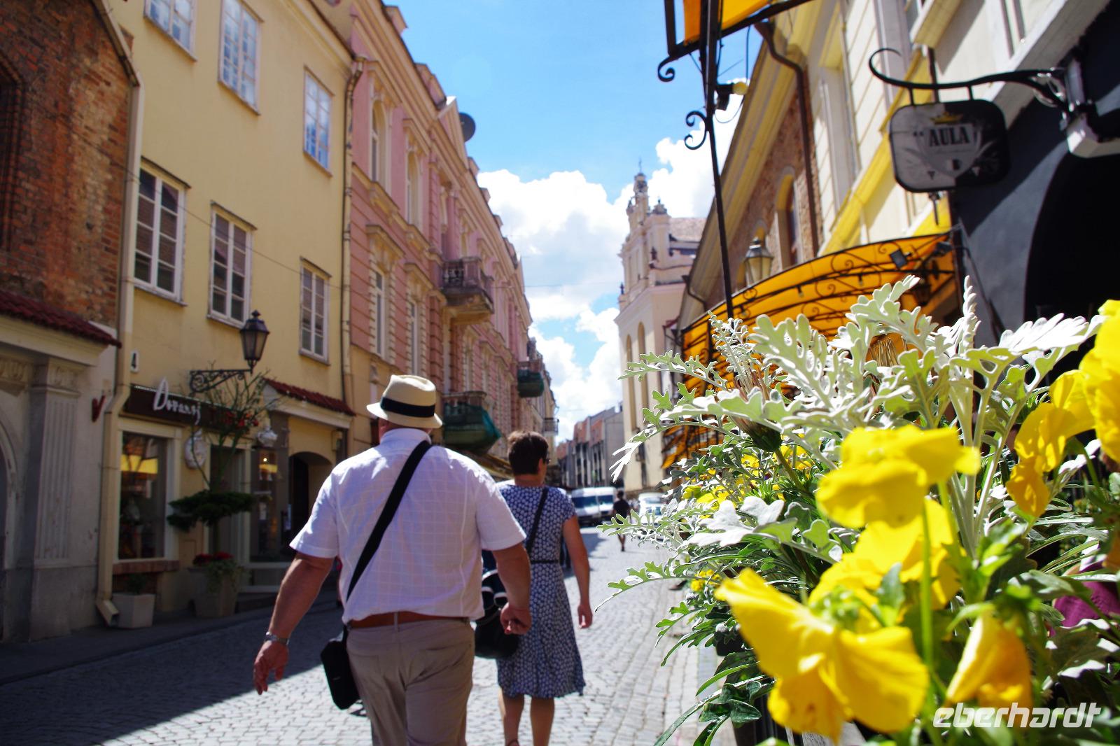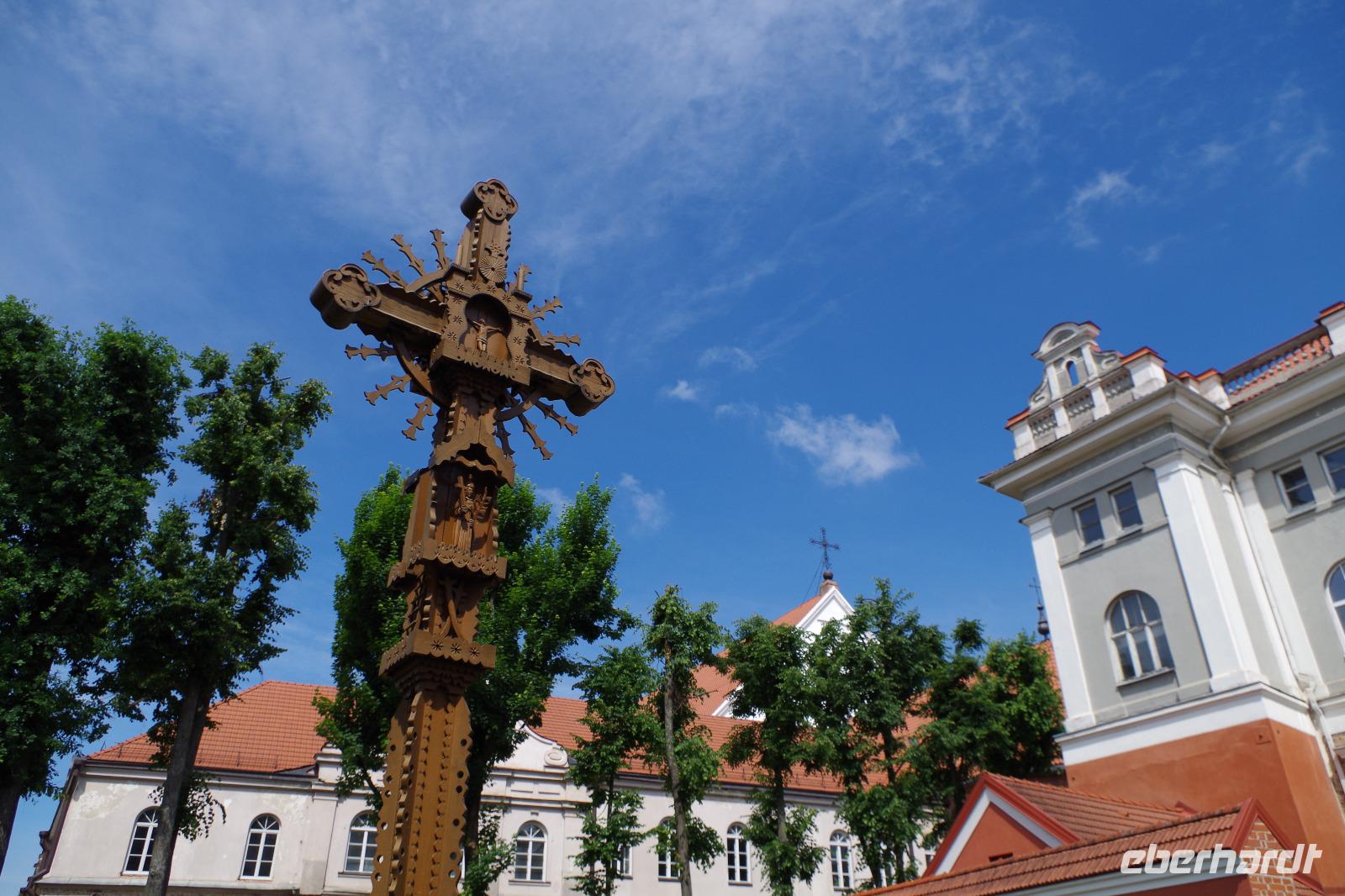 Wie Rom wurde Vilnius auf sieben Hügeln erbaut, erklärte uns Regina. Von einem dieser Hügel genossen wir eine wunderbare Aussicht auf die Stadt. Vorbei am Burgberg mit den Überresten der oberen Burg und dem Gediminas-Turm fuhren wir zum Tor der Morgenröte (das noch erhaltene Tor der ehemaligen Stadtbefestigung), um von dort unseren Rundgang zu Fuß durch die Altstadt fortzusetzen. Die barocke Altstadt gehört zum UNESCO-Weltkulturerbe. Wir besuchten die russisch-orthodoxe Heiliggeistkirche und spazierten durch die Gassen zum Rathausplatz und vorbei an alten Bürgenhäusern zur Universität, die zu den ältesten in Europa gehört. Auch sahen wir den Präsidentenpalast. Im 18. Jhd. war das Gebäude Bischofspalast, später diente es als Domizil der russischen Zaren, auch Napoleon weilte hier. Die Sowjets nutzten es als Konzertsaal und seit 1997 ist der Palast wieder Residenz des litauischen Staatsoberhauptes, das seit 5 Jahren eine Frau ist. Unser Rundgang endete am Kathedralenplatz. Hier prunkt der 2009 völlig neu gebaute Großfürstenpalast auf dem Gebiet der ehemaligen unteren Burg und davor das Denkmal des Stadtgründers Gediminas auf seinem Pferd. Die weiße Kathedrale St. Stanislaus dominiert auf diesen Platz. Vor langer Zeit stand hier ein Tempel zu Ehren des Donnergottes, 1251 wurde dann die erste Kirche errichtet wurde, die später wiederum für heidnische Kulthandlungen genutzt wurde. Erst nach der Christianisierung entstand die römisch-katholische Kathedrale, die während der Sowjetzeit geschlossen wurde und erst 1988 an die Gemeinde von Vilnius zurück ging. Neben der Kathedrale steht extern und etwas schief der Glockenturm. Bei Sonnenschein genossen wir anschließend unsere individuelle Mittagspause in der Altstadt.