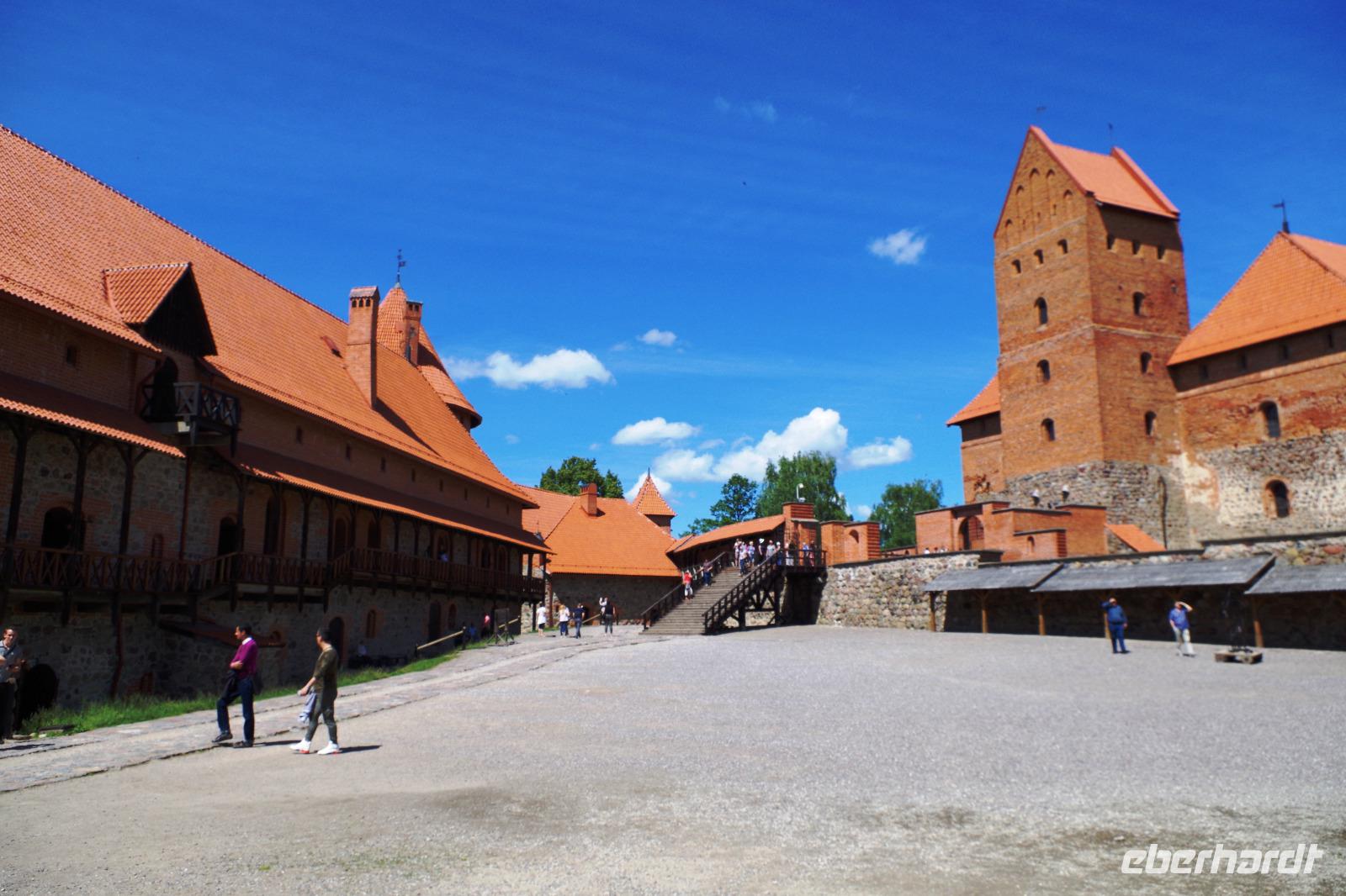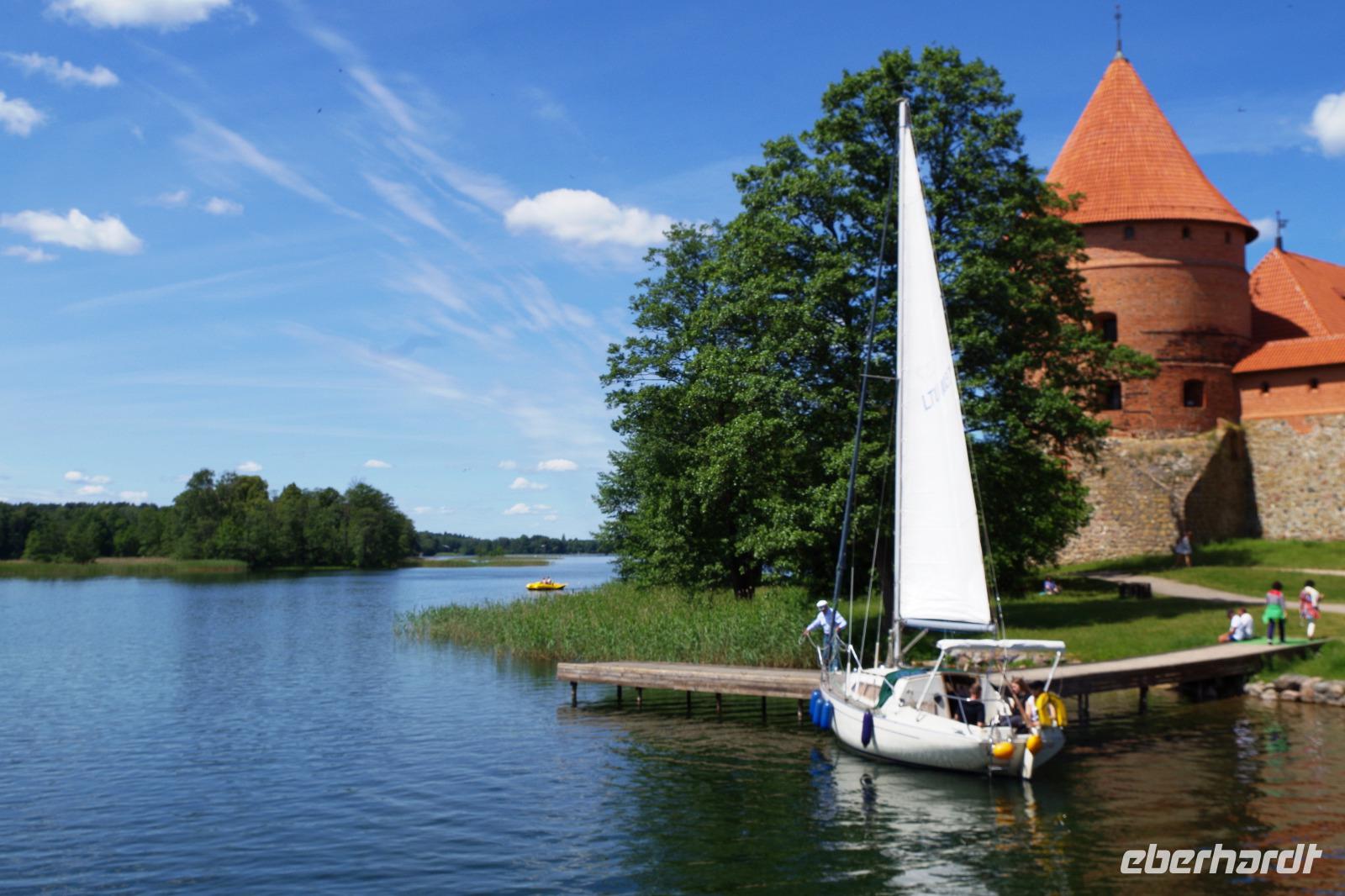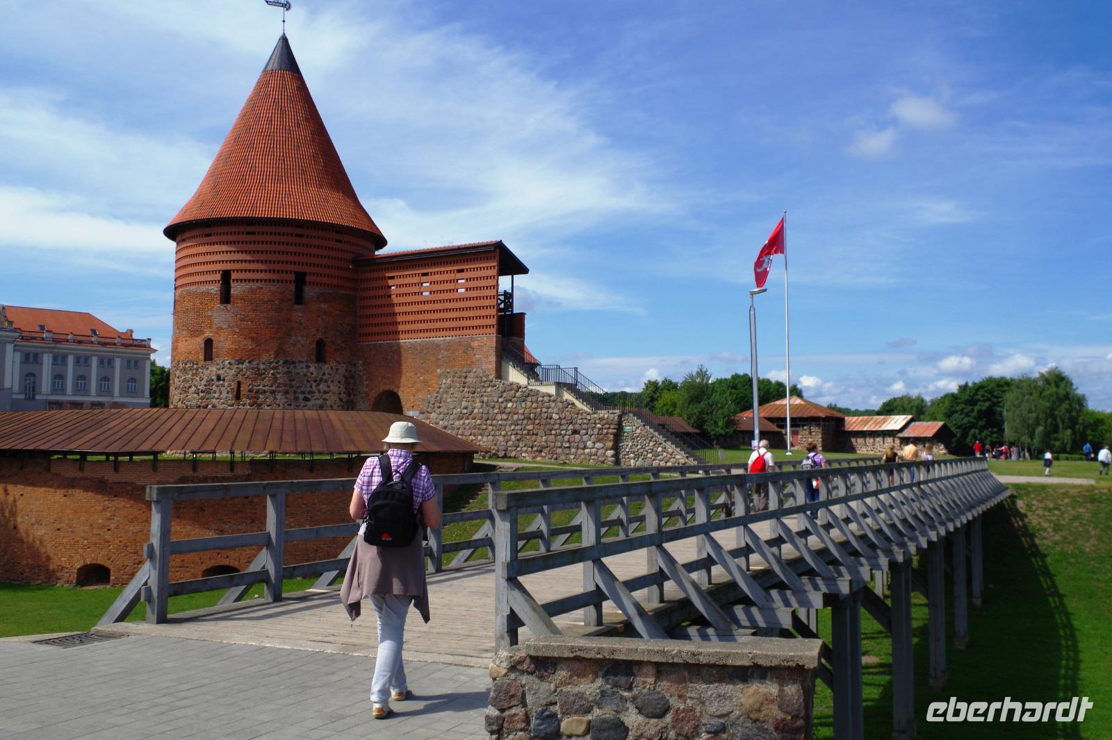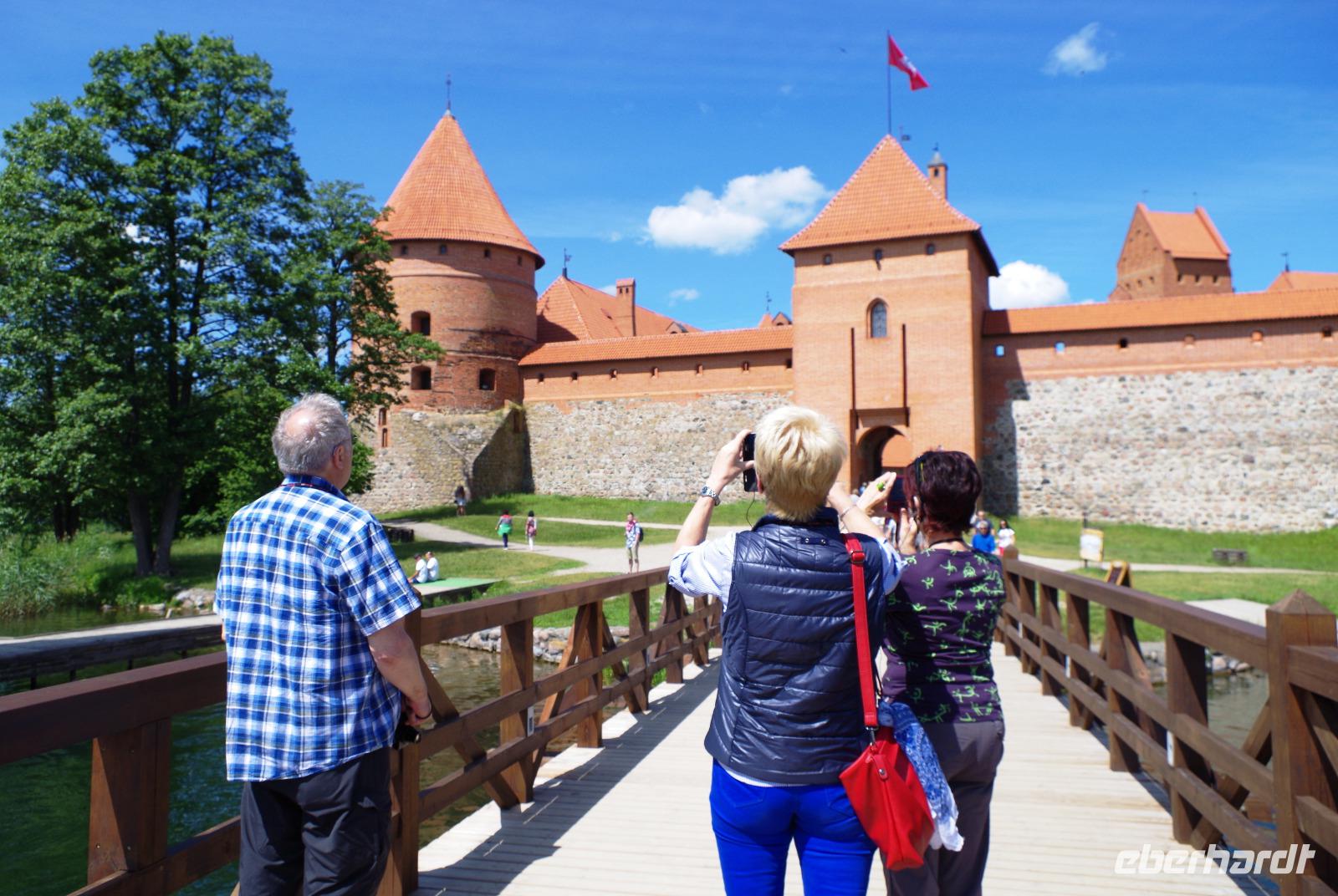 Am Nachmittag unternahmen wir einen sonnigen Ausflug in das 30 km entfernte Trakai, inmitten einer malerischen Seenplatte gelegen. Von 1316 bis 1323 war Trakai Hauptstadt des Landes. Auch hier hatte Gediminas seine Finger im Spiel, als er 1321 die Stadt erbauen ließ, damals wichtiges militärisches und politisches Zentrum des Großfürstentums. Auf einer Halbinsel des Galve-Sees entstand die mittelalterliche, backsteinerne Burganlage, die nach Bränden und Zerstörungen erst nach dem 2. Weltkrieg wieder als Wasserburg aufgebaut wurde. Über Holzstiegen und enge Gänge durchstreiften wir die Gemäuer der Burganlage (manchmal bildeten wir dabei eine Ameisenstraße) und erfuhren viel Wissenswertes zur Geschichte. In Trakai gibt es noch eine Besonderheit: Seit dem 14. Jhd. leben hier die Karäer, ein turksprachiges Volk mosaischen Glaubens aus der Krimregion, die damals die Großfürsten als Wachgarde ins Land holten. Heute leben noch ein ganz geringe Teil dieser Volksgruppe in Trakai. Eins ihrer Gebetshäuser, die Kenesas findet man noch in der Stadt, ebenso die hölzernen Wohnhäuser, deren Giebel mit 3 Fenstern zur Straße gewandt sind. Wir genossen den sonnigen, warmen Nachmittag am See, bevor wir nach Vilnius zurück fuhren. Am Abend fuhren wir zum Restaurant unweit des Gedimina Prospektes, wo wir typisch litauisch zu Abend speisten. Riesige Mengen an Käse-, Wurst - und Kartoffelspezialitäten, rote Beete-Suppe und Wodka füllten die Tische und unsere Mägen. Danach bummelten wir individuell durch die Altstadt zum Hotel zurück und es gab jede Menge zu erleben. Vilnius stand im Zeichen der Musiknacht, ganz Vilnius war zu später Stunde auf den Beinen. An über 100 Plätzen der Stadt wurde gesungen, getanzt und musiziert. Erstaunlich wie friedlich, harmonisch, ohne Absperrungen und Kontrollen gefeiert wurde. Die Nacht und nicht durch diese wurde lang, denn es war die Zeit der weißen Nächte......