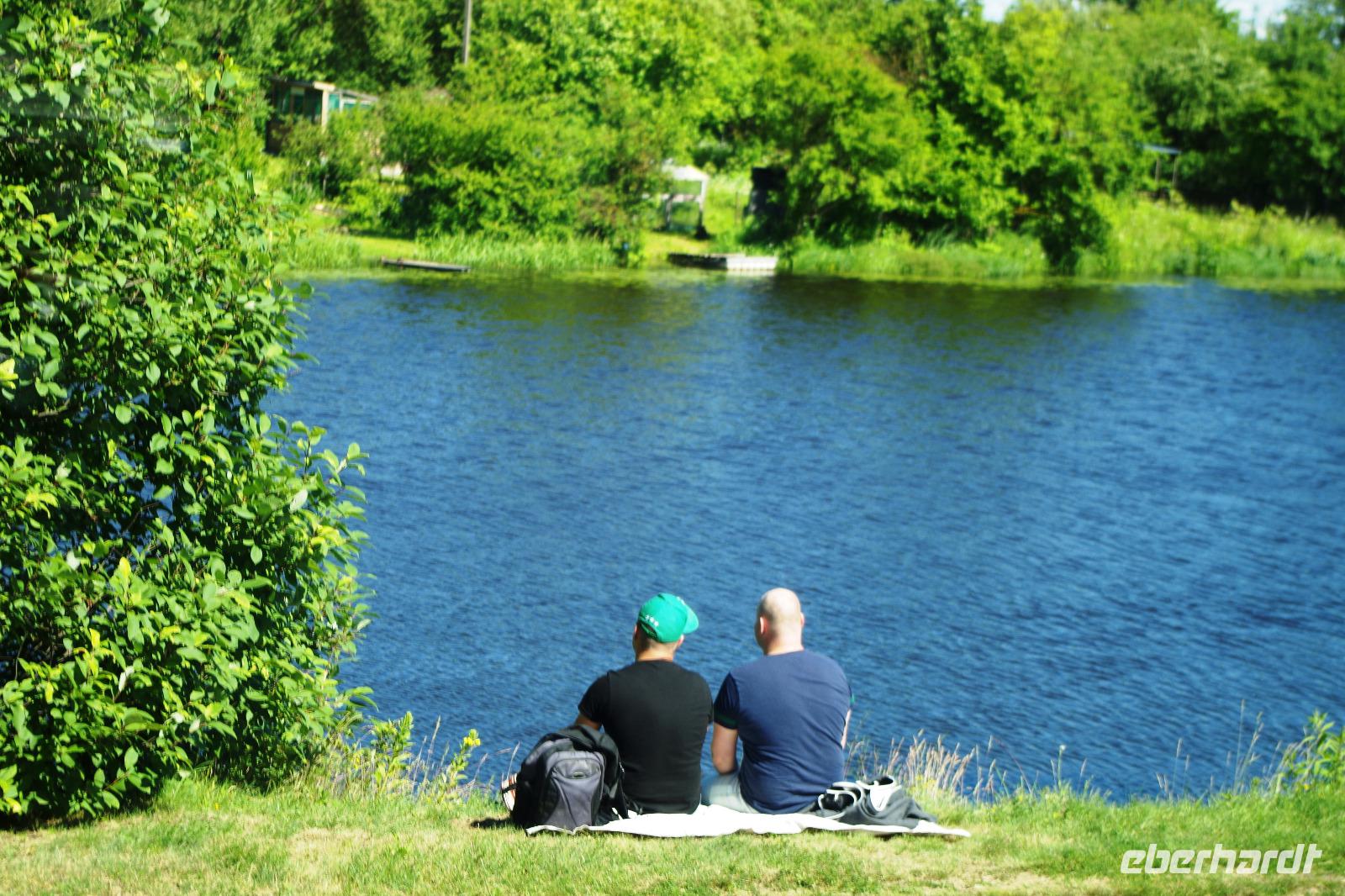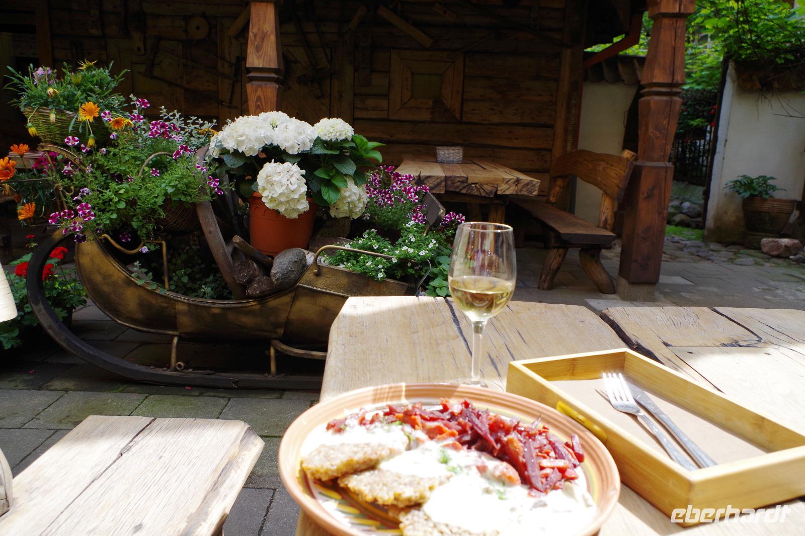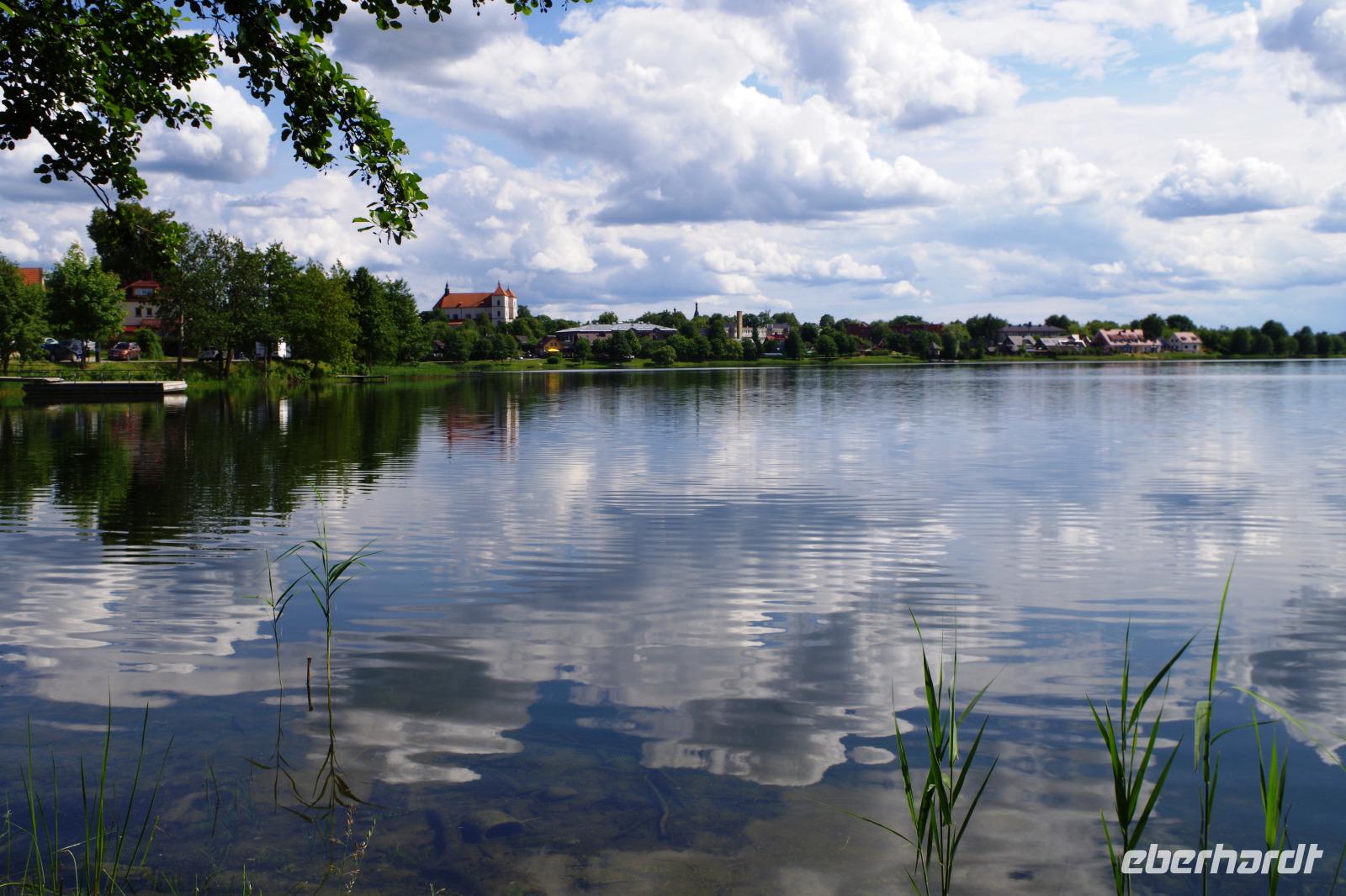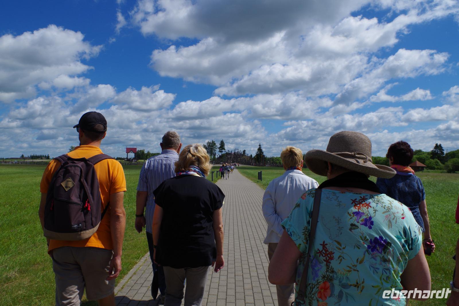 Am Nachmittag unternahmen wir einen sonnigen Ausflug in das 30 km entfernte Trakai, inmitten einer malerischen Seenplatte gelegen. Von 1316 bis 1323 war Trakai Hauptstadt des Landes. Auch hier hatte Gediminas seine Finger im Spiel, als er 1321 die Stadt erbauen ließ, damals wichtiges militärisches und politisches Zentrum des Großfürstentums. Auf einer Halbinsel des Galve-Sees entstand die mittelalterliche, backsteinerne Burganlage, die nach Bränden und Zerstörungen erst nach dem 2. Weltkrieg wieder als Wasserburg aufgebaut wurde. Über Holzstiegen und enge Gänge durchstreiften wir die Gemäuer der Burganlage (manchmal bildeten wir dabei eine Ameisenstraße) und erfuhren viel Wissenswertes zur Geschichte. In Trakai gibt es noch eine Besonderheit: Seit dem 14. Jhd. leben hier die Karäer, ein turksprachiges Volk mosaischen Glaubens aus der Krimregion, die damals die Großfürsten als Wachgarde ins Land holten. Heute leben noch ein ganz geringe Teil dieser Volksgruppe in Trakai. Eins ihrer Gebetshäuser, die Kenesas findet man noch in der Stadt, ebenso die hölzernen Wohnhäuser, deren Giebel mit 3 Fenstern zur Straße gewandt sind. Wir genossen den sonnigen, warmen Nachmittag am See, bevor wir nach Vilnius zurück fuhren. Am Abend fuhren wir zum Restaurant unweit des Gedimina Prospektes, wo wir typisch litauisch zu Abend speisten. Riesige Mengen an Käse-, Wurst - und Kartoffelspezialitäten, rote Beete-Suppe und Wodka füllten die Tische und unsere Mägen. Danach bummelten wir individuell durch die Altstadt zum Hotel zurück und es gab jede Menge zu erleben. Vilnius stand im Zeichen der Musiknacht, ganz Vilnius war zu später Stunde auf den Beinen. An über 100 Plätzen der Stadt wurde gesungen, getanzt und musiziert. Erstaunlich wie friedlich, harmonisch, ohne Absperrungen und Kontrollen gefeiert wurde. Die Nacht und nicht durch diese wurde lang, denn es war die Zeit der weißen Nächte......