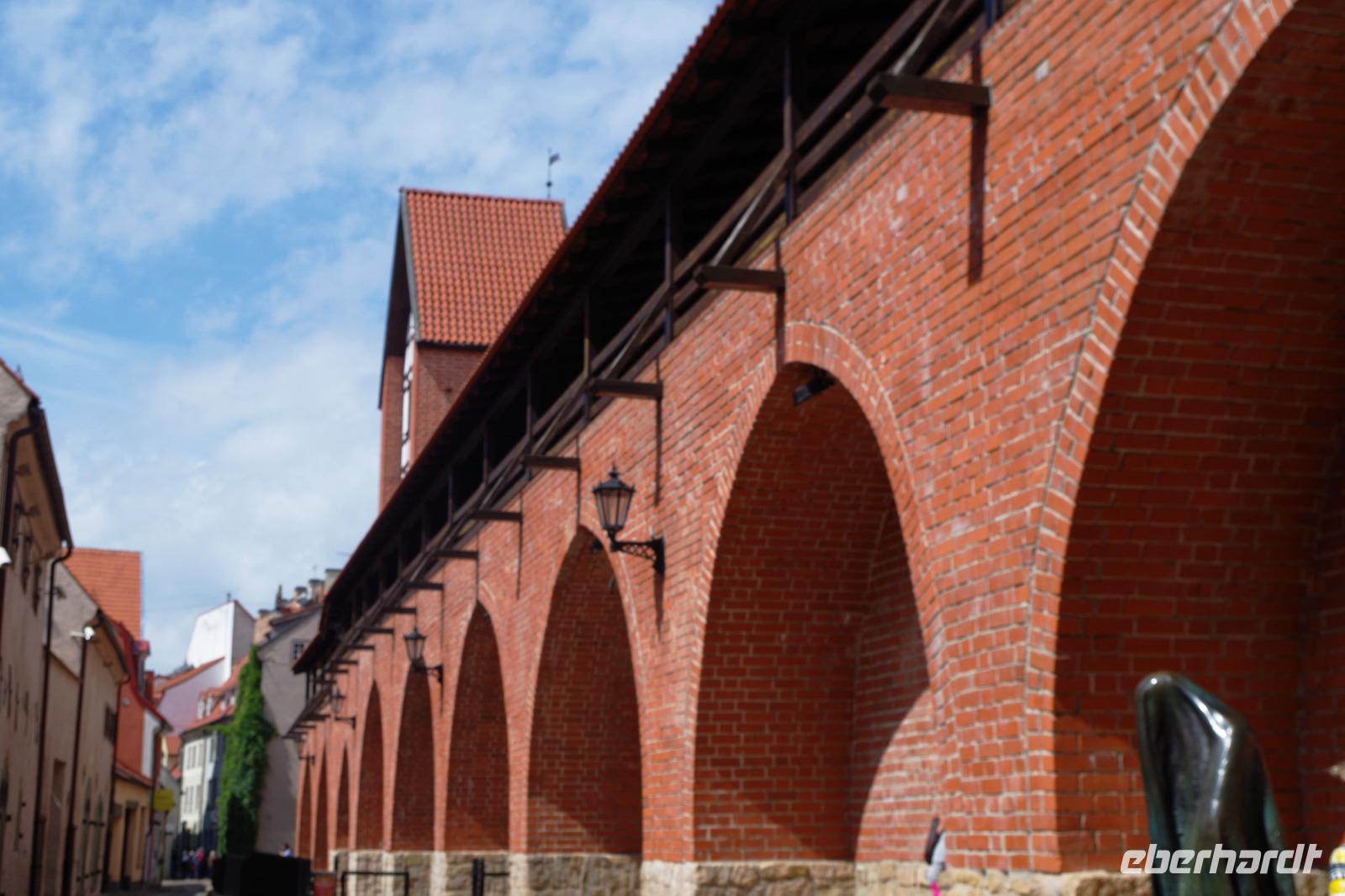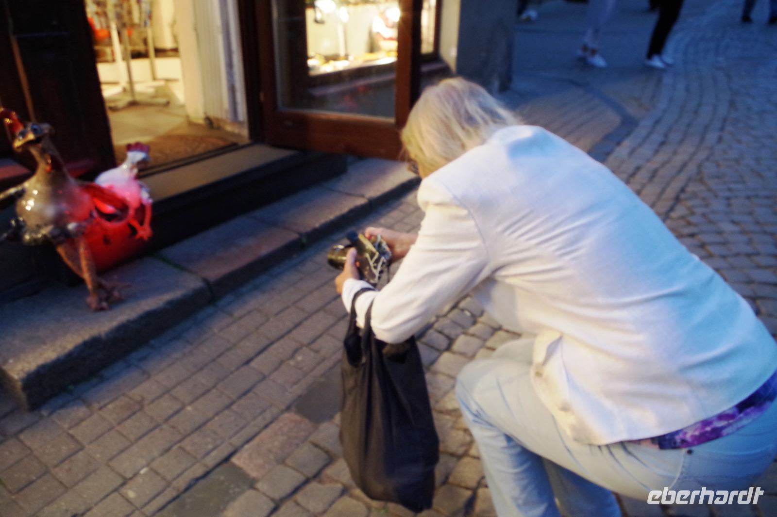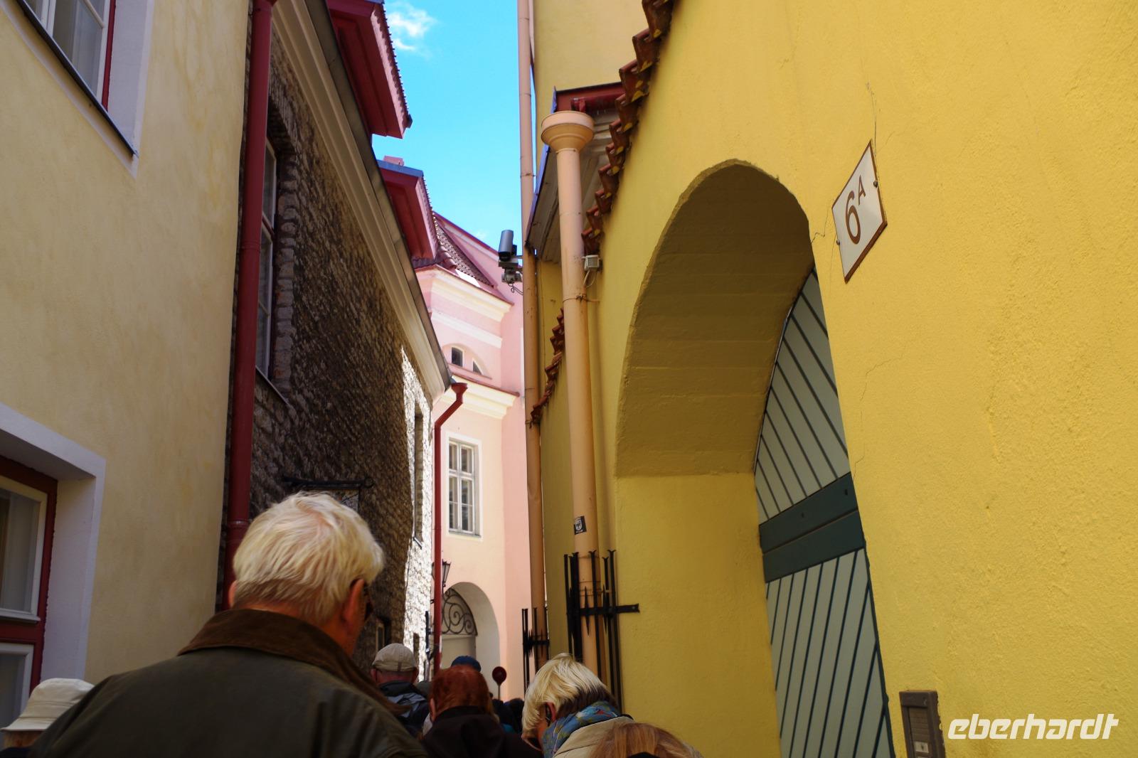 Auf dem Domberg begann unser Rundgang durch Tallinn. Neben dem Domschloss, heute estnisches Parlament ragt der Lange Herrmann hervor. Gegenüber befindet sich die russisch-orthodoxe Alexander-Newski-Kathdrale. Vorbei an der St. Mariengilde und der Domschule (von 1920 bis 1940 deutsches Gymnasium) gelangten wir zum Mariendom, der Hauptkirche der estnischen Lutheraner. Von den Aussichtsterrassen des Domberges genossen wir die wunderbare Ausblicke. Danach spazierten wir auf dem Langen Bein in die Unterstadt hinab. Wir bummelten durch die engen Gassen und Straßen der mittelalterlichen Unterstadt und entdeckten das ein oder andere Kleinod. Die Lange Straße (Pikk) verbindet auch heute noch den Rathausplatz mit dem Hafen. Nahe dem Schwarzhäupterhaus steht ein schönes Jugendstilhaus. Auf dessen Dach spannt der einstige Hausherr mit Hilfe seines Monokels in die gegenüberliegenden Fenster. Schräg gegenüber liegt das Haus der St. Kanuti-Gilde, an dessen Fassade der heilige Knut (Schutzpatron der Gilde) und Luther zu sehen sind. Ein Stück weiter befindet sich die Große Gilde, wo sich damals die reichsten Kaufleute der Stadt versammelten. An der Ecke, fast unscheinbar steht die Heiliggeistkirche, in deren Glockenturm die älteste Glocke Estlands läutet. Der schmale Weckengang (früher waren hier viele Backstuben ansässig) führt zum Rathausplatz. Gleich links ist die alte Ratsapotheke zu sehen, die zu den ältesten in Europa zählt. Mitten auf dem Platz erhebt sich das gotische Rathaus. Auf dem schlanken Turm sitzt der Alte Thomas (Wetterfahne) und aus der Fassade schauen bedrohlich aussehende Drachenköpfe (Speier) heraus. Auf dem Rathausplatz endete unser Rundgang. Alle Gäste freuten sich, den sonnigen Nachmittag für individuelle Erkundungen zu nutzen. In den zahlreichen Cafes und Restaurants machten viele erst einmal eine wohlverdiente Pause, um die unzähligen, neu gewonnenen Eindrücke zu verarbeiten, denn so viel Mittelalter und historisches Pflaster strengt an. In Tallinn lohnt sich immer wieder ein Blick in die Hinterhöfe und Seitengassen, wo sich versteckt, kleine gemütliche Cafes und architektonische Kleinode befinden. In der Katharinengilde sind viele traditionelle Handwerker und Kunstgalerien zu finden. Durch den angrenzenden Katharinengang am gleichnamigen Kloster gelangt man zur alten Stadtmauer, wo viele Händler die estnisch-bunten Strickwaren zum Verkauf anbieten.