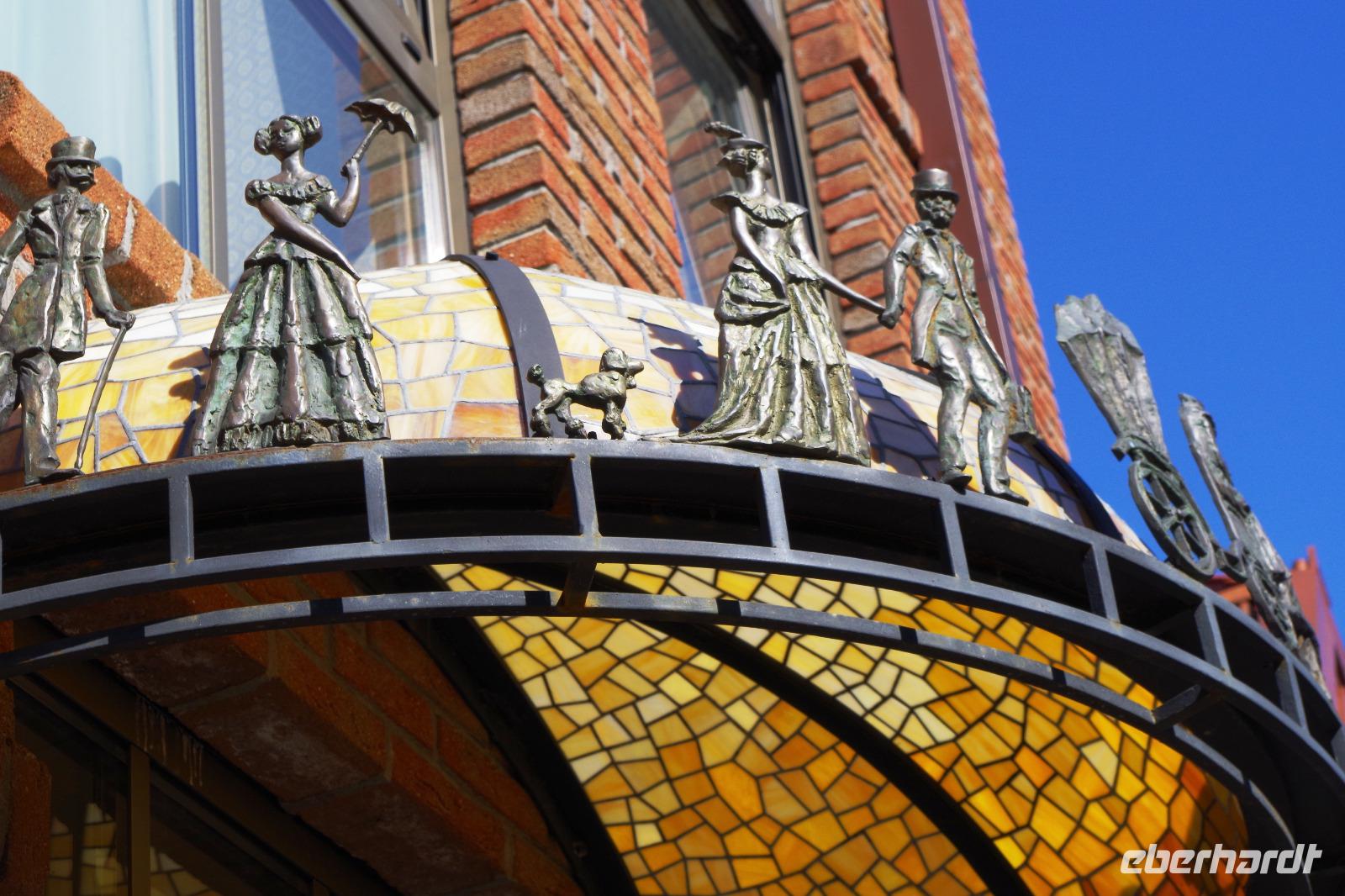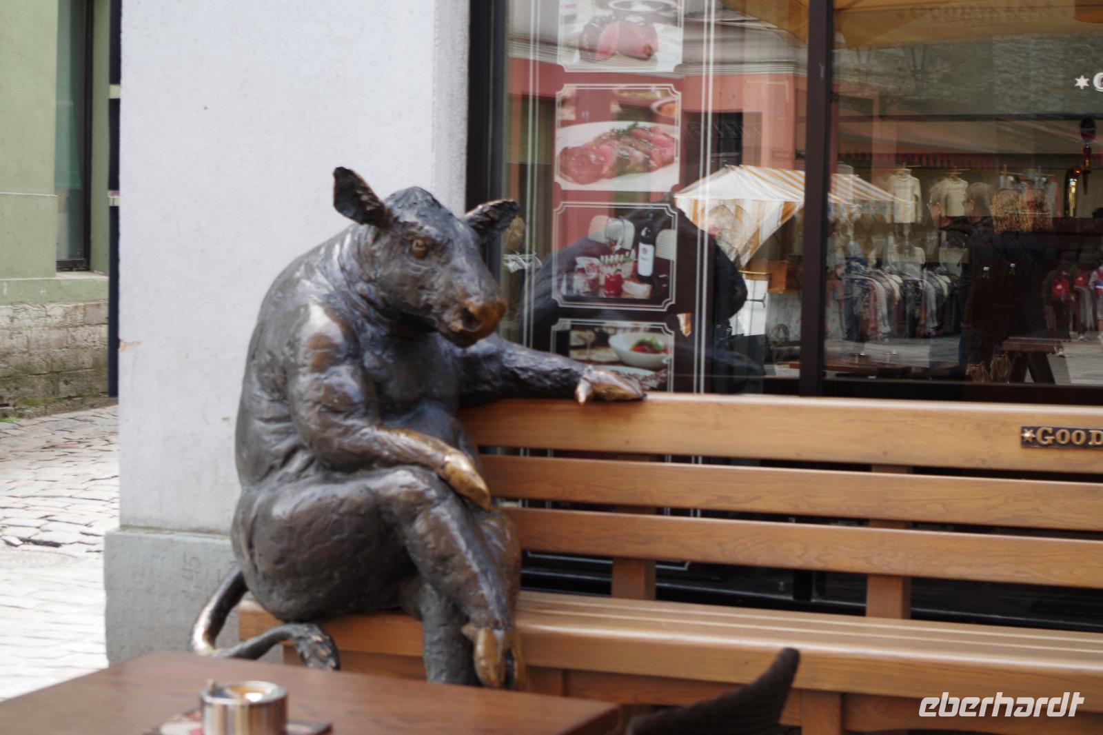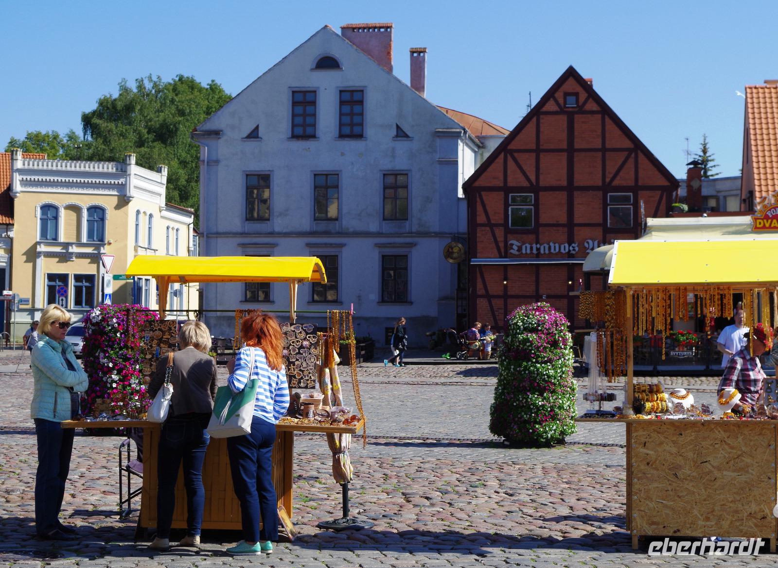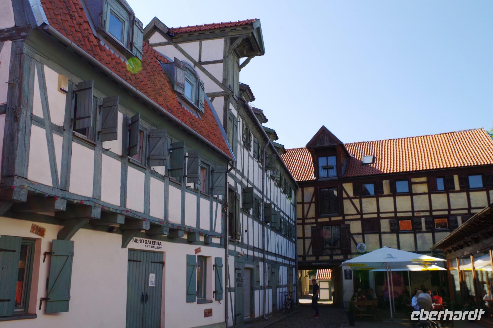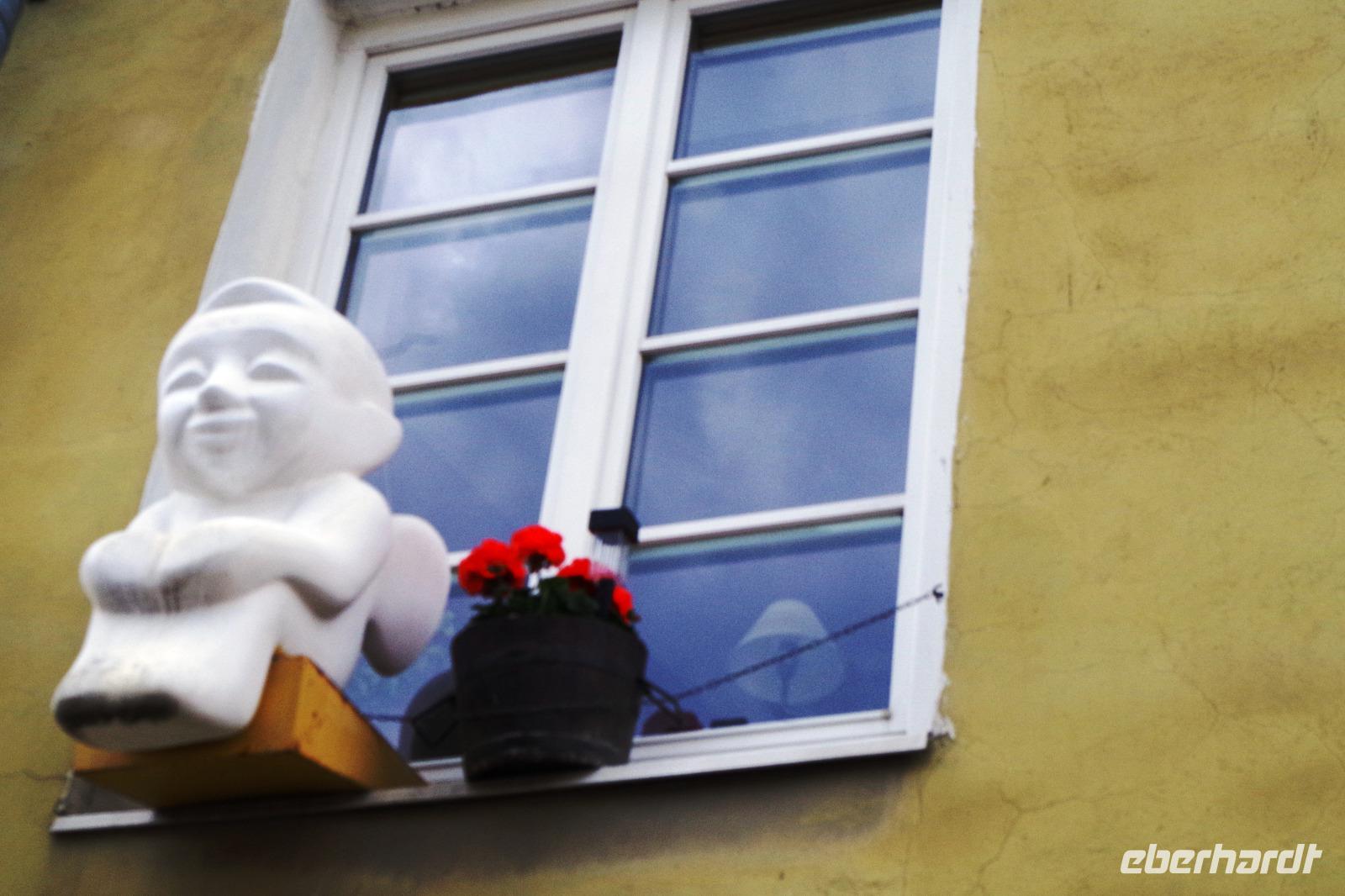 Nachmittags erreichten wir Klaipeda (Memel), die drittgrößte Stadt Litauens an der Ostseeküste. Klaipeda hat als einzigste Stadt Litauens einen Seehafen. 1254 erhielt Klaipeda Stadtrecht. Lange wehrten sich die heidnischen Volksstämme gegen die Fremdherrschaft. 1422 übernahm der deutsche Ritterorden die Macht und über 500 Jahre lang gehörte das Gebiet zum nördlichen Ostpreussen. Ein Jahr lang war Memel sogar provisorische Hauptstadt Preussens. Der Handel blühte, doch versuchten die Hansestädte Danzig und Königsberg diesen Aufschwung zu verhindern. Auch zahlreiche Brände zwangen die Stadt immer wieder in die Knie. 1920 wurde Memel vom Deutschen Reich getrennt (Vertrag von Versailles) und vom Völkerbund verwaltet. Kurze Zeit später erhielt die Region den Status einer Autonomie, die Oberhoheit verblieb aber in Litauen. Dennoch waren die Einwohner auf Kontra mit Litauen. 1944 verkündete Hitler in Memel den Anschluss ans Deutsche Reich und wurde hoch gefeiert. Bis kurz vor Ende des 2. Weltkrieges war Memel weitgehend verschont geblieben, wurde aber in den letzten Kriegsmonaten durch Bomenangriffe und erbitterte Gefechte weitestgehend zerstört. 1948 wurde Memel in Klaipeda umbenannt. Ca. 40.000 Deutsche waren im und nach dem Krieg geflüchtet, an deren Stelle vor allem Russen angesiedelt. Während der Sowjets war Klaipeda Sperrgebiet, da Rüstungszentrum und militär-strategischer Stützpunkt. Bevor wir im Hotel Amberton Klaipeda unsere Zimmer im modernen 21stöckigen K-Flügel bezogen, unternahmen wir einen kleinen Stadtrundgang. Regina zeigte uns die wichtigsten Straßen und Plätze der Stadt. Am Ännchen von Tharau Brunnen vor dem alten Theater stimmte unser Eberhardt-Chor das bekannte Lied an. Wir bummelten durch die engen Gassen der restaurierten Altstadt. Immer wieder entdeckten wir kleine, versteckte Details an den Fassaden und Häuserecken.