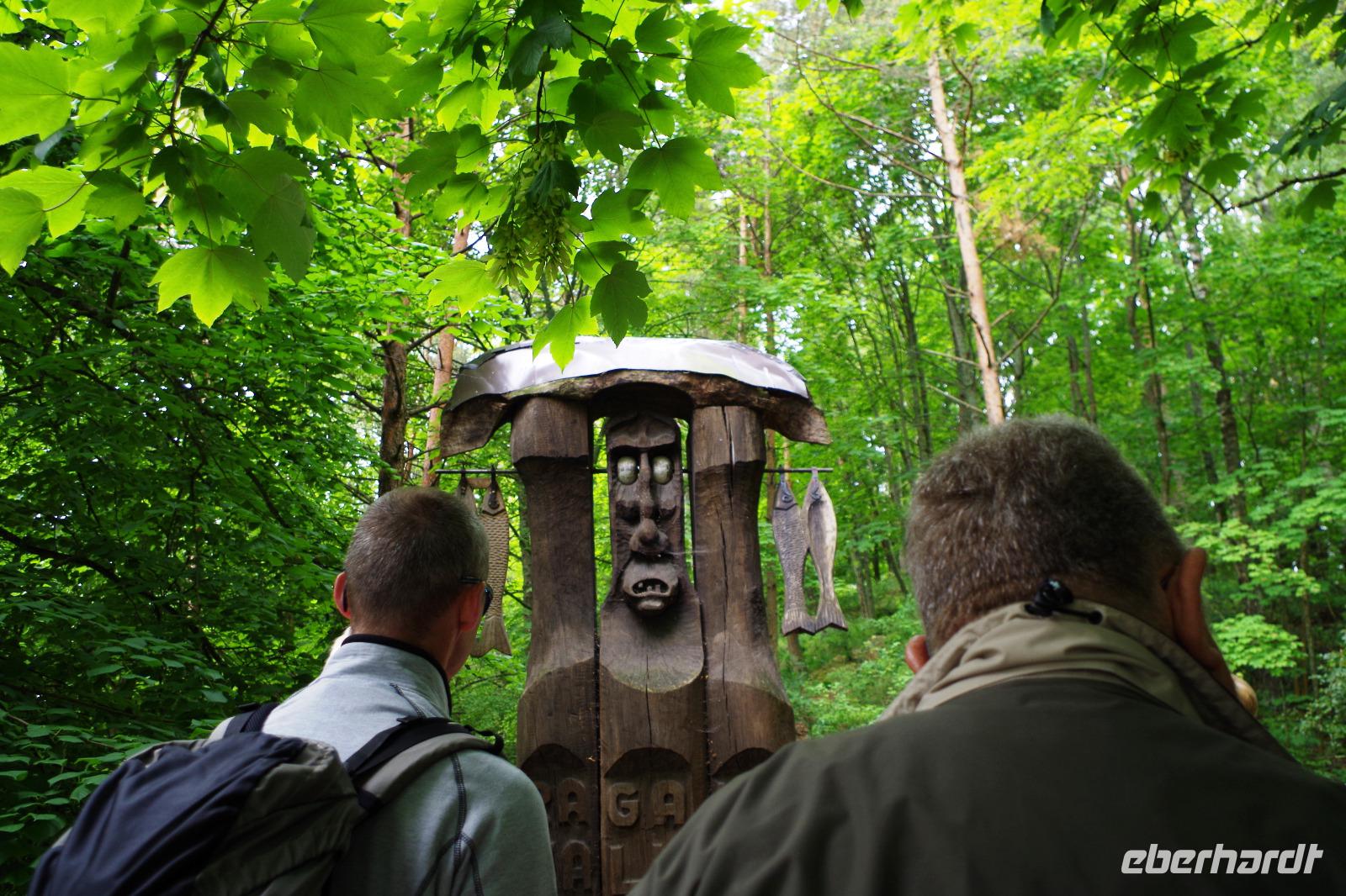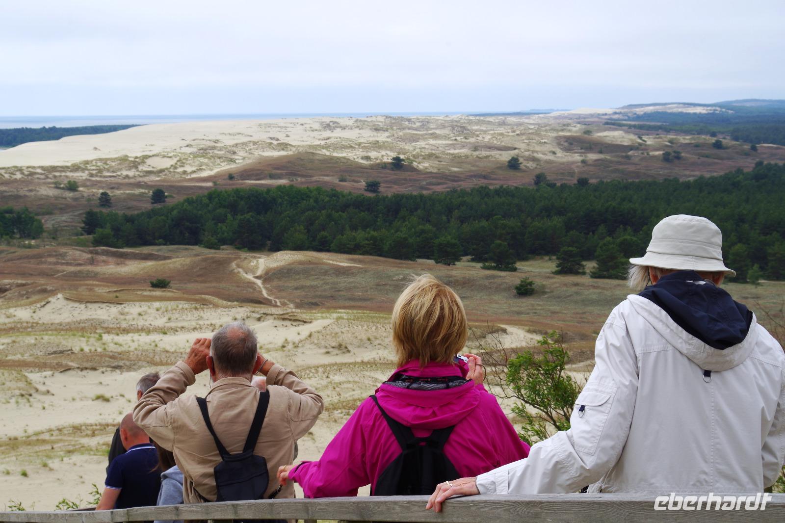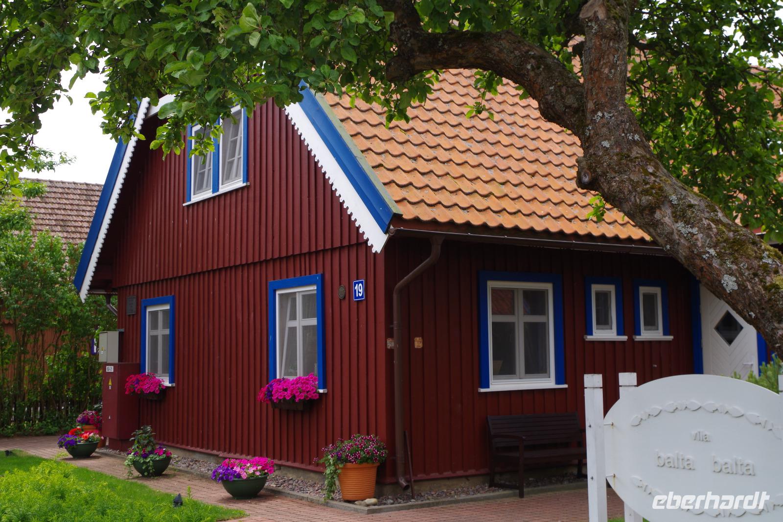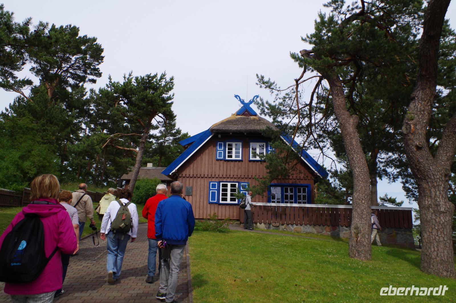 Ein Ganztagesausflug führte uns heute auf die Kurische Nehrung (Neringa). Darauf freuten sich alle, obwohl sich die Sonne noch dezent im Hintergrund hielt. Die Nehrung trennt das Haff (Süßwasser), bis auf die schmale Meerenge bei Klaipeda, von der Ostsee. Somit ist das Haff das größte Binnengewässer Litauens. Die Kurische Nehrung, auch litauische Sahara genannt ist 98 km lang, davon 52 km litauisch, der andere Teil gehört zu Russland. Seit 2002 gehört sie zum Weltnaturerbe der UNESCO. Unweit von Nida (Nidden) befindet sich mit 3,8 km die breiteste Stelle, während die schmalste Stelle bei Lesnoi (russischer Teil) gerade mal 380 m beträgt. Neben der wissenschaftlichen Begründung erzählt auch eine Legende der Riesin Neringa von der Entstehung der Nehrung. Die meisten Ansiedlungen der Nehrung befinden sich auf der geschützten Haffseite. Mit dem Bus fuhren wir zunächst nach Juodkrante (Schwarzort), einer der ältesten Orte der Nehrung. Beim morgendlichen Spaziergang durchstreiften wir den märchenhaften Hexenberg auf einer dicht bewaldeten Düne. Viele Holzskulpturen litauischer Künstler säumen den Weg und erzählen gute und böse Geschichten aus der litauischen Märchenwelt und Mythologie. Weiter ging es zur hohen Düne, wo unser Busfahrer beim Parken sein Können unter Beweis stellte. Auf einem gut befestigten Weg erklommen wir die 52 m hohe Düne, auf deren Gipfel sich eine Sonnenuhr befindet. Von oben eröffnete sich uns ein fantastischer Blick auf die weite Landschaft aus Sand, den rot-weißen Leuchtturm von Nida und auf das Haff. Auch zeigte sich nun auch Klärchen wieder, wenn auch etwas verschüchert und wir hatten schönen Ausblick über die sandige und mit Kiefern bewaldete Nehrung bis auf die russische Seite. Anschließend verbrachten wir unsere Mittagspause in Nida (Nidden), dem reizvollen Fischerdörfchen. Besonders gefielen uns die schönen Holzhäuschen mit den typisch blauen Verzierungen, Holzschnitzereien, in einigen bunt blühenden Vorgärten standen die für Region typischen Kurenkähne. Kleine Restaurants und Cafes luden zum Verweilen zur Mittagszeit ein. Gut gestärkt bummelten wir danach entlang der Promenade, vorbei am Blode-Haus zum Sommerhaus des Literaturnobelpreisträgeres Thomas Mann, welches wir besichtigten. Natürlich durfte bei unserem Ausflug auch ein Besuch des Ostseestrandes, wofür ja die Kurische Nehrung bekannt ist, nicht fehlen. Als Abschluss des Tages genossen wir den herrlichen weißen Sandstrand und das Rauschen der Ostsee. Ein mutiger Reisegast stürzte sich in die Fluten, anderen genügte ein belebendes Fußbad.