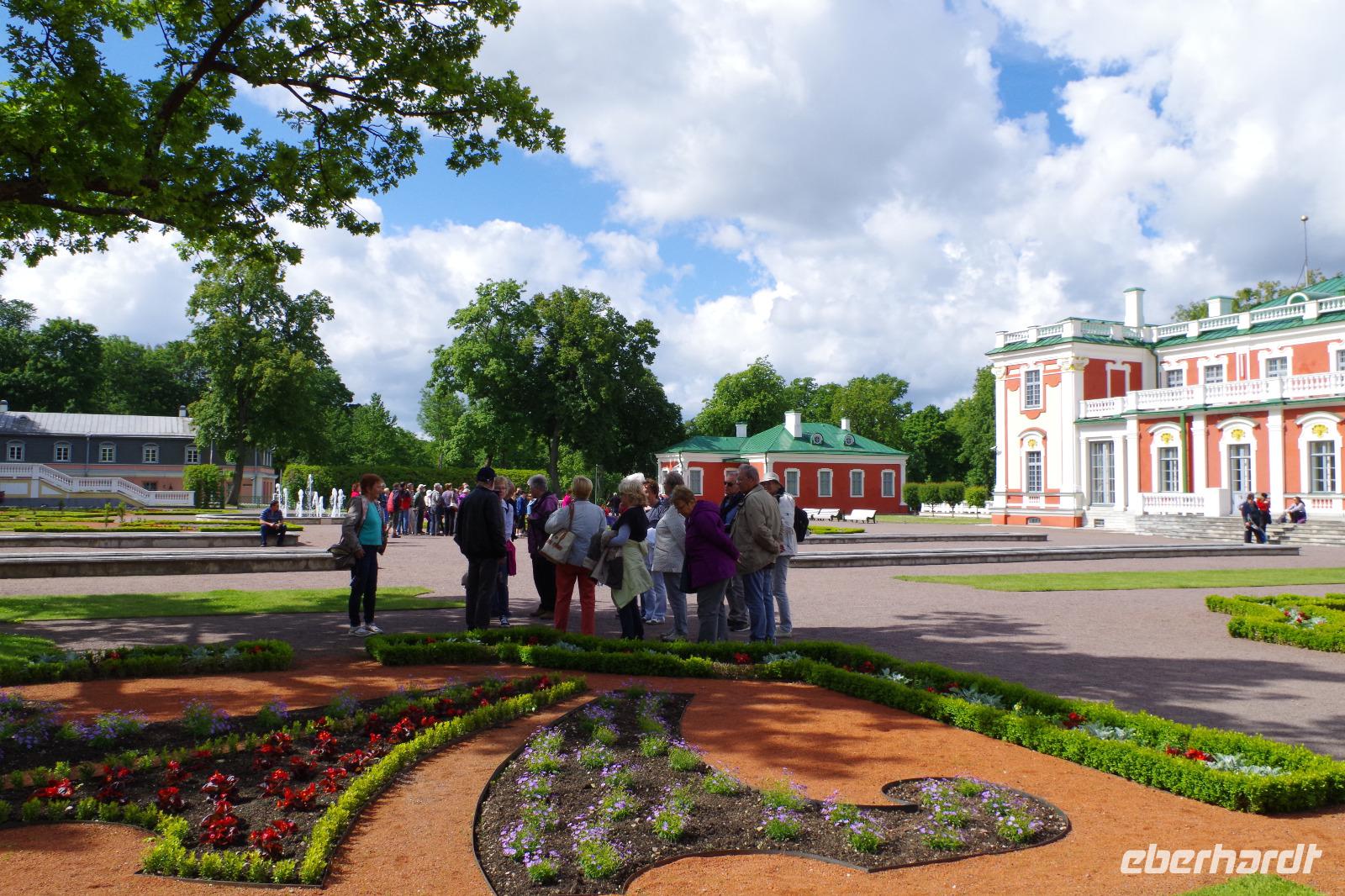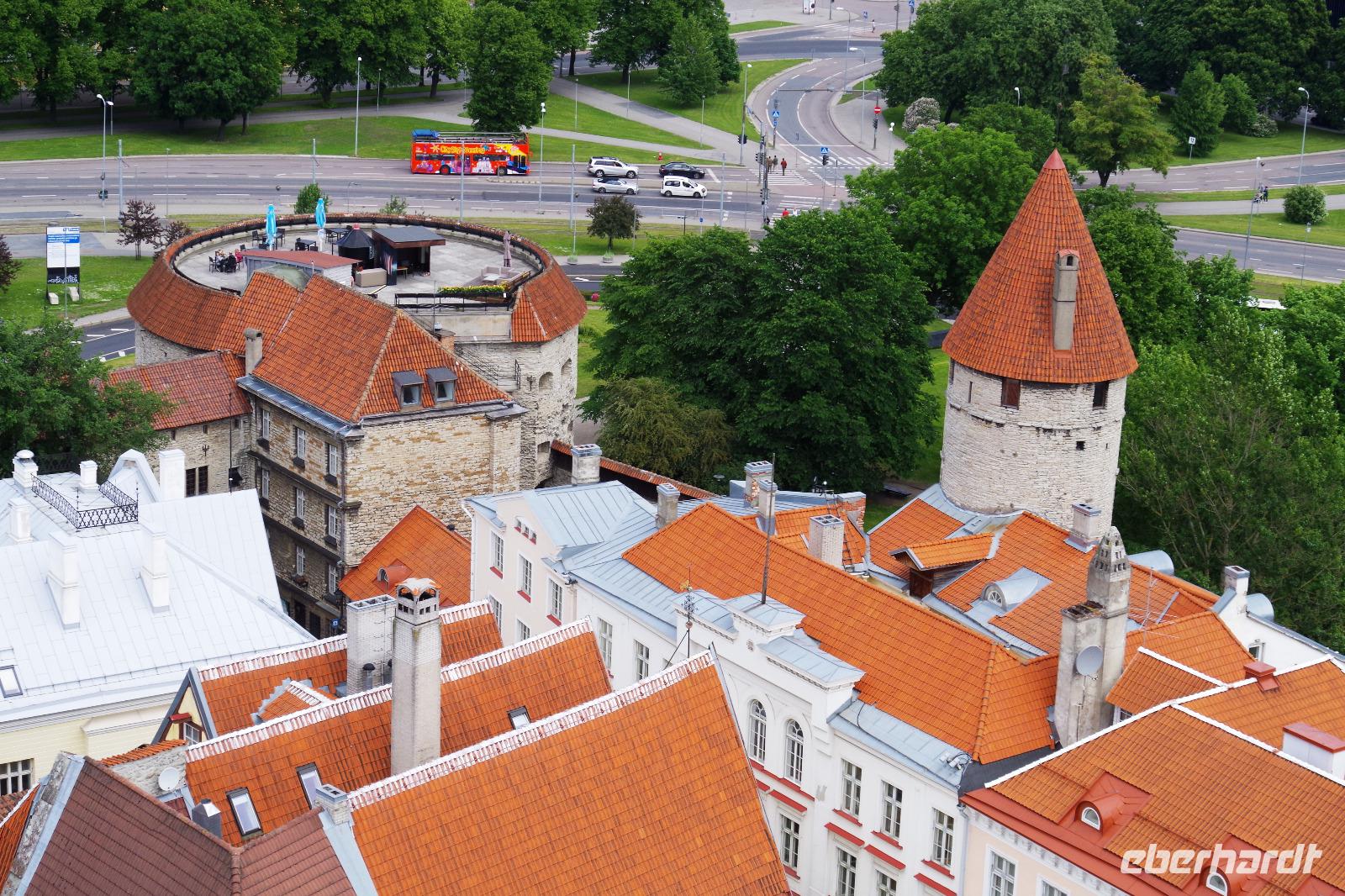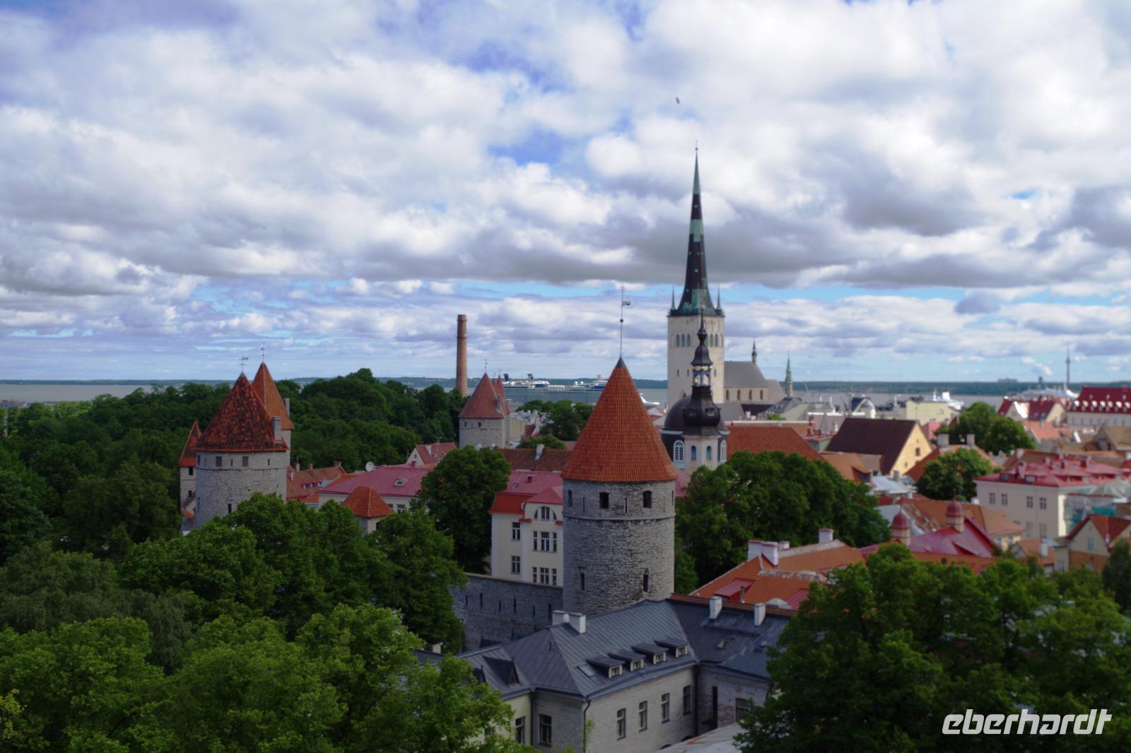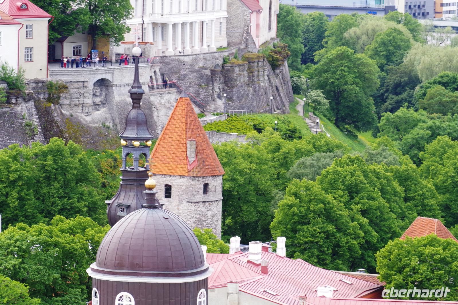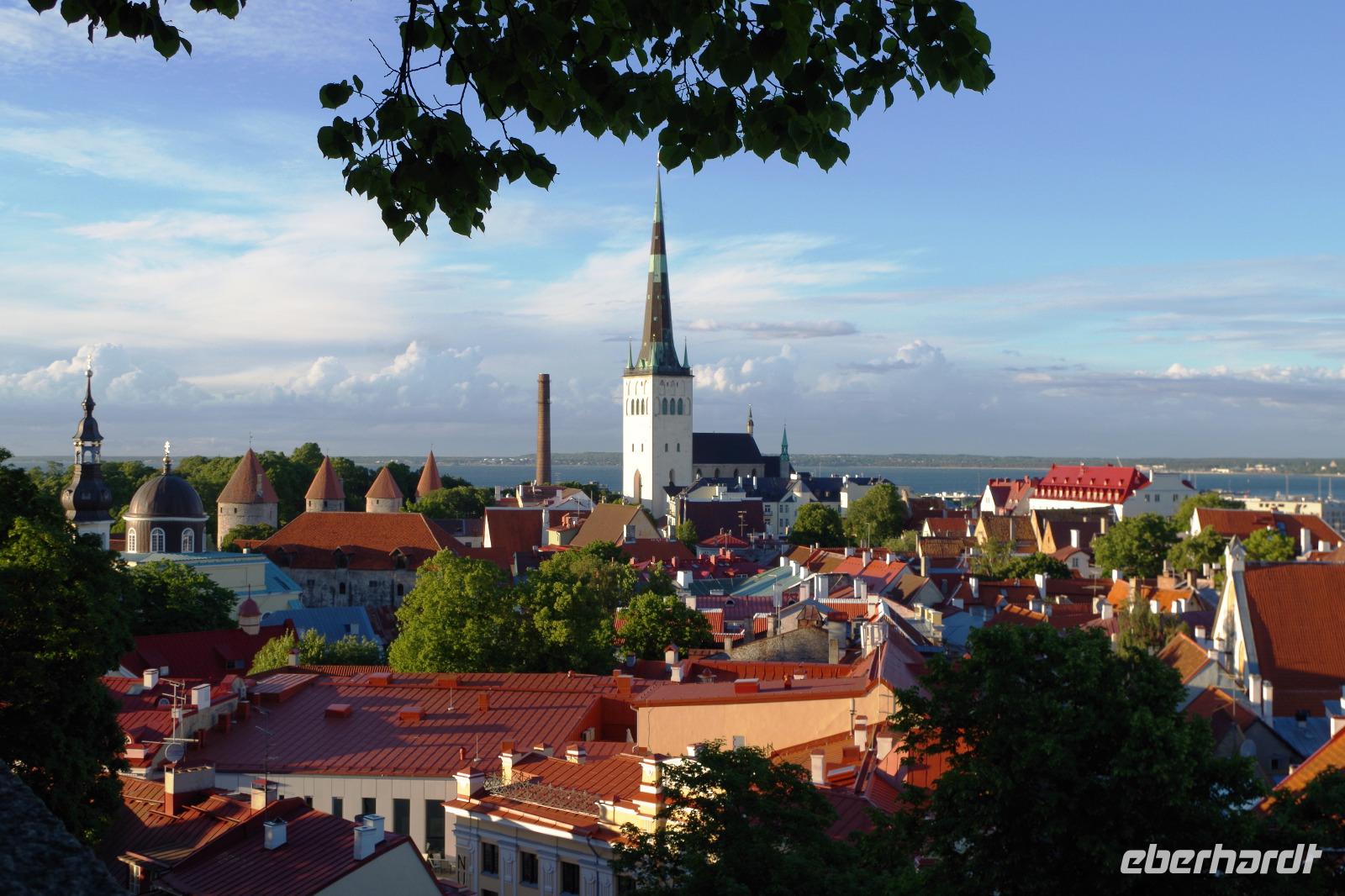 Heute konnten wir ausschlafen und den Tag geruhsam angehen. Bis zum Abflug am Abend hatten wir noch genügend Zeit. Unseren lieben Schweizer Gästen sagten wir Auf Wiedersehen und wünschten ihnen eine erlebnisreiche Weiterreise durch Skandinavien. Für die anderen Gäste wurde noch ein kleines Zusatzprogramm für den späten Vormittag organisiert. Mit dem Bus fuhren wir in den Stadtteil Kadriorg (Katharinenthal) und bummelten durch die riesige Parkanlage, die grüne Lunge Tallinns. Hier ließ Zar Peter der Große eine Sommerresidenz erbauen, die wir von außen besichtigten. Der russische Einfluss prägte auch die restliche Architektur der Siedlung. Viele alte und neue Holzhäuser sind hier zu finden. Wir spazierten zum Präsidentenpalast und am modernen KUMU-Museum vorbei. Dann brachte uns der Bus zur Altstadt, wo wir bis zum Nachmittag noch Freizeit hatten. Einige Gäste erklommen den Turm der Olafskirche (Oleviste). Die Olafskirche hat den höchsten Turm der Stadt. Hinter der Namensgebung dieser Kirche verbirgt sich eine listige Legende, ähnlich dem Märchen vom Rumpelstilzchen. Nachdem man die enge Wendeltreppe (258 Stufen), trotz Gegenverkehr, geschafft hat, wird man oben mit einem fantastischen Panoramablick über die Stadt belohnt. Wie eine Puppenstube präsentierte sich die Stadt von oben, auch der Luxusdampfer Mein Schiff im Tallinner Hafen war auf einmal winzig.