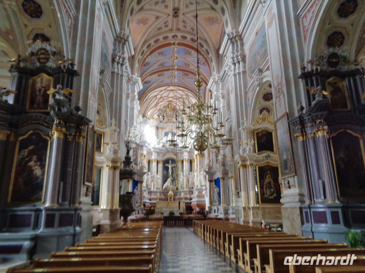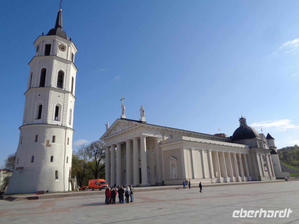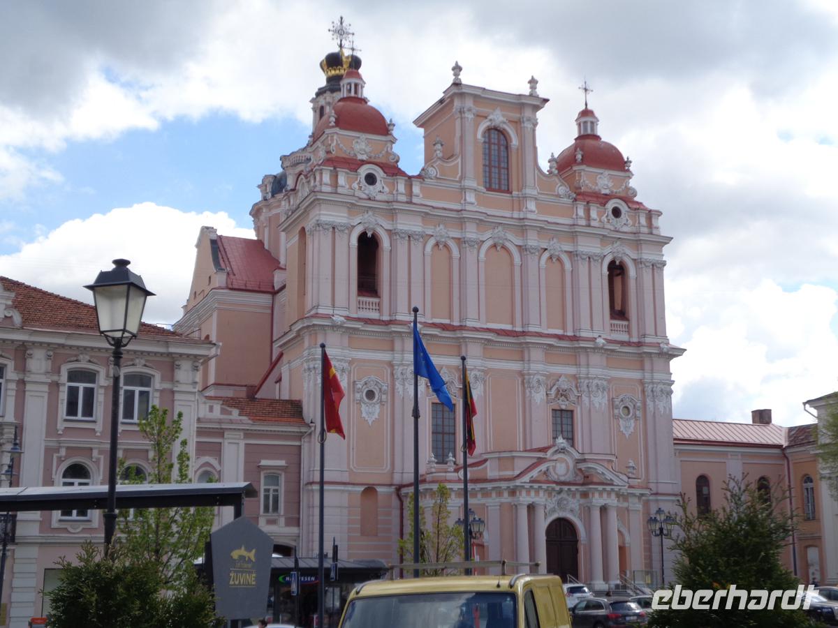 Wir fahren zunächst zu einem Aussichtspunkt, von dem aus wir sehen können, wie die Neris in die größere Memel mündet. Von zwei Seiten durch Flüsse geschützt liegt die Altstadt auf dieser Halbinsel. Da Rolandas im Bus bleiben muss, erläutere ich die Stadt von oben und die Dinge, welche wir gleich bei unserem Rundgang näher betrachten werden. Wir verlassen nahe der Kathedrale den Bus und ich führe die Gäste auch gleich in das Gotteshaus hinein. 1410 war die Grundsteinlegung, just im Jahr der durch Polen, Litauern und Russen gewonnenen Schlacht bei Tannenberg. Die Gotik von außen täuscht über die prachtvolle barocke Ausgestaltung im Innern hinweg. Gleich nebenan gelangen wir auf den Marktplatz mit dem schönen Rathaus, welches wegen seines 5-stöckigen Turmes der weiße Schwan genannt wird. Nach verschiedensten Nutzungen - nur die wenigste Zeit als Rathaus - dient das Gebäude heute als Heiratstempel. Hier ist das Standesamt untergebracht. Rechts daneben befinden Teile der Universität mit einem Priesterseminar einschließlich der Trinitatiskirche. Links steht die imposante Jesuitenkirche in lupenreinem Barock. Der Rest des Platzes ist von schön sanierten Bürger- und Gildehäusern gesäumt.