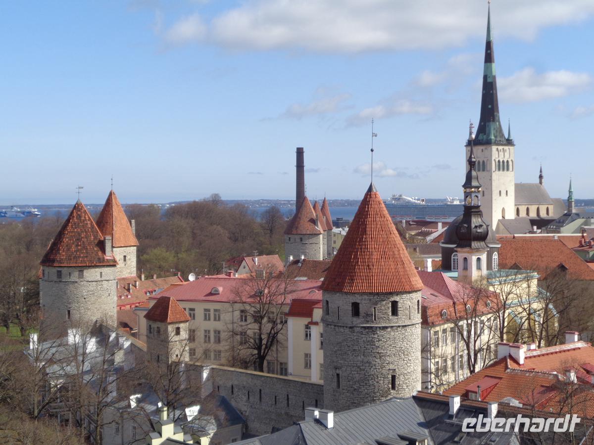 Nach einem sehr reichhaltigen Frühstück geht zieht es uns zunächst durch den von Zar Peter d. Gr. Gegründeten Vorort Kardiorg mit schönen Holzhäusern zur Sängertribüne aus dem Jashr 1960, welche eine der Keimzellen der so genannten singenden Revolution Ende der 80er Jahre war. Auch heute noch treten hier ausgewählte Chöre vor bis zu 25.000 Zuschauern auf. Weiter führt uns unser Weg in den Vorort Pirita, wo 1980 die Segelregatten der Olympischen Spiele ausgetragen wurden. Neben viel sowjetischer Monumentalarchitektur erblicken wir auch die Ruine der riesigen Kirche des 1407 gegründeten Brigittenklosters. Unweit davon haben wir direkt am Wasser einen wundervollen Blick auf die Stadtsilhouette. Wir umkreisen die Altstadt mit dem Bus und bestaunen die noch zu großen Teilen erhaltenen mächtigen Stadtmauern der mittelalterlichen Doppelstadt. Von den ehemals 40 Türmen stehen noch 26. Wir beginnen unseren Fußmarsch in der Oberstadt, bzw. auf dem Domberg. Hier wohnten früher vornehmlich geistliche Würdenträger und Adlige; in der Unterstadt dagegen Bürger und Handwerker, die während der Hansezeit der Stadt Reval, so der deutsche Name zu höchster Blüte verhalfen. Beide Städte waren eigenständig und verstanden sich gar nicht. Die Folge davon war, dass sich beide mit einer jeweils eigenen Stadtmauer umgaben und sich immer mißtrauisch beäugten. In der Oberstadt sehen wir zunächst auf dem Gelände der alten Burg des dänischen Stadtgründers Waldemar II. das Parlamentsgebäude und gegenüber die orthodoxe Alexander Newski Kathedrale. Dieser stammt aus dem 19. Jh., obwohl die Stadt schon von Peter dem Gr. Erobert wurde. Neben der Domkirche aus dem 13. Jh. lassen wir uns von Regina auf dem Weg zu verschiedenen Aussichtspunkten etliche der großen Stadtpalais berühmter Adelsgeschlechter erklären, wie z. B. die der Stenbocks und Uexkülls.