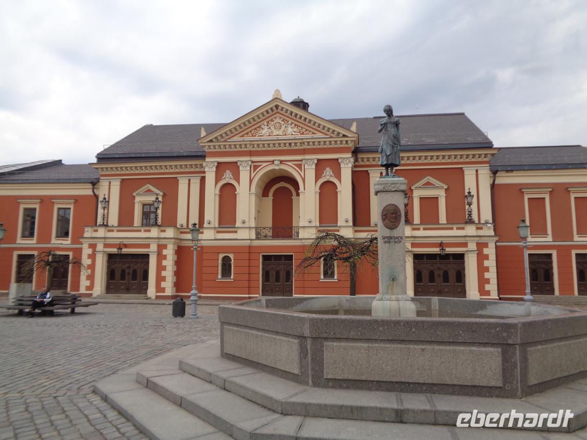 In der Frühe besichtigen wir zunächst die recht überschaubare Altstadt von Memel. Zwar haben die Sowjets nach 1945 sämtlichen Kirchen gesprengt, jedoch ist noch so einiges aus der alten Zeit stehen geblieben. Zum Beispiel das Theater aus dem 19. Jh. vor dem der Simon Dach Brunnen steht, mit der Figur des Ännchen von Tharau. Gemeinsam stimmen wir das bekannte Liebeslied vor dem Brunnen an.