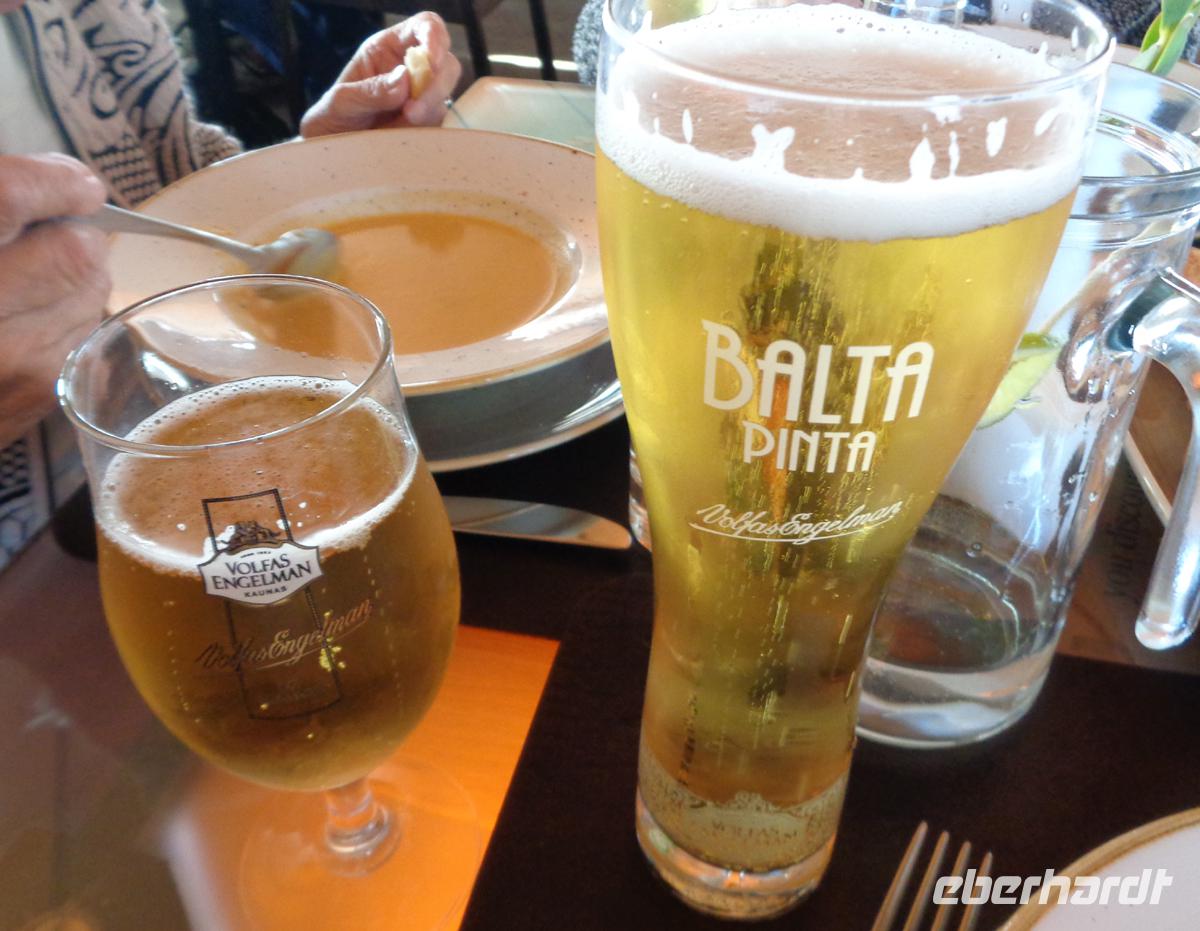 Nebenbei erfahren wir schon erste Dinge über das Leben in Litauen und die Zusammensetzung der Bevölkerung: Vier Völkerschaften und drei Religionen lebten hier seit Jahrhunderten friedlich nebeneinander. Russen, Litauer, Juden und Polen. Orthodoxe und katholische Christen und viele Menschen mosaischen Glaubens. Eine jüdische Gemeinde gibt es immer noch, jedoch ist von den einst 50 Synagogen der Stadt nur eine übrig geblieben. Nach dem ersten Überblick über eine Stadt mit multikultureller Geschichte erreichen wir unser Hotel im Herzen der Stadt: Ein Prachtbau aus dem 19. Jh. Wir beziehen unsere Zimmer und finden uns schnell zum Abendessen ein. Gut, reichlich und lecker kann man nur sagen. Also verhungern muss in Litauen niemand. Und was auch nicht sehr bekannt ist: Die Litauer sind wie alle Balten passionierte Bierbrauer und -trinker. Wir stoßen auf den ersten Abend, unsere heile Ankunft und die weitere Reise mit einem hellen oder dunklen Svyturys (Leuchtturm) an. Svyturys ist Litauens größte Brauerei. Sie wirbt mit dem Jahr 1734. Damals war es jedoch der Memeler Kaufmann J. W. Reincke, welcher sie als Brauerei Reincke daselbst gründete. Mit der ersten litauischen Unabhängigkeit wurde sie 1923 litauisch, dann wieder deutsch, 1945 sowjetisch und 1990 wieder litauisch und heißt seitdem Svyturys. Aber dass dieses Bier unter so verschiedenen Besitzen und Nationalitäten gebraut wurde kann nur heißen, dass es immer schon gut war. Davon konnten wir uns selbst überzeugen und es war ein sehr guter Abschluss unseres ersten Tages.