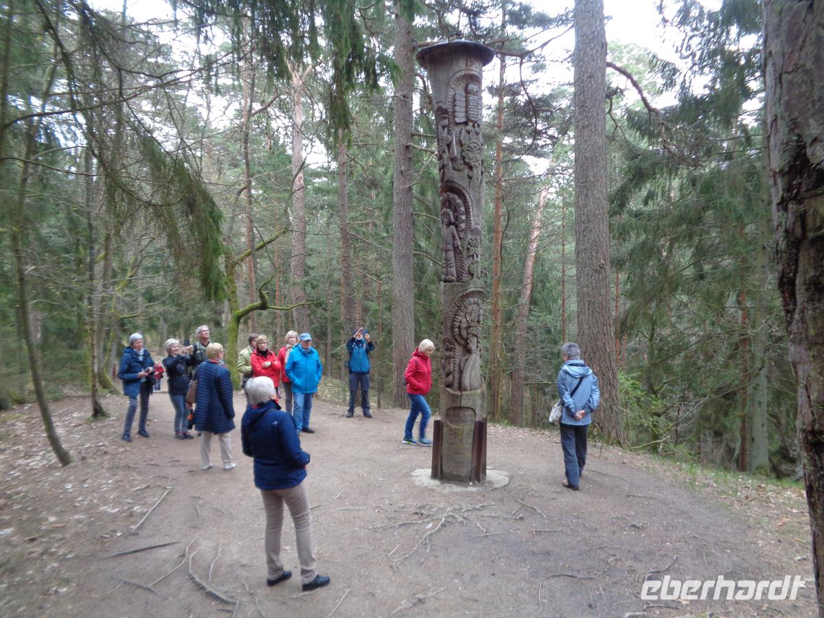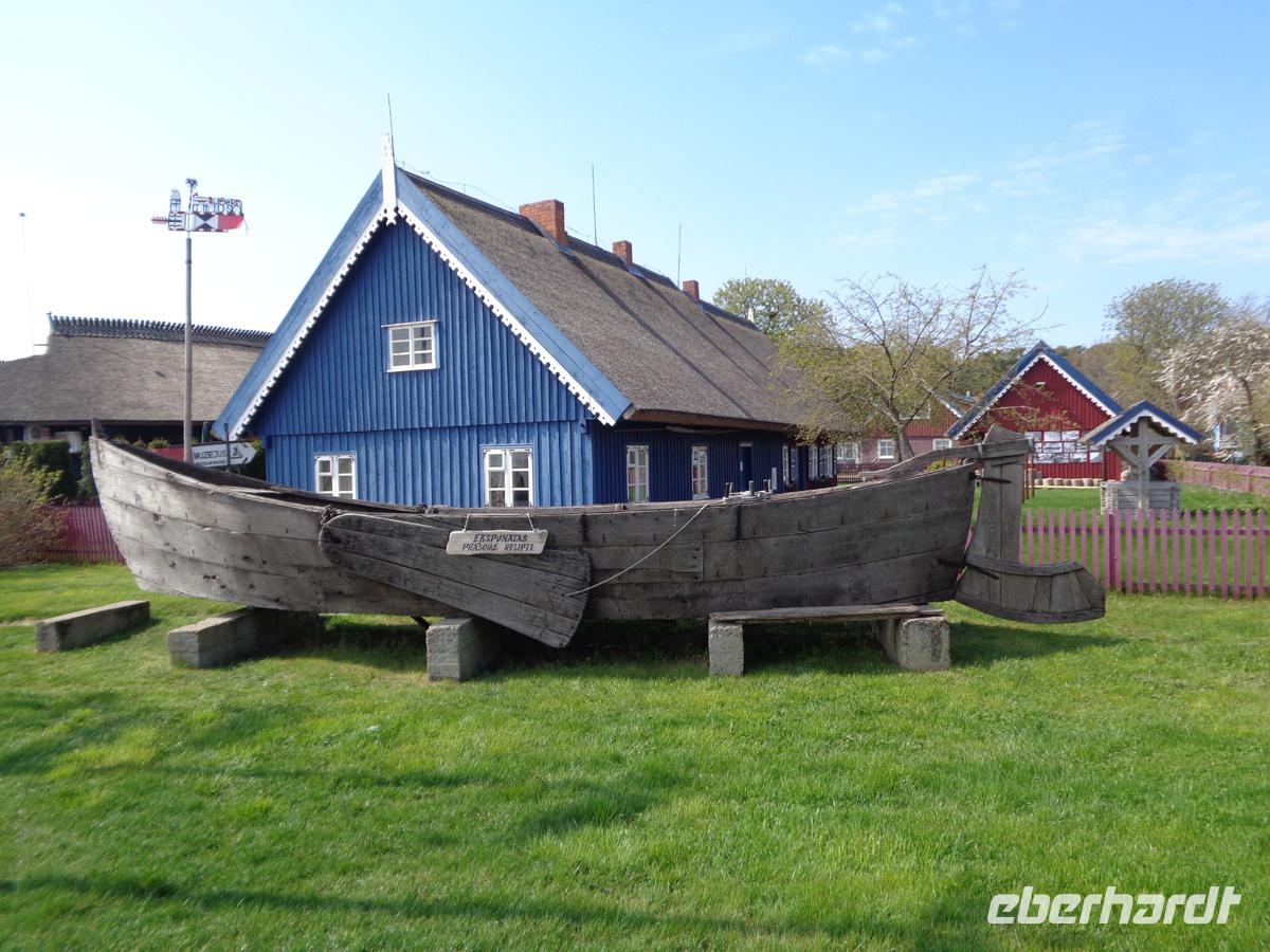Vorbei an der Stelle der Memelburg direkt am Haff fahren wir zur Fähre und setzen in nur 7 min auf die Kurische Nehrung über. Auf der alten Poststraße nach Königsberg gelangen wir zunächst nach Schwarzort, dem heutigen Juodkrante. Auf einem wahrlich verwunschenen Pfad unternehmen wir eine Wanderung über den Hexenberg. Dieser Rundweg ist mit 82 Holzfiguren aus der litauischen Märchen- und Sagenwelt gestaltet, die von ortsansässigen Künstlern gestaltet wurden. Einige der Märchen werden von Regina gekonnt erzählt. Unser Weg führt uns weiter zur Hohen-, oder Parniddendüne. Von hier oben sieht man nicht nur die Ostsee und das Haff, sondern blickt auch in das nur ca. 3 km entfernte Russland hinein. Oben steht eine große Sonnenuhr, deren Beschädigungen durch einen Sturm mittlerweile repariert sind. Am Fuß der Düne bieten Bernsteinhändler ihre Ware feil. Der ist hier günstiger als in Wilna oder Kaunas und erst recht Estland oder Lettland. Nachdem wir eine Weile durch den berühmten Ort Nida, früher Nidden geführt worden sind, kehren wir in unserer Freizeit in eines der vielen Restaurants ein, um uns mit süßen oder herzhaften Speisen etwas zu stärken. Der Ort ist voller Schiffswimpel, die früher auf den Masten der Kurenkähne steckten. Jeder Fischer hatte sein individuelles und Regina erläutert uns die Bedeutungen. Wir durchqueren den Ort der Länge nach und gelangen zum Sommerhaus von Thomas Mann, das seinerzeit nur mit einer Kutsche zu erreichen war. Ihm waren jedoch nur drei Sommer von 1930-32 hier vergönnt, bevor er in die USA auswanderte.