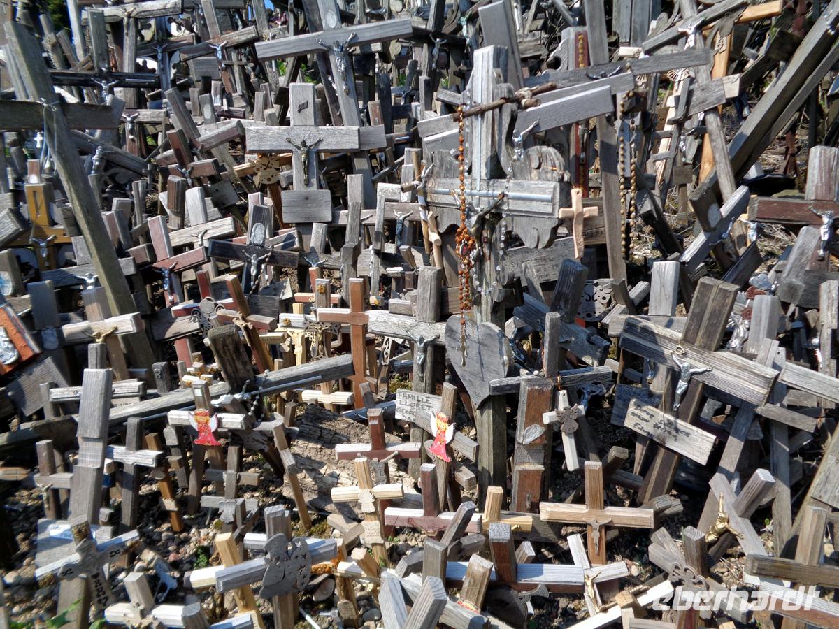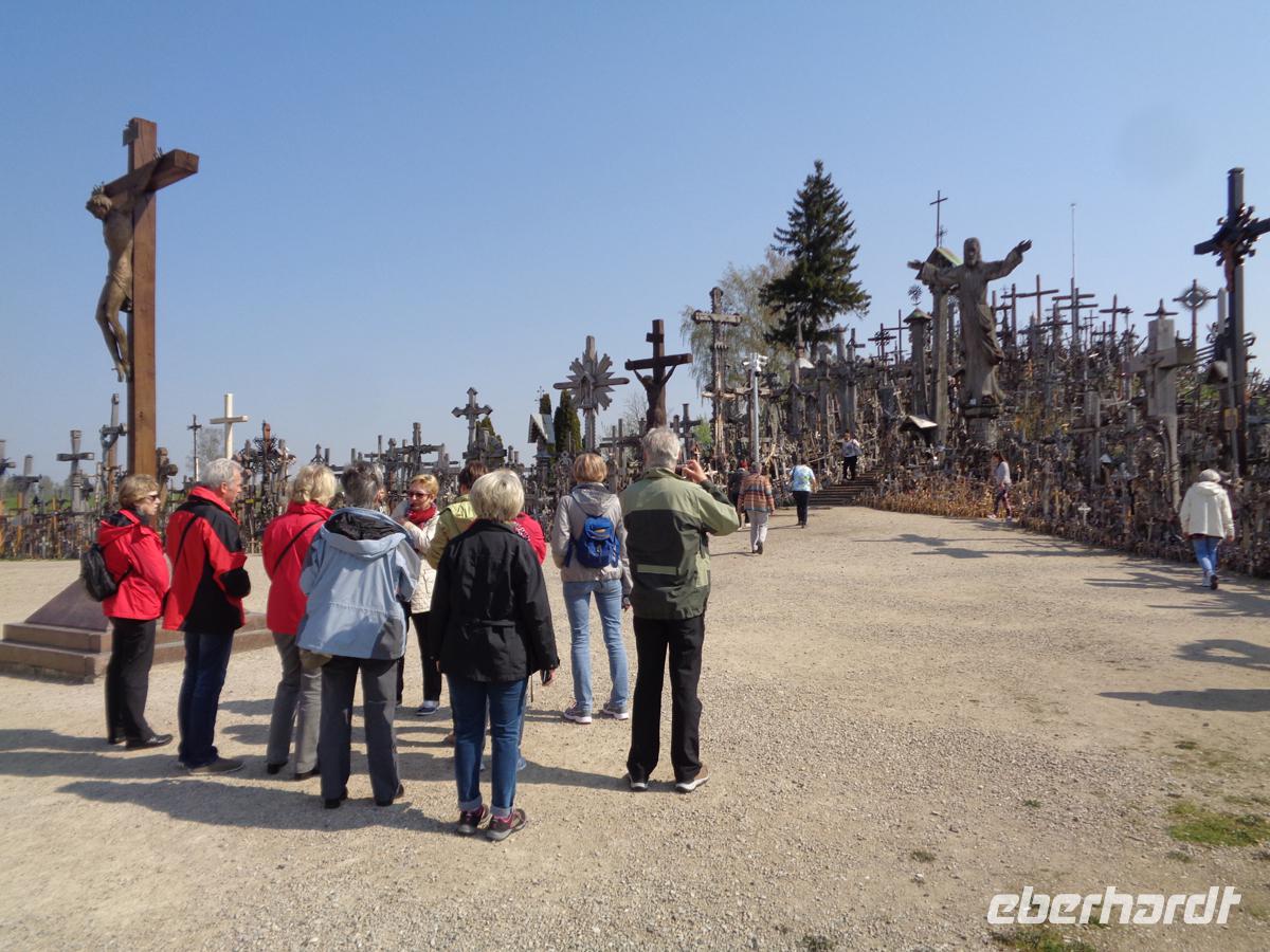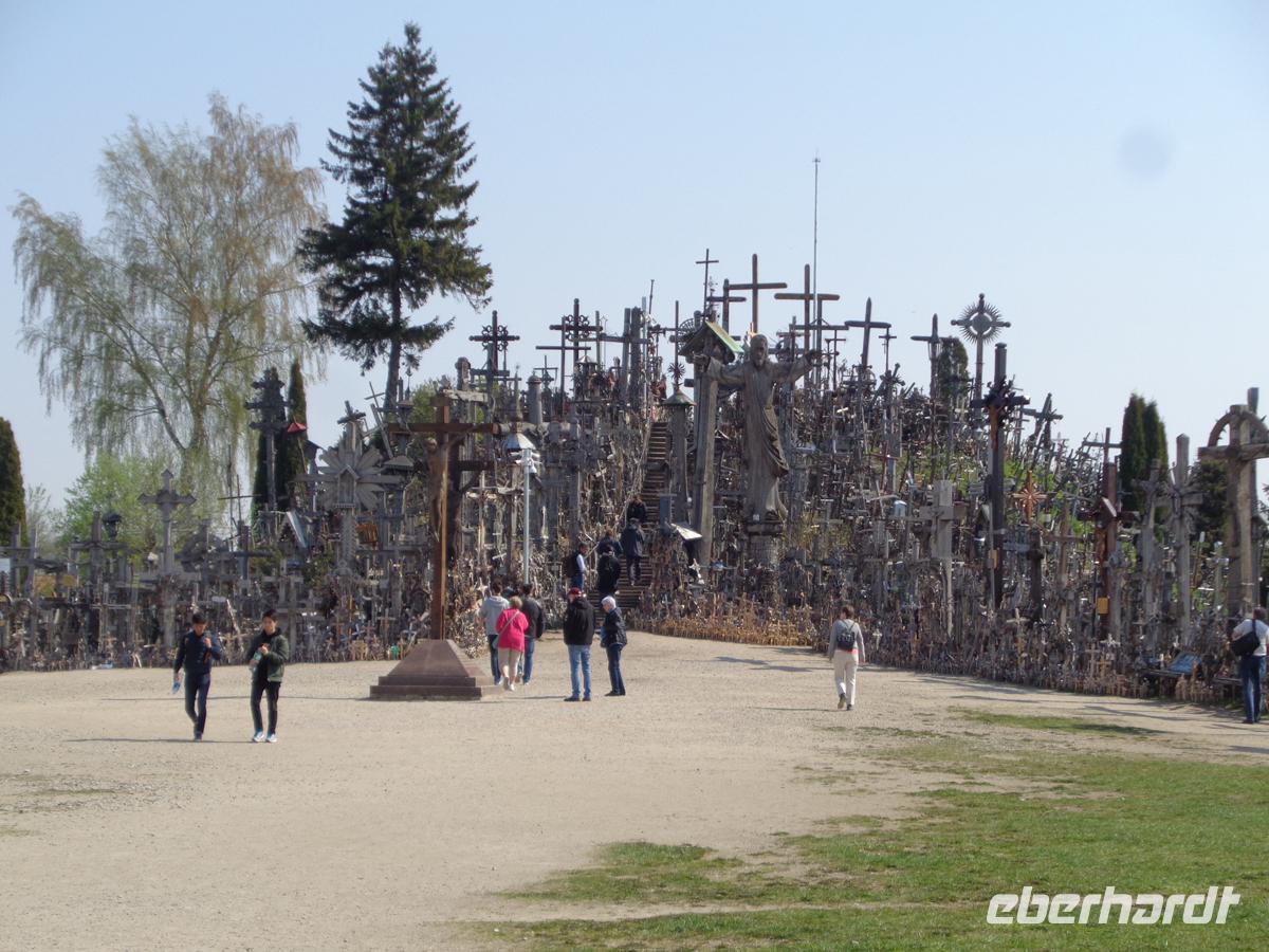 Wir verlassen Memel über die Lindenstraße in der historischen Neustadt. Hier steht noch das gewaltige Postamt aus wilhelminischer Zeit und wirkt wie eine Burg. Viele Namen hat die Straße nach den jeweiligen Herrschern schon gehabt. Benannt nach Zar Alexander, Hitler, Lenin, heißt sie heute auf Litauisch wieder Lindenstraße, wie zuerst auch auf Deutsch. Gegen Mittag erreichen wir den wohl wichtigsten Wallfahrtsort des überwiegend katholischen Litauens, den Berg der Kreuze. Hier soll sich eine von den Kreuzrittern zerstörte Burg befunden haben, aber womöglich befand sich schon in grauer Vorzeit eine heidnische Kultstätte auf dem weithin sichtbaren Hügel. Die ersten Kreuze begann man hier für die Opfer der Aufstände gegen das zaristische Russland aufzustellen, später auch für die Deportierten in der Sowjetzeit. Doch je häufiger die jeweiligen Machthaber die Kreuze abräumten und verbrannten, desto mehr wurden es hinterher von Mal zu Mal. Und so entwickelte sich der Hügel nicht nur zu einer Manifestation tiefer Volksfrömmigkeit, sondern auch zum starken Zeichen des Widerstands gegen die Usurpatoren. Vor einigen Jahren hat man eine Zählung der Kreuze versucht, Diese jedoch bei 50000 abgebrochen.