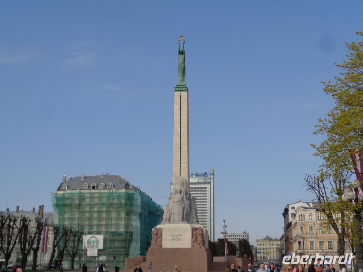 Am Nachmittag erreichen wir Riga, mit 700000 Einwohnern die größte Stadt des Baltikums und Hauptstadt Lettlands. Unser Hotel befindet sich direkt am Altstadtrand und hat alles, was 4 Sterne im Zentrum einer Kapitale ausmachen sollte. In Sichtweite liegen die ausgedehntesten Markthallen Europas, die auch Morgen, am Unabhängigkeitsfeiertag geöffnet haben. Nach dem Zimmerbezug und ein wenig Frischmachen verleitet uns die superzentrale Lage dazu, gleich mal einen kleinen Bummel durch die Stadt zu machen. Geführt von Regina beschauen wir uns das mächtige Opernhaus, und schlendern an den Stadtgräben der ehemaligen Bastionen entlang bis zur Freiheitsstatue, dem vermutlich wichtigsten Denkmal Lettlands, welches schon aus der Zeit der ersten Unabhängigkeit stammt. Es wird durch eine Ehrenwache permanent im Auge behalten. Langsam schlendern wir zurück, und lassen linker Hand den Pulverturm der ehem. Stadtbefestigung stehen. Die Gruppe löst sich langsam auf, weil die vielen Geschäfte doch schnell mal zu Reinschauen locken. Kaum haben wir erfahren, daß Riga auch eine berühmte Schokoladenstadt ist, vor allem mit der Traditionsmarke Laima, da erblicken wir auch schon einen Laden voll mit diesen Köstlichkeiten. Schon sind etliche von uns darin verschwunden.