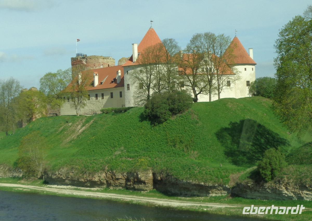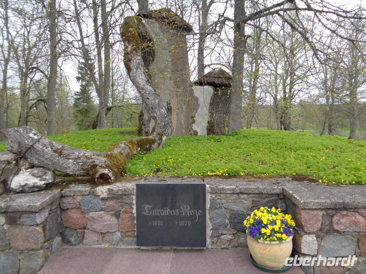 Nur einen guten Kilometer entfernt befindet sich die Bischofsburg Turaida hoch über dem Tal der Gauja. Anstelle einer livländischen Holzburg wurde sie Anfang des 13. Jh. von Rigaer Bischof in Stein errichtet. Erklimmt man den 30 m hohen Bergfried, eröffnet sich ein atemberaubender Ausblick auf die bewaldeten Flächen der Umgebung. Im Vorfeld der Anlage befindet sich zum einen eine der ältesten Holzkirchen Lettlands aus dem Jahr 1750 und das Gelände eines alten Friedhofs. Der ist nicht mehr vorhanden, aber eine Gedenktafel für die berühmteste Betattete hier: Die Rose von Turaida. Eine wunderschöne Jungfrau, welche, um ihre Ehre zu retten, für Ihren Versprochenen mit einer List in den Tod ging, nur um nicht von Söldnern entehrt zu werden. Die Aussage dahinter: Lieber ehrenvoll sterben, als sich schmachvoll ergeben. Jedes Lettische Schulkind kennt die Legende von Maja und Viktor, in der sich ein historisch verbriefter Kern aus dem Jahr 1620 verbirgt.