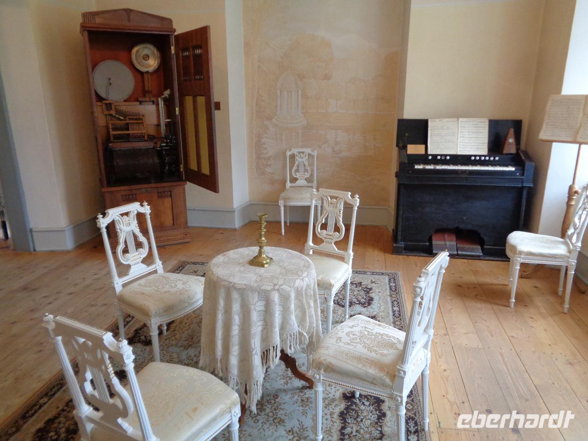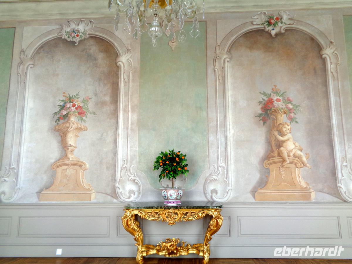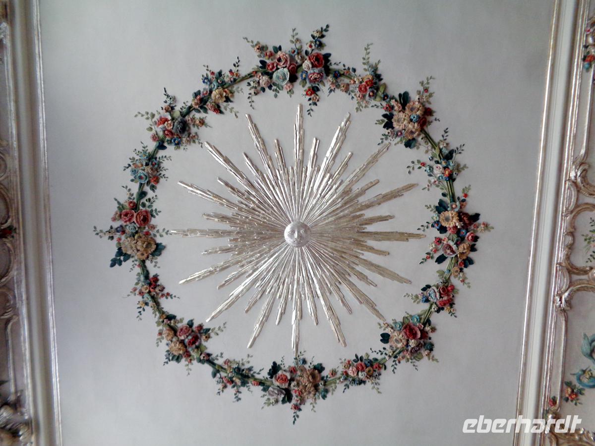Wir bekommen eine sehr detailreiche Führung durch viele der 138 Räume und sind erstaunt, wie viel man wieder schön restauriert und rekonstruiert hat. Angefangen vom Goldenen Saal für Audienzen, den weißen Saal mit überbordenden Stuckarbeiten, welcher als Ballsaal genutzt wurde, bis hin zu den Privatgemächern des Herzogs und seiner Gattin. Mir hat es am meisten das Rosenzimmer angetan, an dessen Wänden sich 21 bunte Blumengirlanden aus Stuck herunterranken.