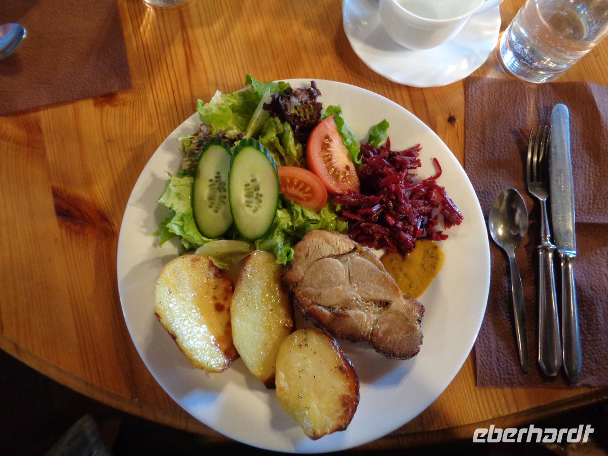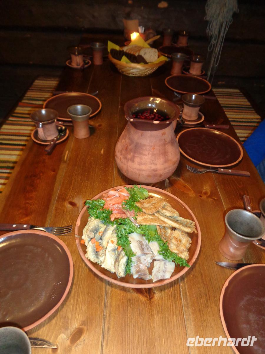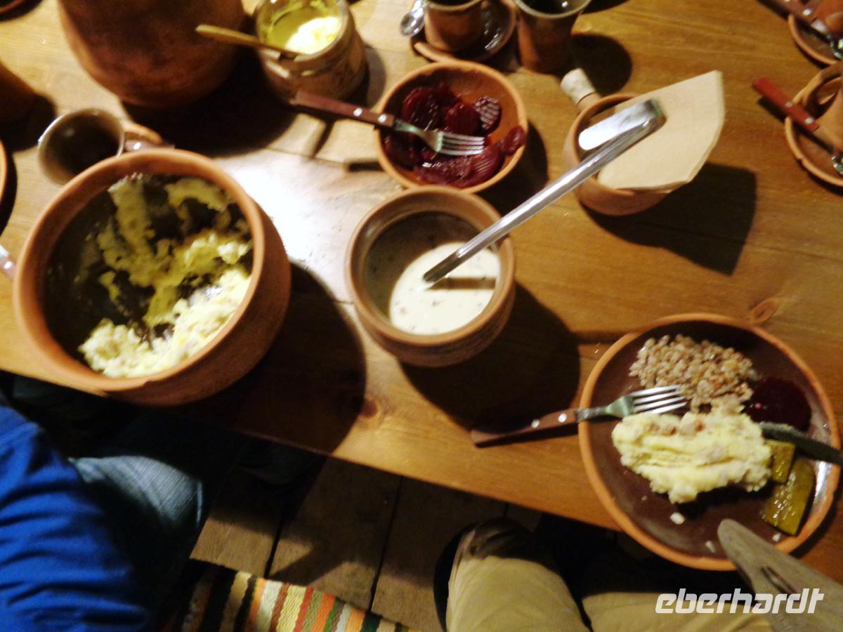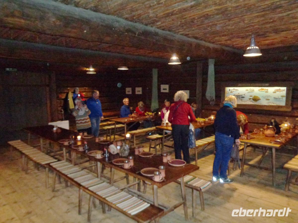 In einem der stohgedeckten Bauernhäuser werden wir zu einem nahrhaften Mittagsmahl geladen. Es gibt Fisch, Graupen mit Speck, würzigen Kartoffelstampf, Waldpilze in Rahmsoße und Blaubeerkuchen.