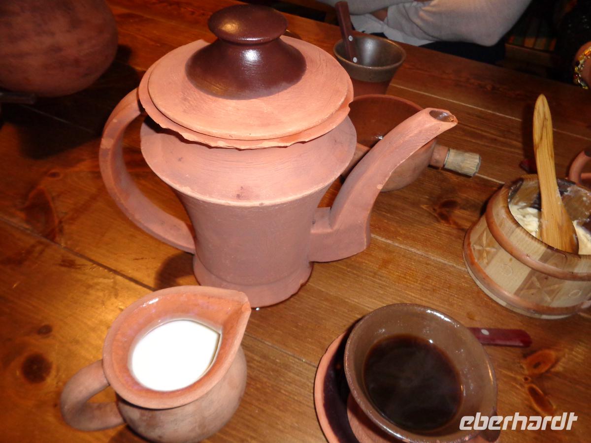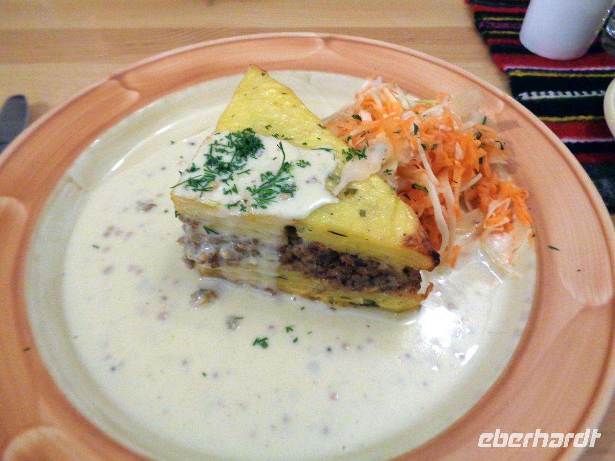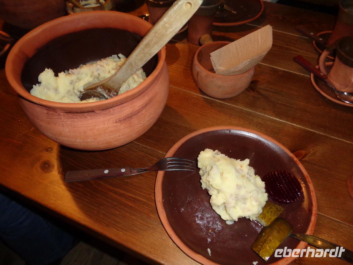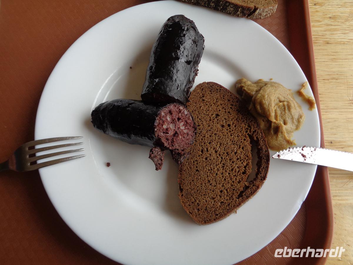 In einem der stohgedeckten Bauernhäuser werden wir zu einem nahrhaften Mittagsmahl geladen. Es gibt Fisch, Graupen mit Speck, würzigen Kartoffelstampf, Waldpilze in Rahmsoße und Blaubeerkuchen.