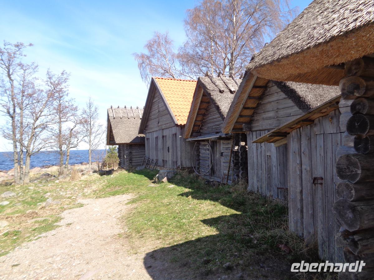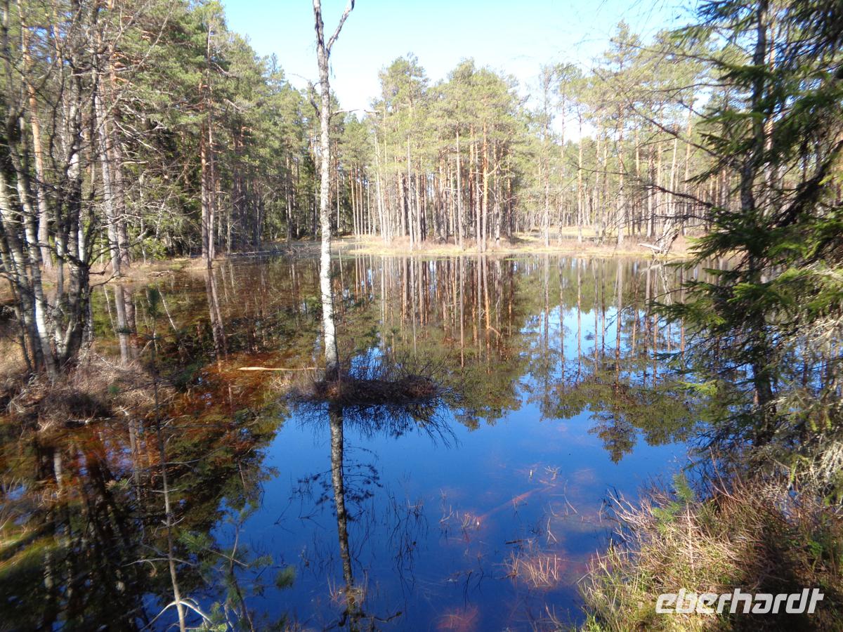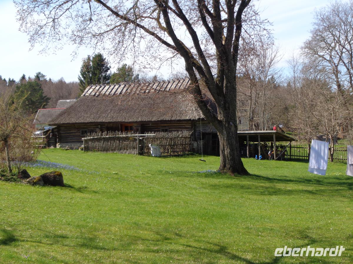 Eine gute Stunde Fahrt benötigen wir von Tallin aus in den ältesten und größten estnischen Nationalpark. Ein Drittel des Parks ist Meer. Weil es noch recht feucht und kalt ist, verschieben wir unseren Moorspaziergang auf den Nachmitteg und ziehen die Inaugenscheinnahme zweier Gutshäuser vor. Estland war voll mit Landgütern. Ca. 2000 zählte man vor dem 1. Weltkrieg. Oft gingen sie bis ins 13. Jh. auf livländische Rittersitze zurück. Viele wurden ab dem 18. Jh. prächtig im barocken oder klassizistischen Stil umgestaltet. Spätestens 1939 kam das Ende und die meist deutschen Besitzer mussten ihre Güter und Ländereien verlassen. Heute versucht man viele dieser Häuser zu restaurieren, wenn das noch möglich ist, und oft einer touristischen Nutzung zuzuführen. In Palmse ist das sehr gut gelungen. 1676 kam das Gut in den Besitz der Familie von Pahlen, deren Nachfahren heute in Deutschland leben. Wir bekommen eine Führung durch das Haus und können uns an der Einrichtung erfreuen, die vom Empire über Biedermeier bis zum Historismus reicht. Das Gut verfügte auch über eine Orangerie und im schön angelegten Garten mit Badehaus und Pavillon kann man sich gut ergehen. Verschiedene Wirtschaftsgebäude gehören zum Gut von denen ein Teil der Stallungen heute ein Hotel birgt. Ein weiteres Gut des deutschbaltischen Adels sehen wir mit Gut Sagadi, das sich ab ca. 1750 im Besitz der Familie von Fock befand. Wir betrachten es von außen, denn es ist ein Schulungszentrum der staatl. Forstverwaltung darin untergebracht. Die ehemaligen Stallungen beherbergen neben einem Hotel auch ein Forstmuseum. Hiernach unternehmen wir einen ersten Spaziergang durch den Wald des Nationalparks, der im Wesentlichen aus dicht stehenden Kiefern und Fichten besteht, und von zahlreichen Bächen durchzogen wird. Am Altja-Fluss gibt es einen Biber Lehrpfad, den wir ein Stück entlang gehen. Der Wald ist recht verwunschen und man geht weich wie auf einem Teppich. Den Biber sehen wir zwar nicht, dafür machen wir uns auf nach Altja, einem ursprünglichen Bauern- und Fischerdorf. Einige der Häuser hier sind noch in Blockbauweise errichtet und mit Reet gedeckt. Um hierher zu finden sollte man schon eine gute Straßenkarte haben. Die Straßen sind sehr schmal und beidseitig von dichtestem Urwald gesäumt. Tina berichtet, dass es in dem kleinen Estland 600 wilde Braunbären gibt und viele Wölfe noch dazu. Gerade hatte ich überlegt, wie toll es wäre, hier einmal Pilze zu sammeln. Nun denke ich daran, wieviele Augen einen dabei wohl beobachten?