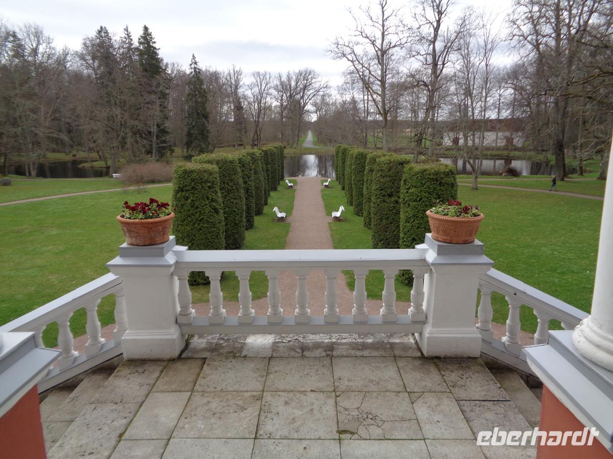 Zum Schloß gehört auch ein von Rastrelli entworfener 10 ha großer französischer Garten, der wie im Barock üblich, streng geometrische Formen mit weiten Sichtachsen auf das Schloß aufweist. Der Garten beinhaltet einen sehr großen Rosengarten mit historischen Sorten, u. a. die „Ännchen von Tharau Rose" aus der 2. Hälfte des 19. Jh. Die Rosen blühen zwar im Mai noch nicht, dafür werden unsere Augen mit Tulpen, Narzissen und anderen Frühlingsblühern erfreut.