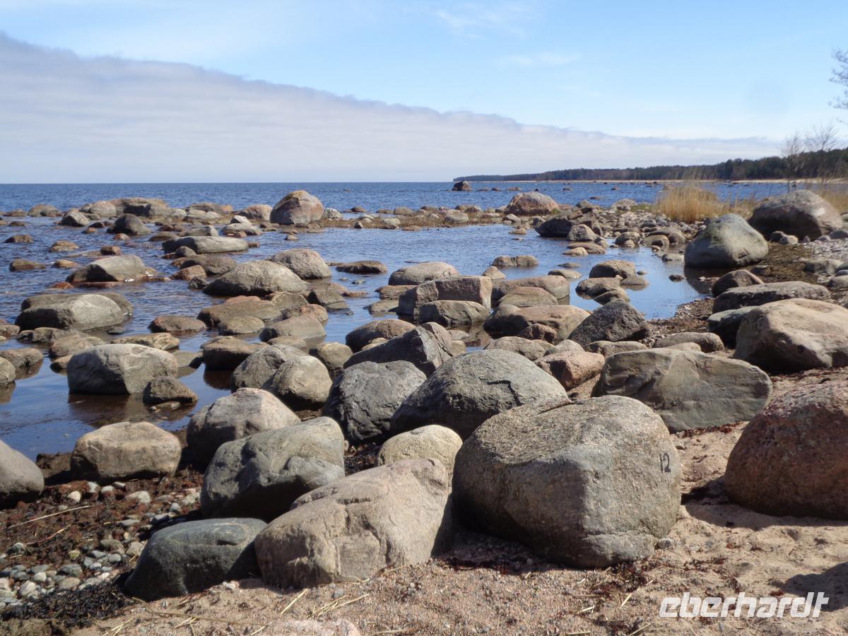 In Altja begeben wir uns zunächst zum Ufer der Ostsee. Die Gletscher der letzten Eiszeit haben hier eine Unmenge an Findlingen hergeschoben. Manche fast so groß wie eine Gartenhütte. Weit geht unser Blick aufs Meer hinaus, an dessen anderem Ufer Finnland liegen muss.