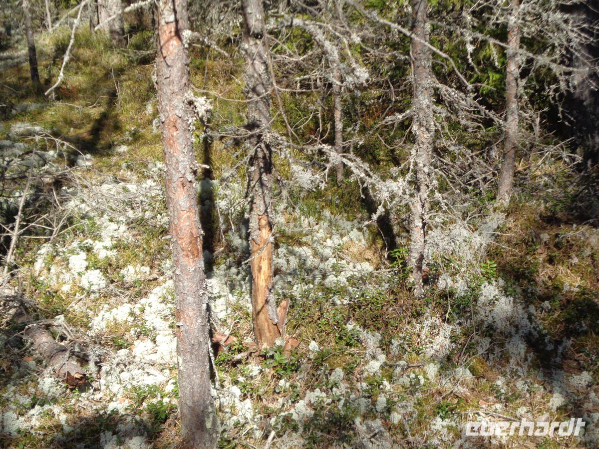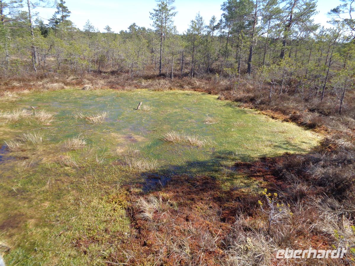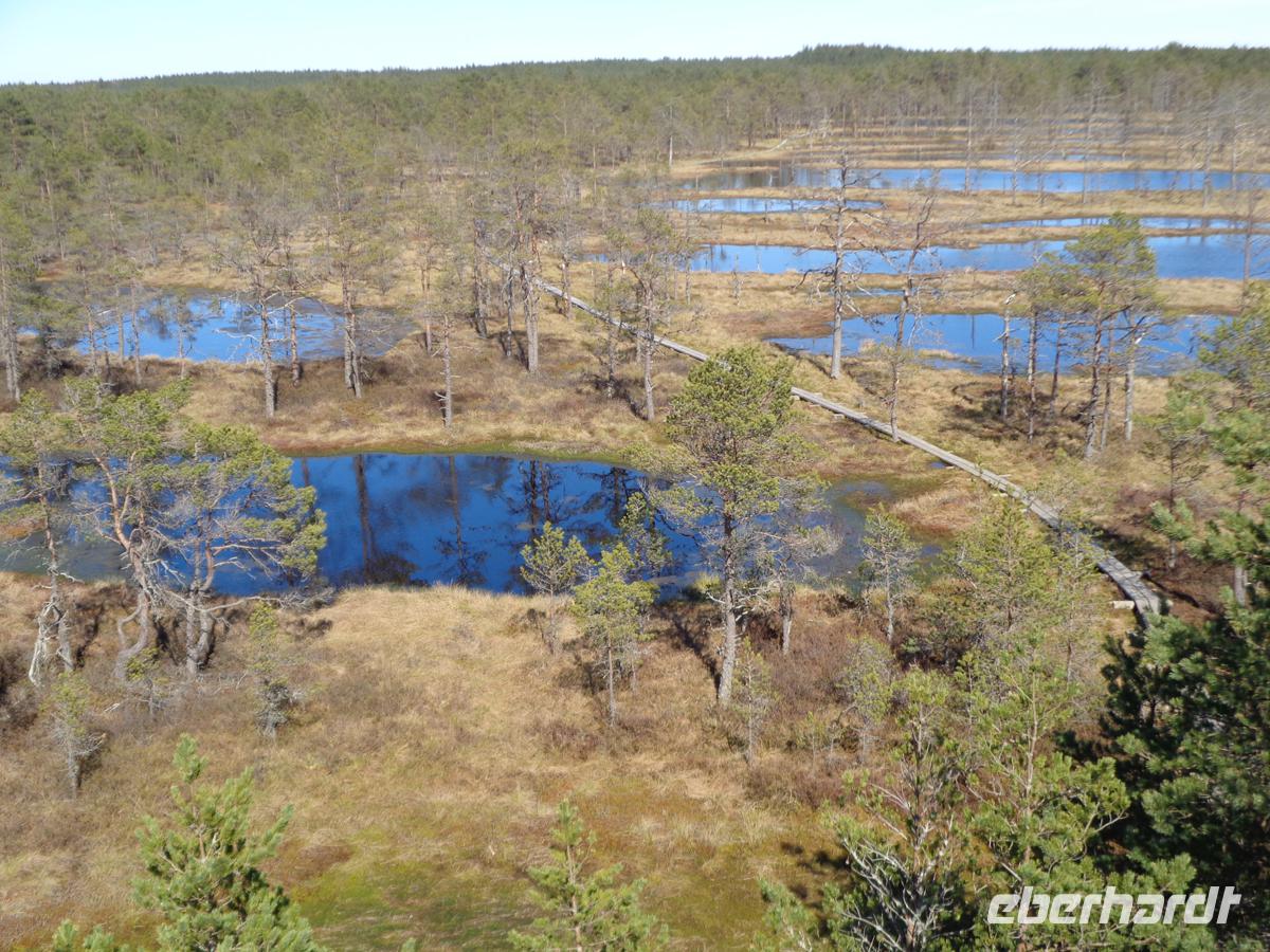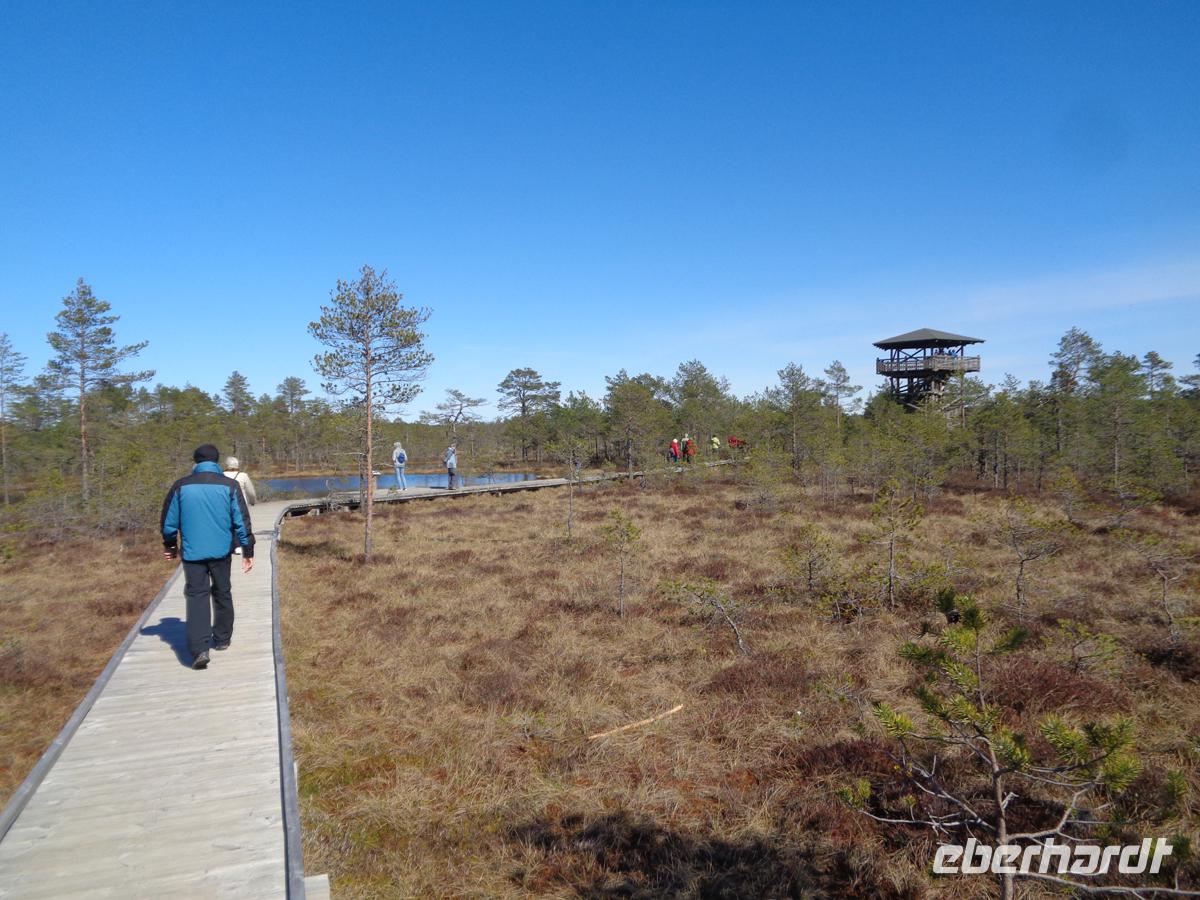 Einfaches, aber leckeres und sättigendes Bauernessen wie früher. Die Kalorien wollen wieder runter, und so machen wir uns bei nun strahlendem Sonnenschein auf ins Moor. Hochmoore sind für den Lahemaa Nationalpark typisch. Wir begeben uns in das Viru-Moor. Schon der Wald an der Straße ist mit Pfützen und Tümpeln recht durchnässt und je weiter wir hineingehen, desto üppiger werden Flechten und Moose an den Bäumen und auf dem Boden. Irgendwann ist es so feucht, dass es nur noch über einen Holzbohlenweg geht. Stelltafeln daneben unterrichten den Wanderer über die Flora und Fauna, sowie über die Entstehung dieser Hochmoore. Der Moosboden ist vollgesogen wier ein Schwamm. Der Boden hat nur wenige Nährstoffe. So wundert es nicht, dass die Krüppelkiefern, nicht höher als 2 m schon über 100 Jahre alt sein sollen. In der Mitte befindet sich ein Aussichtsturm von welchem wir einen guten Rundblick über das Moor haben. Bei Nebel oder in der Dämmerung herrscht hier sicher eine recht unheimliche Atmosphäre vor. Wir müssen uns heute jedoch nicht ängstigen, denn es ist Samstag und viele Menschen sind mit Kindern und Hunden unterwegs. Gehört doch das Viru-Moor zu den meistbesuchten Natursehenswürdigkeiten im Nationalpark.
