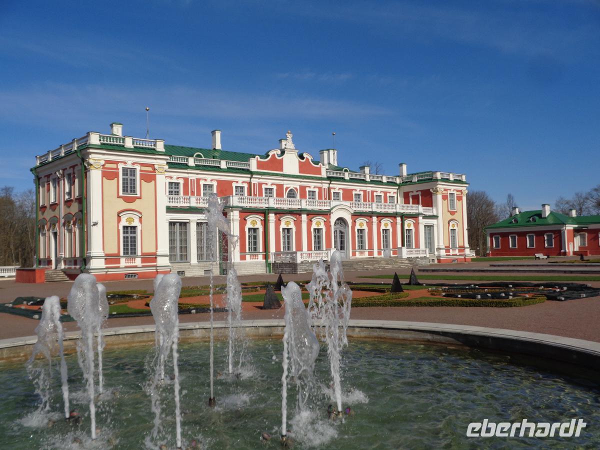 In der Morgendämmerung checke ich die Reisegäste online ein und lasse die Bordkarten vom Hotel ausdrucken. Dann geht am Flughafen nachher alles etwas reibungsloser und schneller. Nachdem wir ein letztes mal das üppige Frühstücksbuffet in unserem 4 Sterne Hotel genossen habenbegeben wir uns, weil noch etwas Zeit ist, begeben wir uns noch einmal in den Vorort Kadriorg. Peter d. Gr. Beschloss 1714, sich bei Reval, so hieß Tallin damals noch ein Sommerresidenz zu errichten. Er beauftragte den italienischen Architekten Niccolo Michetti mit dem Bau und benannte das Schloss nach Katharina, seiner Gemahlin, nämlich Katharinental. Mit der Abgeschiedenheit war es bald vorbei, denn um den großen Schloßpark herum, siedelten sich alsbald betuchte Bürger in schicken Holzvillen an. Auch heute gehört Kadriorg zu den teureren und bevorzugten Wohnlagen der Stadt. Wir beschauen uns das Schloß von außen, in dem heute ein Teil des Estländischen Kunstmuseums untergebracht ist, und schlendern noch ein wenig durch den Park, für den seinerzeit 300 Bäume neu gepflanzt wurden. Danach begeben wir uns endgültig zum Flughafen und es heißt Abschied nehmen vom Baltikum, von Regina und unserem Chauffeur Gintaris. Bis Frankfurt/Main fliegen wir alle gemeinsam um dort in die Maschinen umzusteigen, die uns zu den jeweiligen Zielflughäfen bringen.