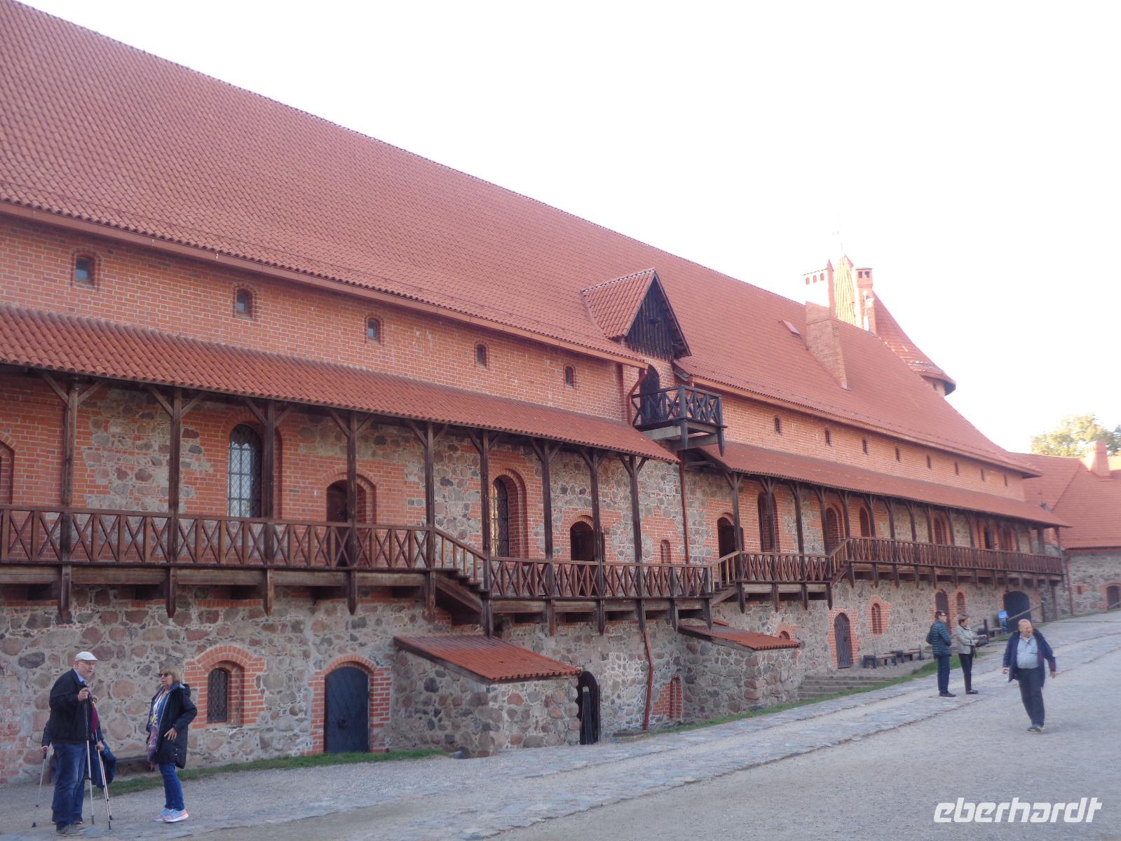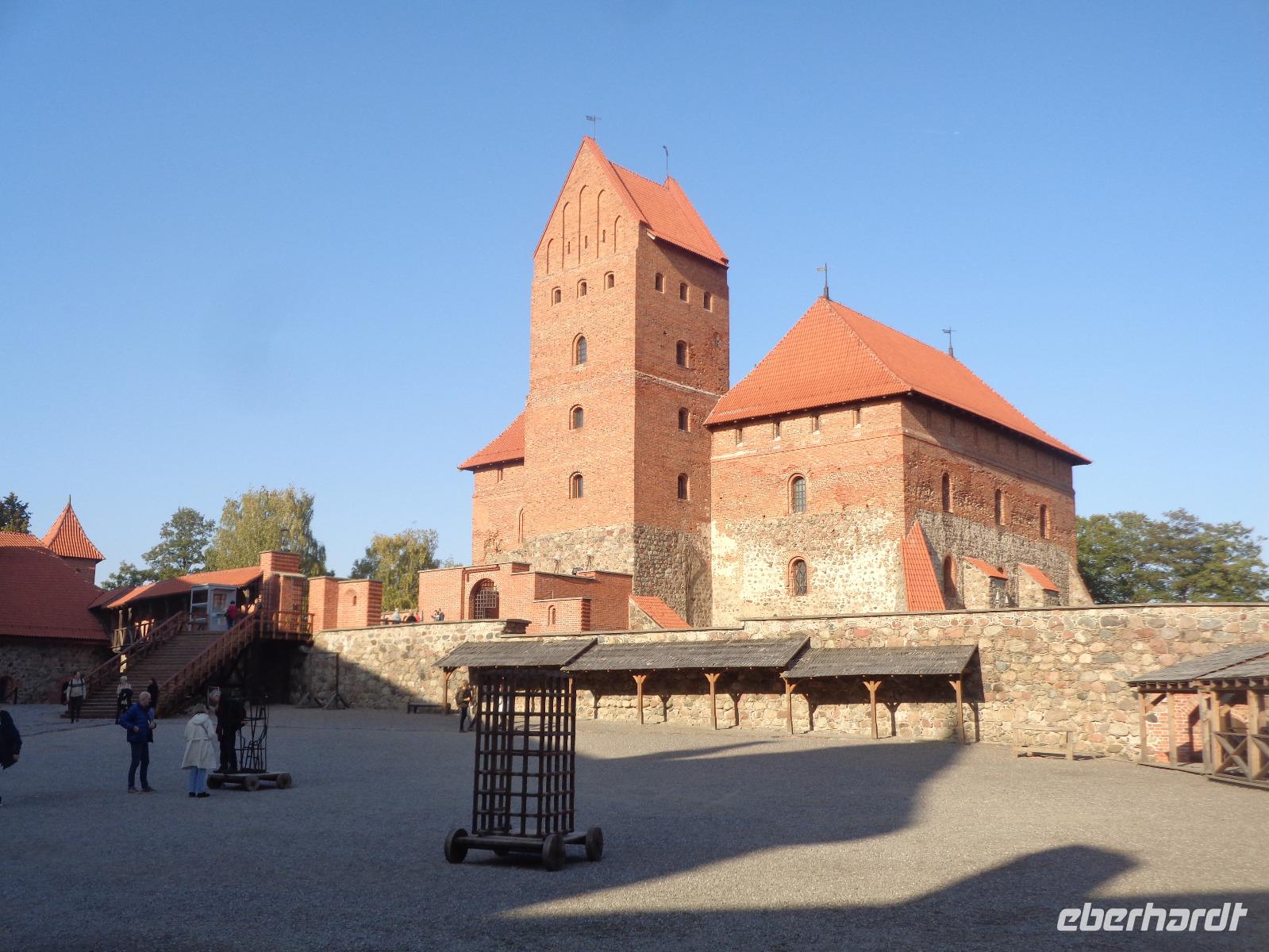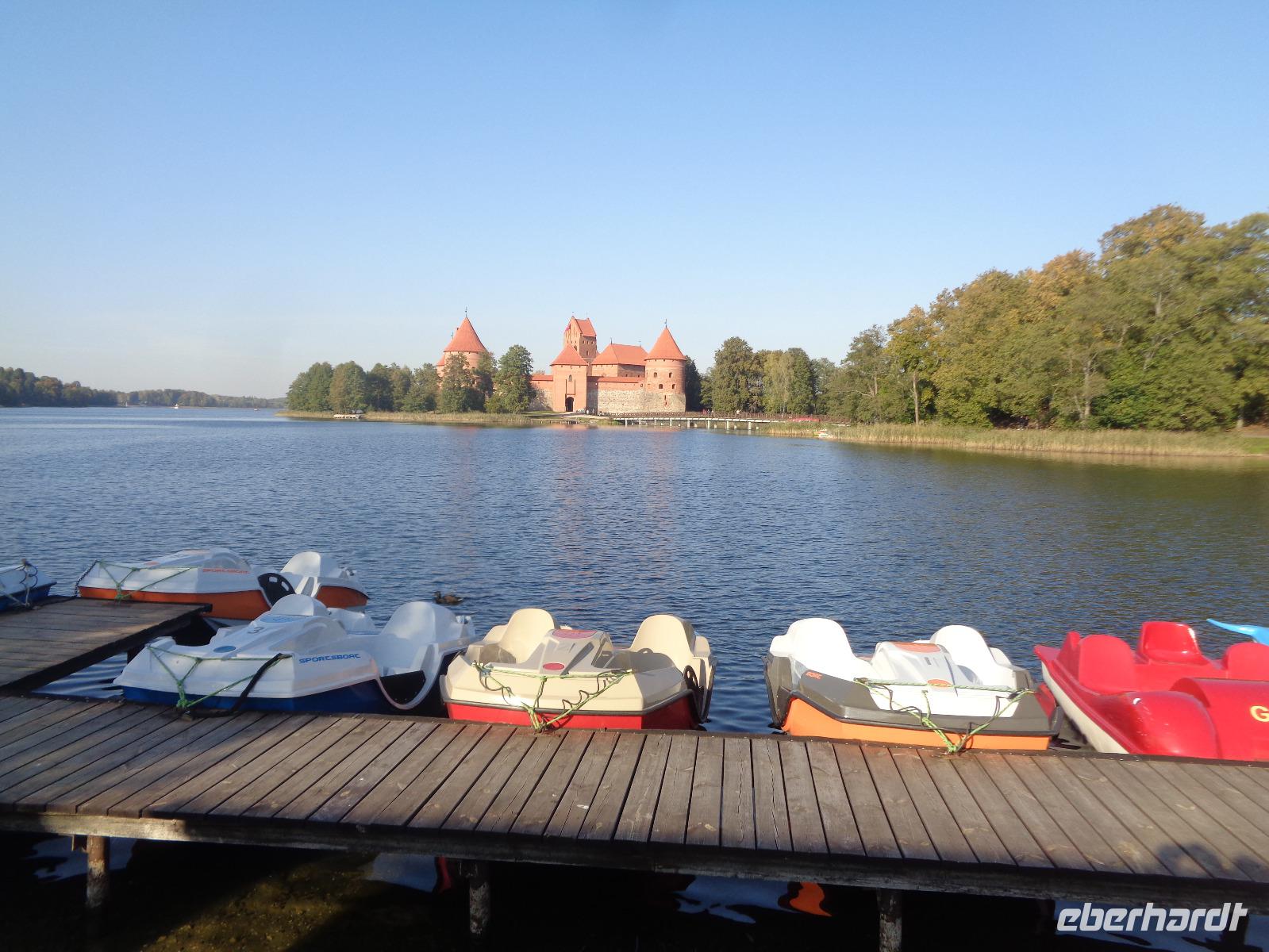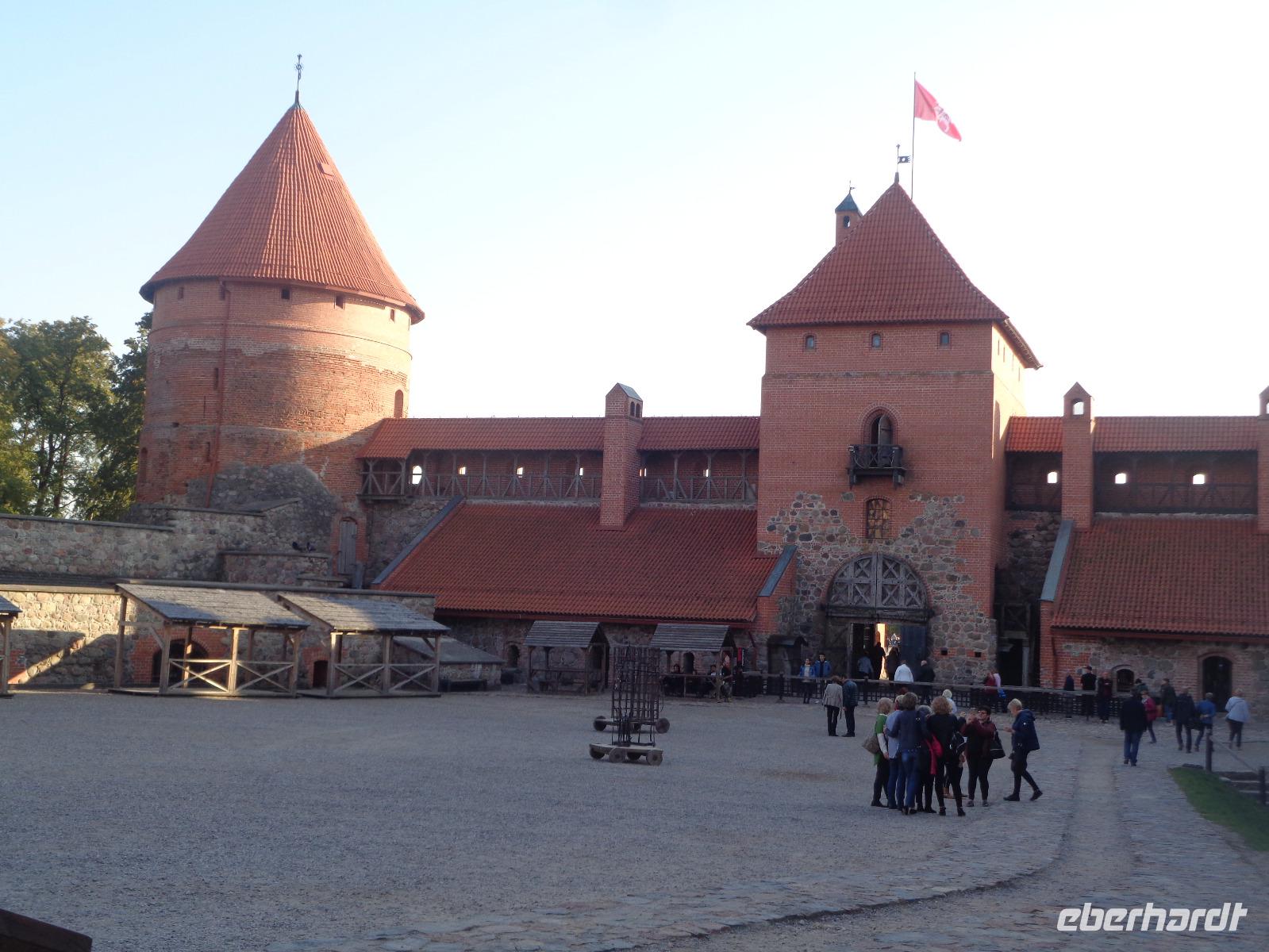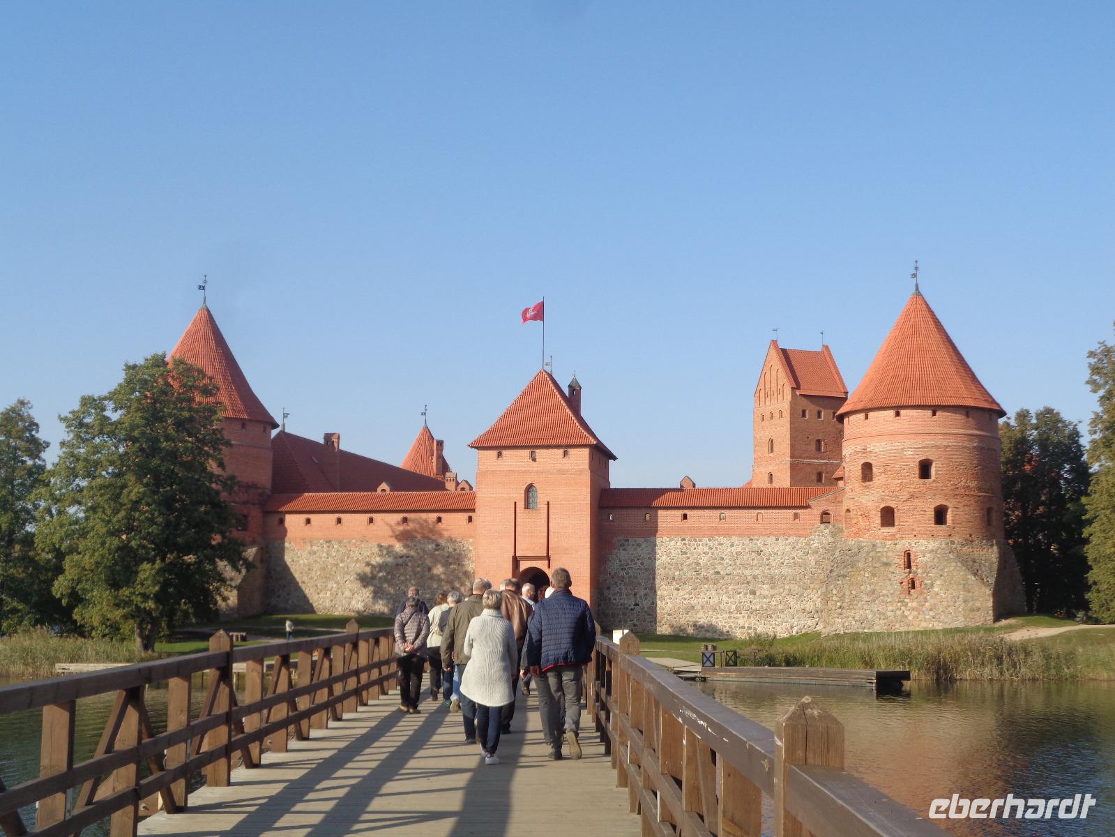 Mit 11 Gästen fliege ich am frühen Morgen in Leipzig los und treffe mich in Frankfurt am Main mit 13 Gästen aus Dresden, 4 Berlinern und 5 Gästen aus Frankfurt. Nach einem angenehmen Flug erwartet uns Zaneta mit 2 weiteren Gästen im Bus am Flughafen in Vilnius und legt gleich los. Da wir so zeitig da sind, sind unsere Zimmer im Hotel „Congress" noch nicht fertig und sie hat den genialen Vorschlag, dass wir sofort mit einem Besuch der sagenhaften Burg Trakai beginnen. Im 14. Jhd. erbaut, wurde die Wasserburg 1377 von den Kreuzrittern des Deutschordens angegriffen. Später residierte Fürst Gediminas, der Gründer Vilnius, auf der strategisch wichtigen Wasserburg. Großfürst Vytautas, der bis 1430 hier regierte, machte die Burg zum politischen Zentrum Litauens. Er holte Tataren und Karaiten, heute eine tatarisch-jüdische Minderheit, von der Krim und siedelte sie in Trakai an. Viele leben hier noch immer und pflegen ihre Traditionen. Beliebt und bekannt ist die karäische Küche durch ihre Fleischpasteten mit Hammel- oder Rindfleisch. Und natürlich gibt es dazu auch das passende traditionelle Getränk. Wir finden heute Platz in der „Kavine Kiubete" und probieren Zeppelinas und litauisches Bier oder Kwas. Danach spazieren wir entlang der malerischen Seen- und Waldlandschaft und erholen uns von unserer Anreise. Der Besuch der Burg und die erste Begegnung mit der Geschichte Litauens machen uns neugierig auf unsere Reise durch die drei baltischen Länder. Wir genießen und erreichen unser Hotel „Congress Vilnius" am späten Nachmittag ganz entspannt. Beim Abendessen im Hotelrestaurant machen wir uns weiter bekannt und stimmen noch die Zeiten für den nächsten Tag ab.