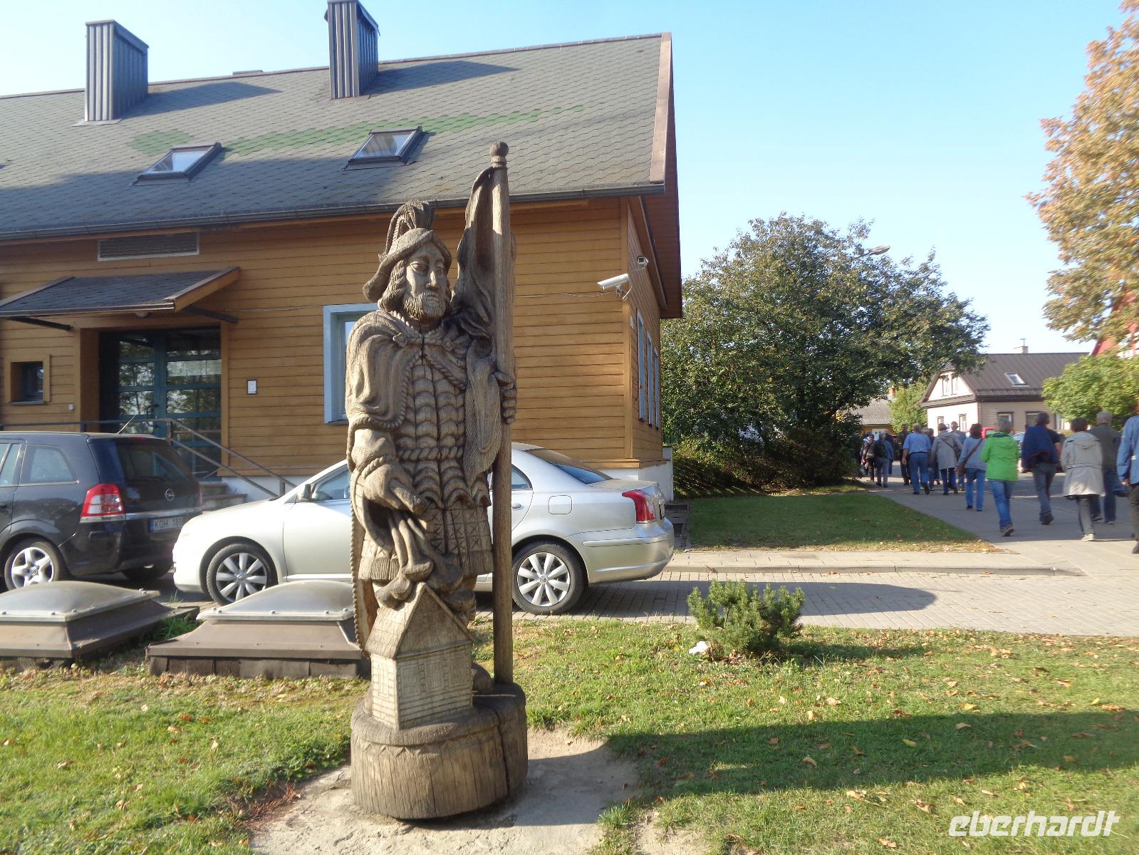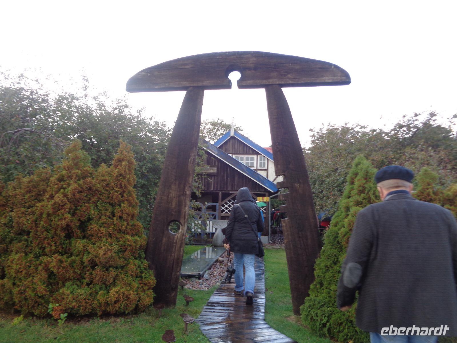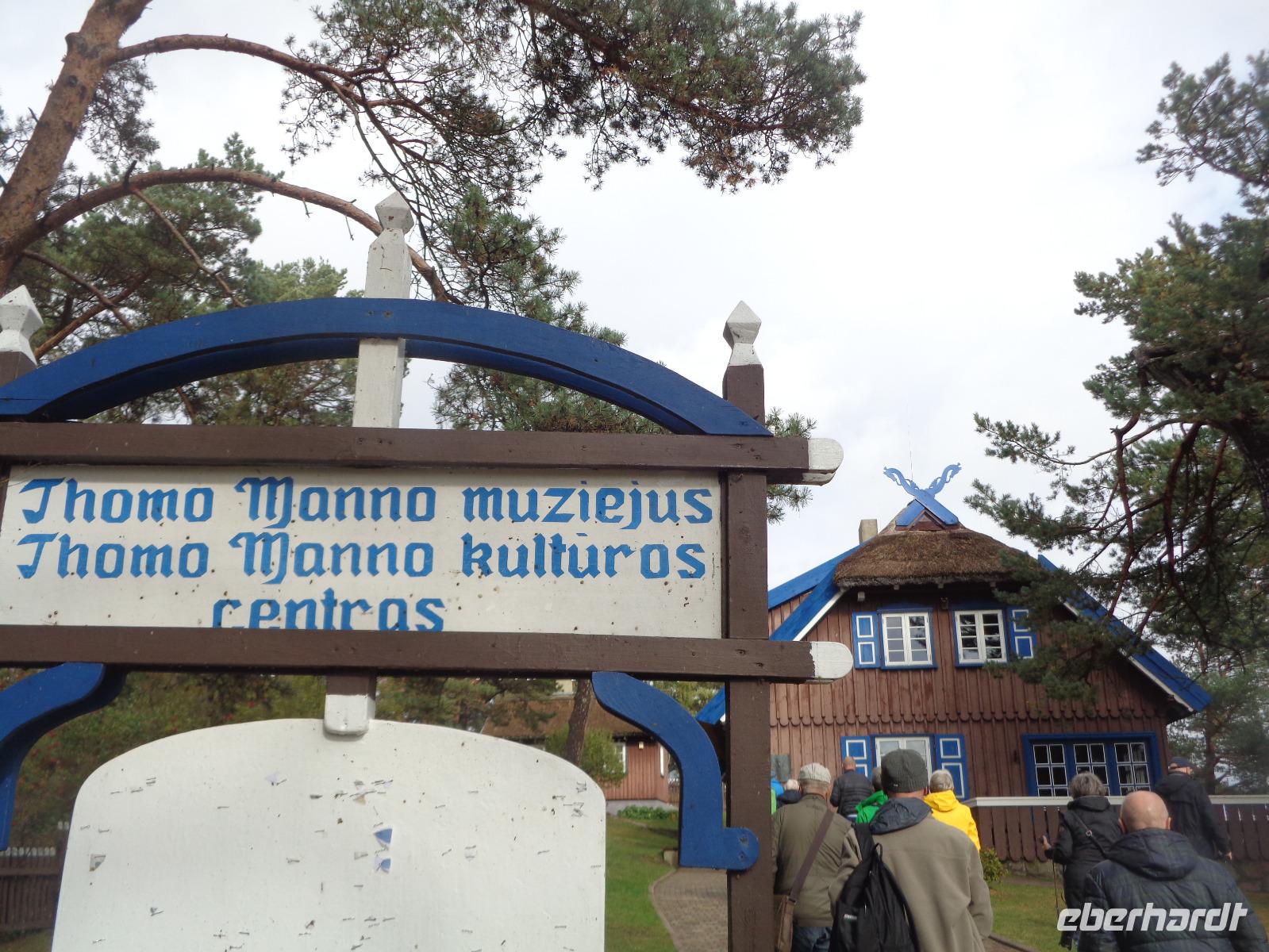 Heute wollen alle gleichzeitig frühstücken, aber alle gehen von der Schlacht am Sonntagsbuffet als Sieger hervor. Gestärkt freuen wir uns auf unseren Ausflug auf die Kurische Nehrung. Die Fähre nimmt unseren Bus auf und bringt uns rüber nach Smyltine. Wir passieren Juodkrante und den Hexenberg, denn Nebel und Regenschwaden umhüllen uns. Am Parkplatz einer beeindruckenden Dünenlandschaft beginnen wir unseren Spaziergang zur Sonnenuhr, einem kleinen Meisterwerk. Die Aussicht vom Aussichtssteg auf das Kurische Haff ist atemberaubend. Natur pur. Seit dem letzten Jahr gibt es auf der Paridis-Düne eine Skulptur des Existenzialisten Jean Paul Sartre, dem Vorreiter der französischen Intellektuellen des 20. Jhd. Die Figur von Klaudijus Püdymas zeigt ihn „Gegen den Wind" mit Blick auf die Nehrung. Auch wir fühlen uns hier wie er im „Vorhof des Paradieses". Hier kann man so richtig Ruhe und Kraft tanken, aber wir wollen noch mehr sehen. Unser Fahrer Tadeusz bringt uns bis zum Ortsrand von Nida oder Nidden. Wir blicken auf den Yachthafen, aber erbarmungslos treibt uns ein Regenguss in das nächste Restaurant, wo wir uns aufwärmen und gleich stärken. Danach spazieren wir am „Elch" vorbei Richtung Ortsende. Unterwegs kehren wir in das Bernsteinmuseum ein und bewundern die kunstvoll gefertigten Schmuckstücke und Gebrauchsgegenstände. Der eine oder andere kann nicht an den zauberhaften Ketten, Armbändern und Ohrringen vorbei gehen und kauft zur Freude der Liebsten ein. Wir werfen auch mal einen Blick auf den Friedhof und gelangen zum Hermann-Blode-Haus, das von der Niddener Künstlerkolonie übrig geblieben ist, in der auch Brücke-Künstler weilten. Die Deutschen verpönten die hier gesammelten Werke als „entartete Kunst" und die siegreiche benachbarte Armee verheizte viele Bilder in der Sauna. Übrig geblieben ist das Museum, für das wir heute keine Zeit haben. Unser Ziel ist das Haus von Thomas Mann, der 1929 auf dem Schwiegermutterberg ein Sommerhaus errichten ließ und von 1930 bis 1932 hier mit seiner großen Familie lebte und arbeitete. Wir besuchen das Museum und fotografieren alles für die Zeit nach dem Urlaub. Nach diesen Höhepunkten des heutigen Tages fahren wir den gleichen Weg wieder zurück bis zur Fähre, setzen über und erreichen am Nachmittag unser Hotel. Nach etwas Freizeit treffen wir uns alle wieder beim gediegenen Abendessen. Danach heißt es wieder Koffer packen.