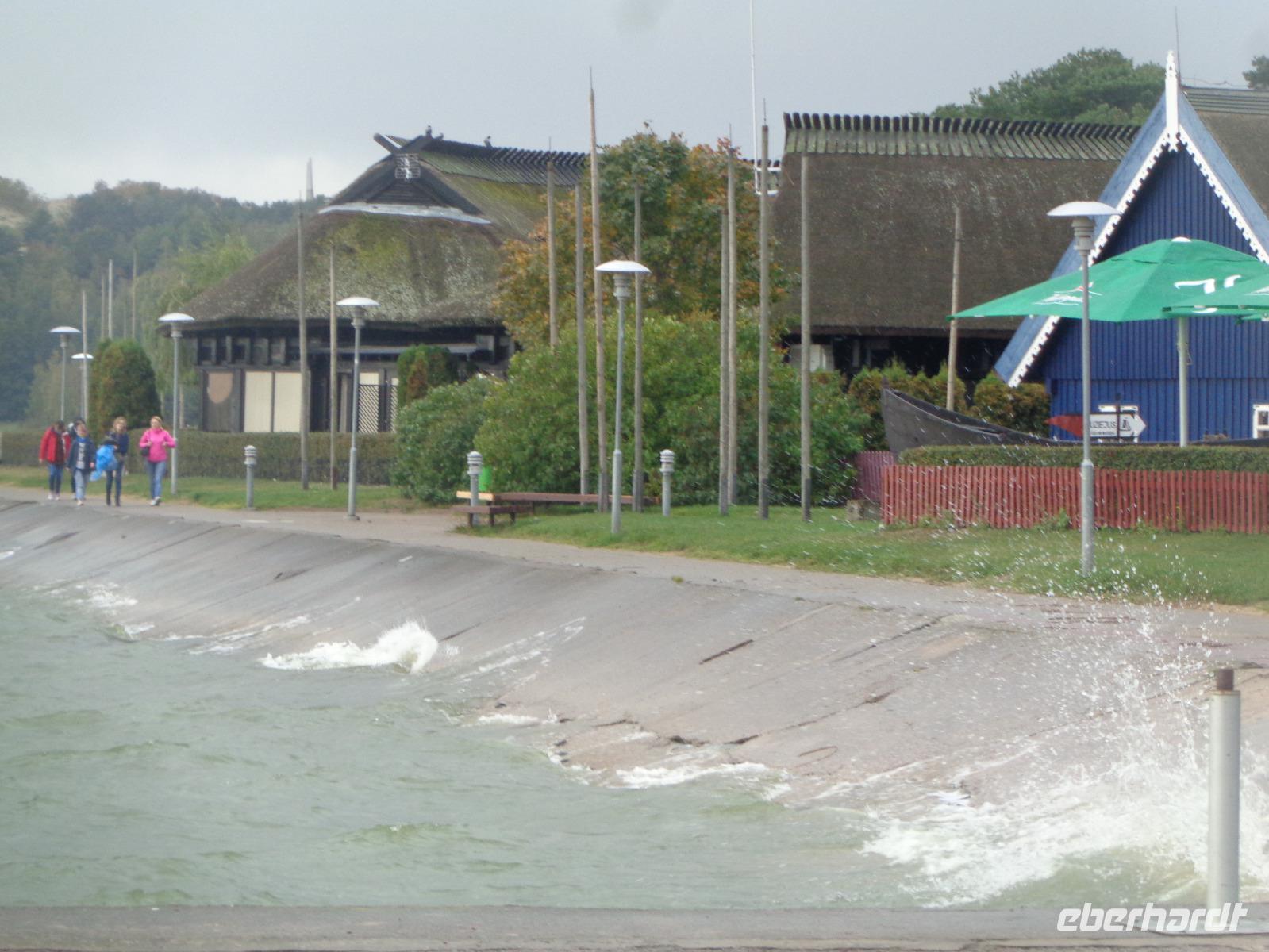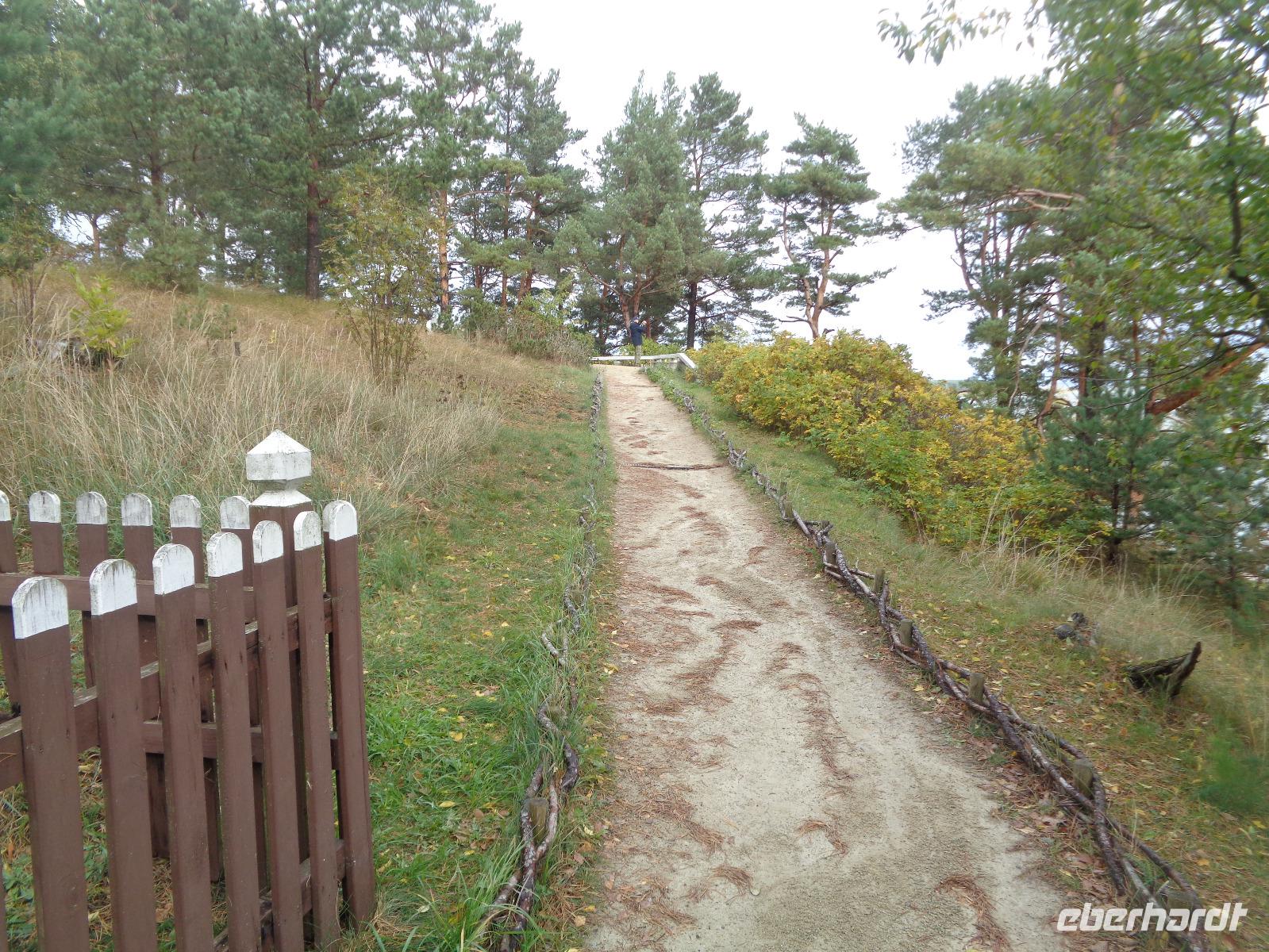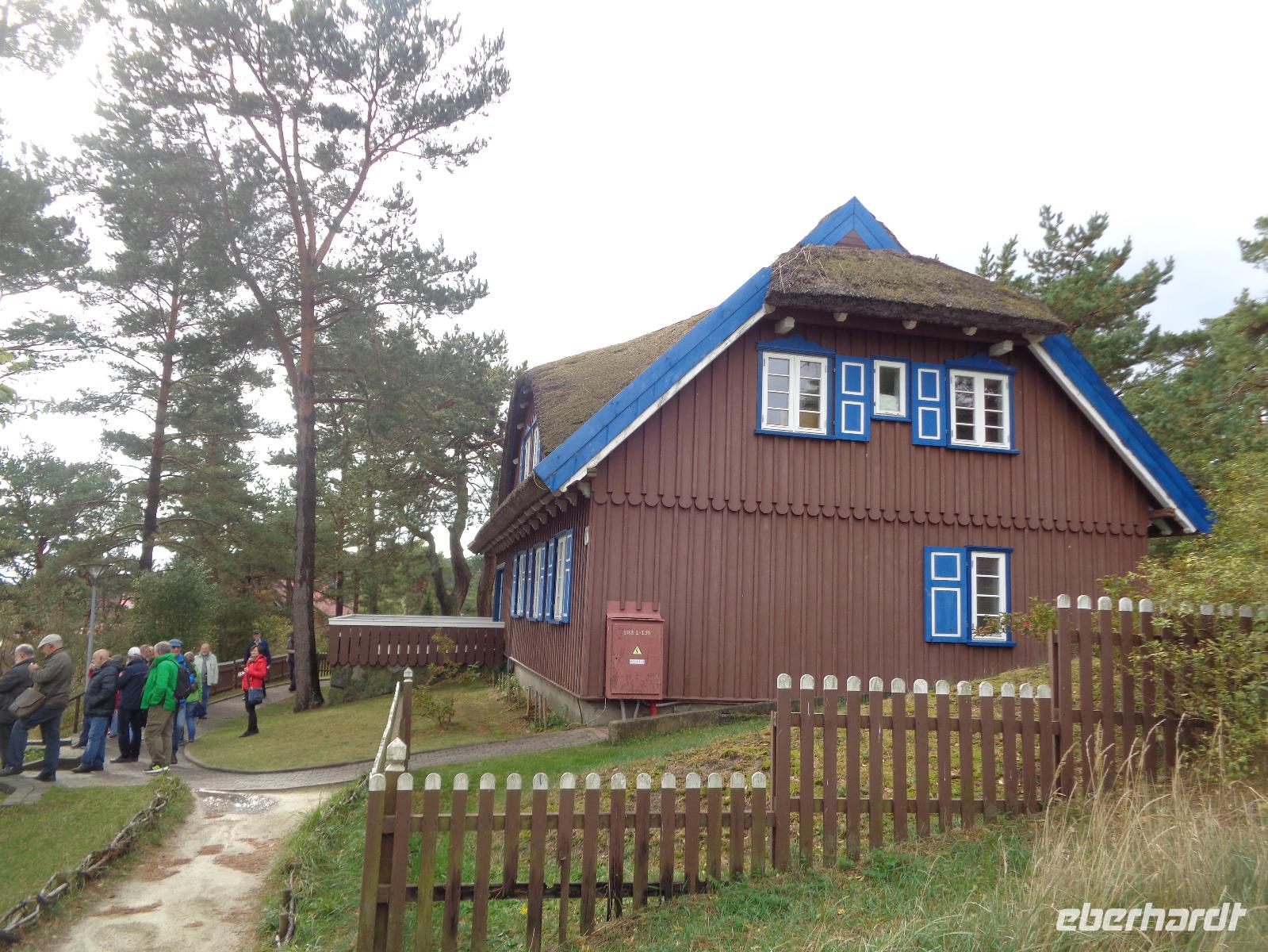 Heute wollen alle gleichzeitig frühstücken, aber alle gehen von der Schlacht am Sonntagsbuffet als Sieger hervor. Gestärkt freuen wir uns auf unseren Ausflug auf die Kurische Nehrung. Die Fähre nimmt unseren Bus auf und bringt uns rüber nach Smyltine. Wir passieren Juodkrante und den Hexenberg, denn Nebel und Regenschwaden umhüllen uns. Am Parkplatz einer beeindruckenden Dünenlandschaft beginnen wir unseren Spaziergang zur Sonnenuhr, einem kleinen Meisterwerk. Die Aussicht vom Aussichtssteg auf das Kurische Haff ist atemberaubend. Natur pur. Seit dem letzten Jahr gibt es auf der Paridis-Düne eine Skulptur des Existenzialisten Jean Paul Sartre, dem Vorreiter der französischen Intellektuellen des 20. Jhd. Die Figur von Klaudijus Püdymas zeigt ihn „Gegen den Wind" mit Blick auf die Nehrung. Auch wir fühlen uns hier wie er im „Vorhof des Paradieses". Hier kann man so richtig Ruhe und Kraft tanken, aber wir wollen noch mehr sehen. Unser Fahrer Tadeusz bringt uns bis zum Ortsrand von Nida oder Nidden. Wir blicken auf den Yachthafen, aber erbarmungslos treibt uns ein Regenguss in das nächste Restaurant, wo wir uns aufwärmen und gleich stärken. Danach spazieren wir am „Elch" vorbei Richtung Ortsende. Unterwegs kehren wir in das Bernsteinmuseum ein und bewundern die kunstvoll gefertigten Schmuckstücke und Gebrauchsgegenstände. Der eine oder andere kann nicht an den zauberhaften Ketten, Armbändern und Ohrringen vorbei gehen und kauft zur Freude der Liebsten ein. Wir werfen auch mal einen Blick auf den Friedhof und gelangen zum Hermann-Blode-Haus, das von der Niddener Künstlerkolonie übrig geblieben ist, in der auch Brücke-Künstler weilten. Die Deutschen verpönten die hier gesammelten Werke als „entartete Kunst" und die siegreiche benachbarte Armee verheizte viele Bilder in der Sauna. Übrig geblieben ist das Museum, für das wir heute keine Zeit haben. Unser Ziel ist das Haus von Thomas Mann, der 1929 auf dem Schwiegermutterberg ein Sommerhaus errichten ließ und von 1930 bis 1932 hier mit seiner großen Familie lebte und arbeitete. Wir besuchen das Museum und fotografieren alles für die Zeit nach dem Urlaub. Nach diesen Höhepunkten des heutigen Tages fahren wir den gleichen Weg wieder zurück bis zur Fähre, setzen über und erreichen am Nachmittag unser Hotel. Nach etwas Freizeit treffen wir uns alle wieder beim gediegenen Abendessen. Danach heißt es wieder Koffer packen.