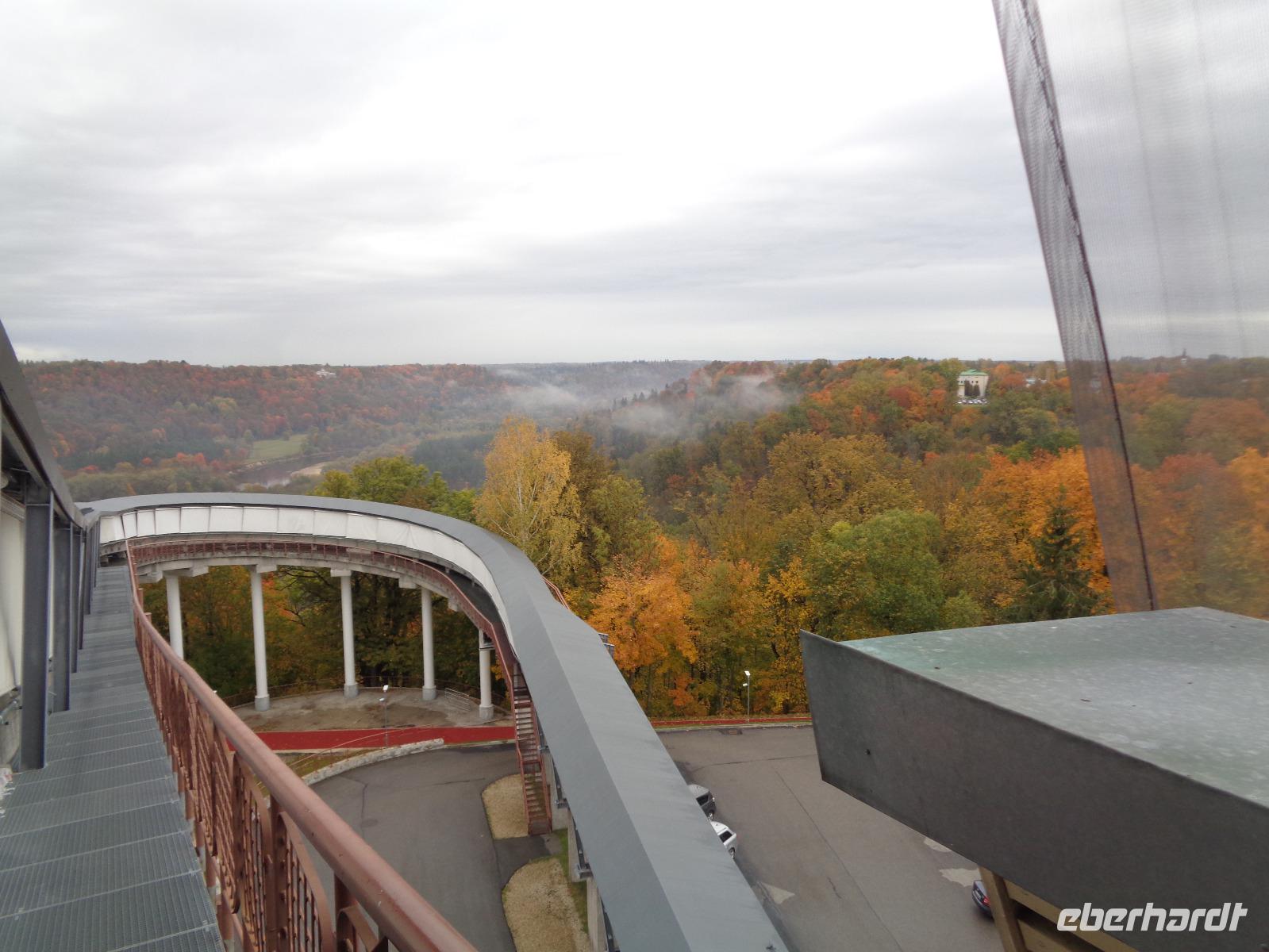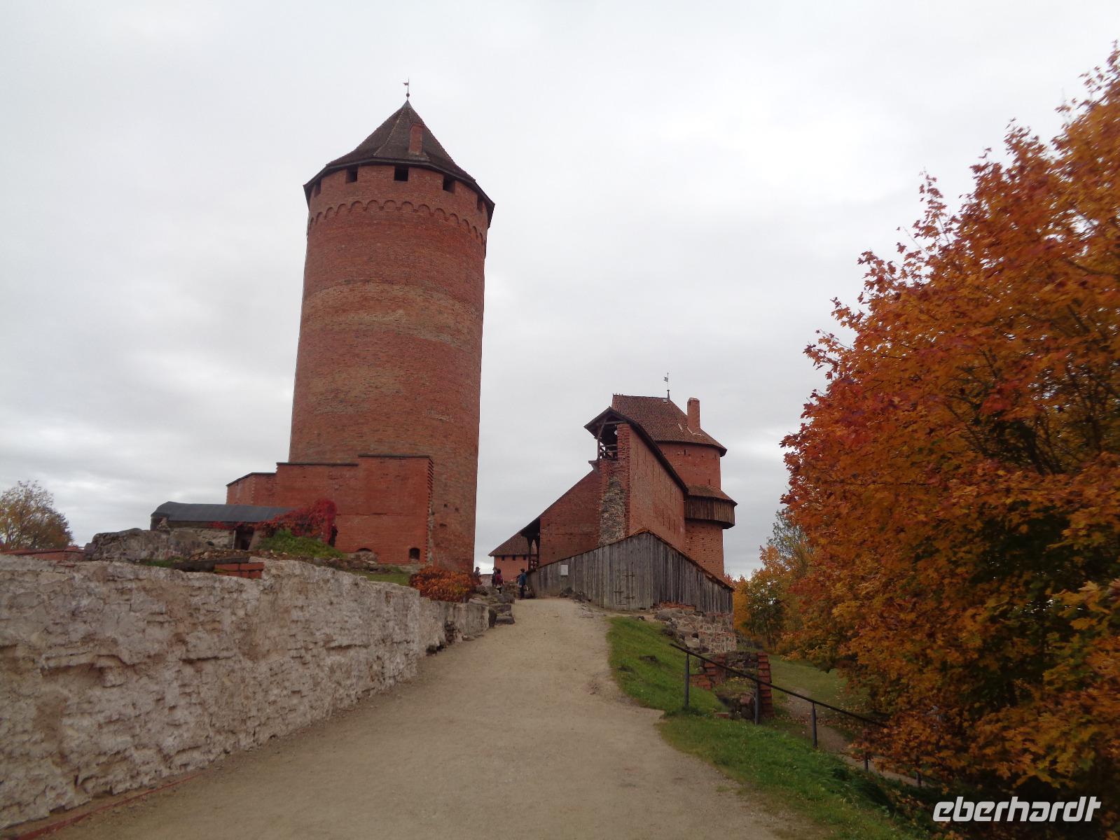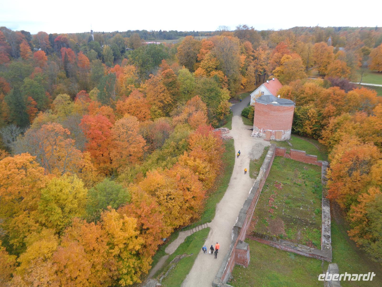 Nach der Stärkung am Frühstücksbuffet laden wir die Koffer wieder ein und begeben uns Richtung Gauja-Nationalpark. Wir passieren den Jugla Stausee. Er ist ein künstlicher See im Unterlauf der Düna und dient der Trinkwassergewinnung. Rolandas erzählt uns die Geschichte von den Tränen, die den See füllten. Wir fahren Richtung Sigulda und stoppen an der Bob- und Rodelbahn, eine gewaltige Anlage mit gigantischer Aussicht. Einige von uns lassen sich in einem Bob vor der Anlage ablichten, der allerdings auf purem Asphalt steht. Unser nächstes Ziel ist das Museumsreservat Turaida. Wir erklimmen den Burgturm und sind beeindruckt von der waldreichen Umgebung, die schon in allen Farben des Herbstes leuchtet. Die Mauerburg wurde Anfang des 13. Jhd. für Bischof Albert gebaut. Genau an dieser Stelle stand früher die hölzerne Burg des Königs Kaupo der Liven. Man könnte noch stundenlang hier im Freilichtmuseum verweilen. Die Burganlage wurde liebevoll rekonstruiert und ist ein Touristenmagnet, ebenso wie die Grabstätte der Rose von Turaida. Rolandas erzählt uns die traurige Geschichte des jungen Mädchens, das ihr Leben für die Liebe opferte. Ihre Geschichte verkörpert das Sinnbild von Ehre, Liebe und Vertrauen und berührt uns sehr. Ihre Gedenkstätte finden wir hinter der hübschen Holzkirche aus der Mitte des 18. Jhd. Wir besuchen noch die kleine Höhle Gütmanala oder Gutmannshöhle, wo das arme Mädchen erschlagen worden sein soll. Das müssen wir erst einmal setzen lassen und fahren weiter.Gegen Mittag erreichen wir das Hexenhaus „Raganis Kekis", wo wir vorzüglich beköstigt werden. Heute ist in Deutschland Nationalfeiertag und wir sind weit weg. Kein Problem: wir feiern gleich hier mit Prosecco, lettischem Schnaps und Pralinen und fahren dann weiter Richtung Tallinn. Auf dem weiteren Weg berichtet Rolandas von Wirtschaft, Technologie und sozialen Aspekten in allen drei baltischen Ländern und vergleicht die Fakten für uns. Als Sieger geht Estland hervor, was wir gleich selbst überprüfen können, denn wir passieren die Grenze, die es seit 2004 nicht mehr gibt. Abends erreichen wir unser tolles Hotel „Hestia Europa", das wirklich keine Wünsche offen lässt, genau wie unser heutiges Abendessen im Hotelrestaurant.