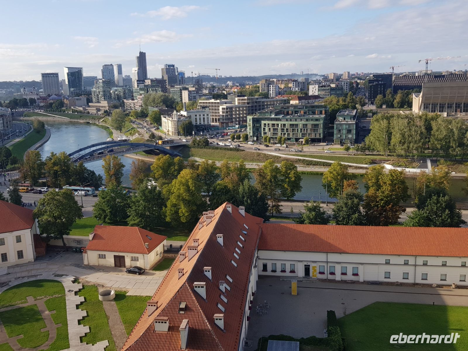 Wir starten sehr früh und treffen uns auf dem Flughafen in Frankfurt/ Main, um gemeinsam nach Vilnius zu fliegen. Mit 1 Stunde Verspätung wegen Personalproblemen startet unser Flug, aber die Zeit vergeht schnell und am späten Mittag landen wir in Vilnius. Die örtliche Reiseleiterin Vilija und der Busfahrer Boleslaw erwarten uns und bringen die Reisegruppe zum Hotel Courtyard by Marriot. Vilija gibt erste Informationen zur Stadt und den Sehenswürdigkeiten und weil bis zum Abendessen noch viel Zeit ist, empfiehlt sie, den gegenüber des Hotels liegenden Gediminas-Hügel zu besichtigen. Ein Ehepaar ist schon 1 Tag eher in Vilnius angereist und erwartet uns ebenfalls in der Lobby. Gleich nach dem Einchecken machen sich die ersten Gäste auf den Weg, die Stadt zu erkunden.