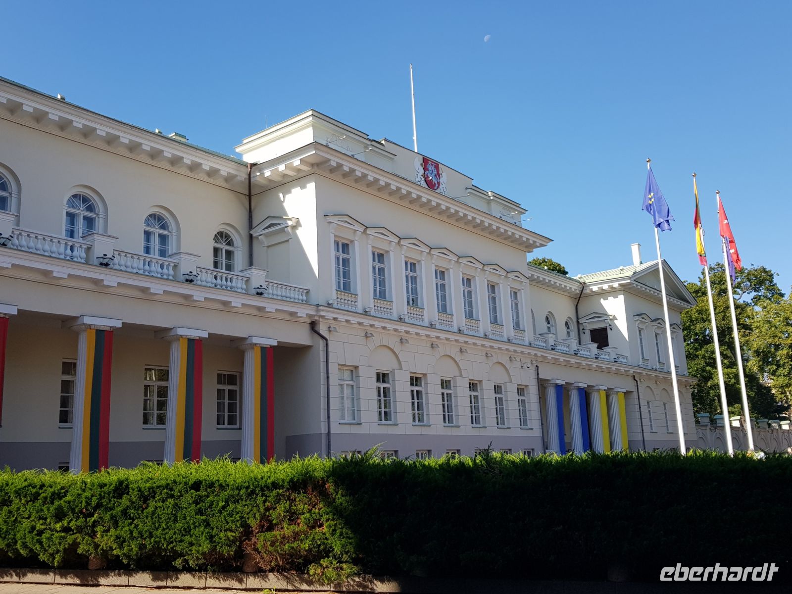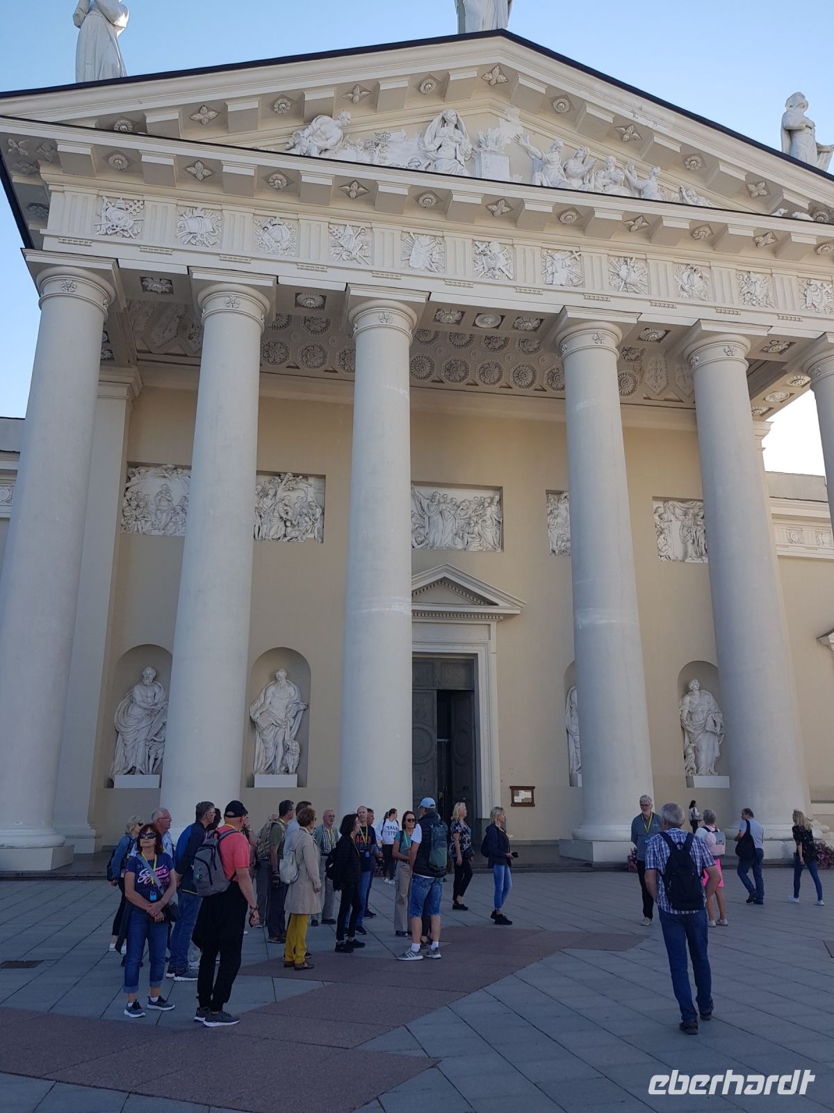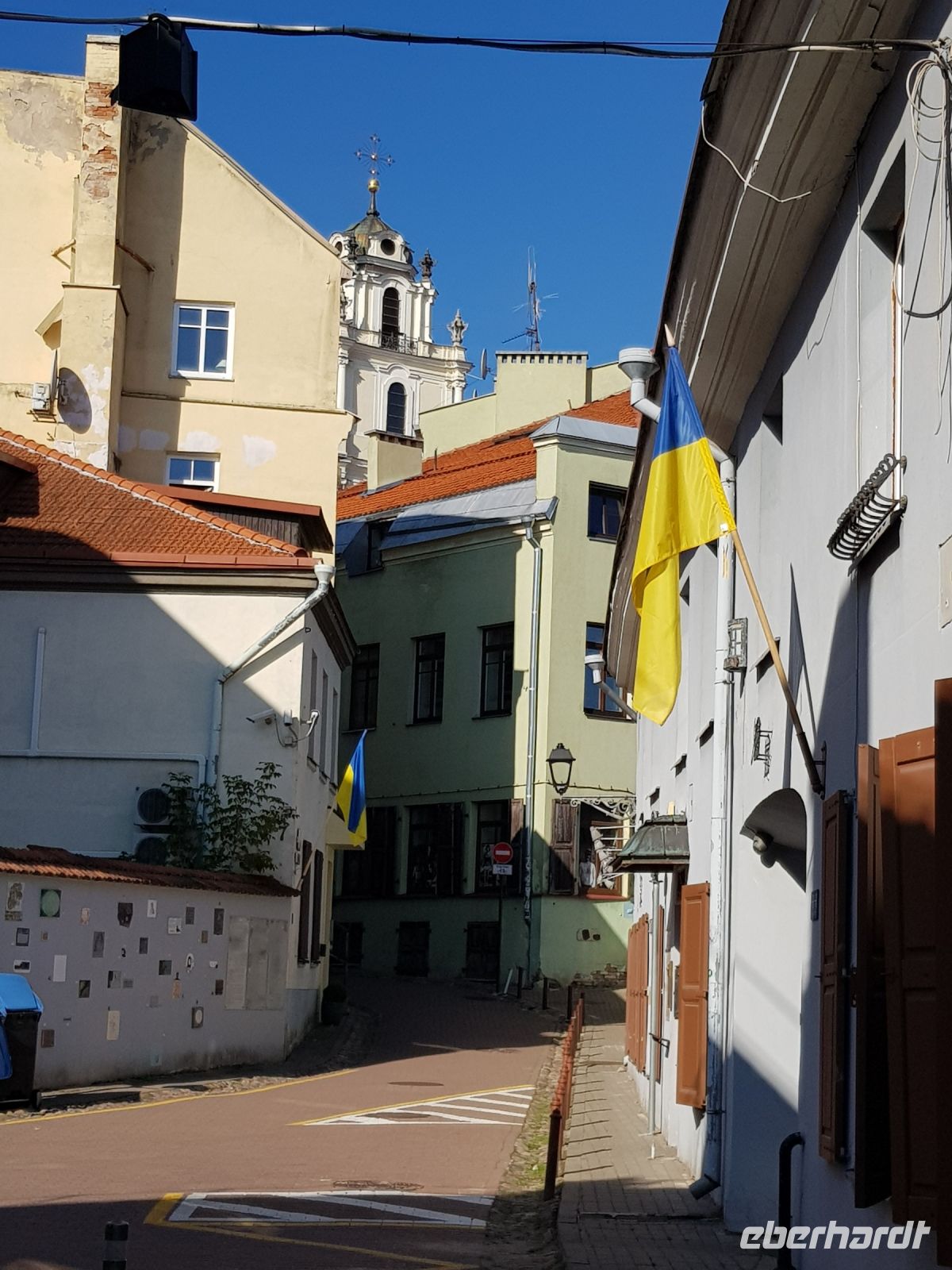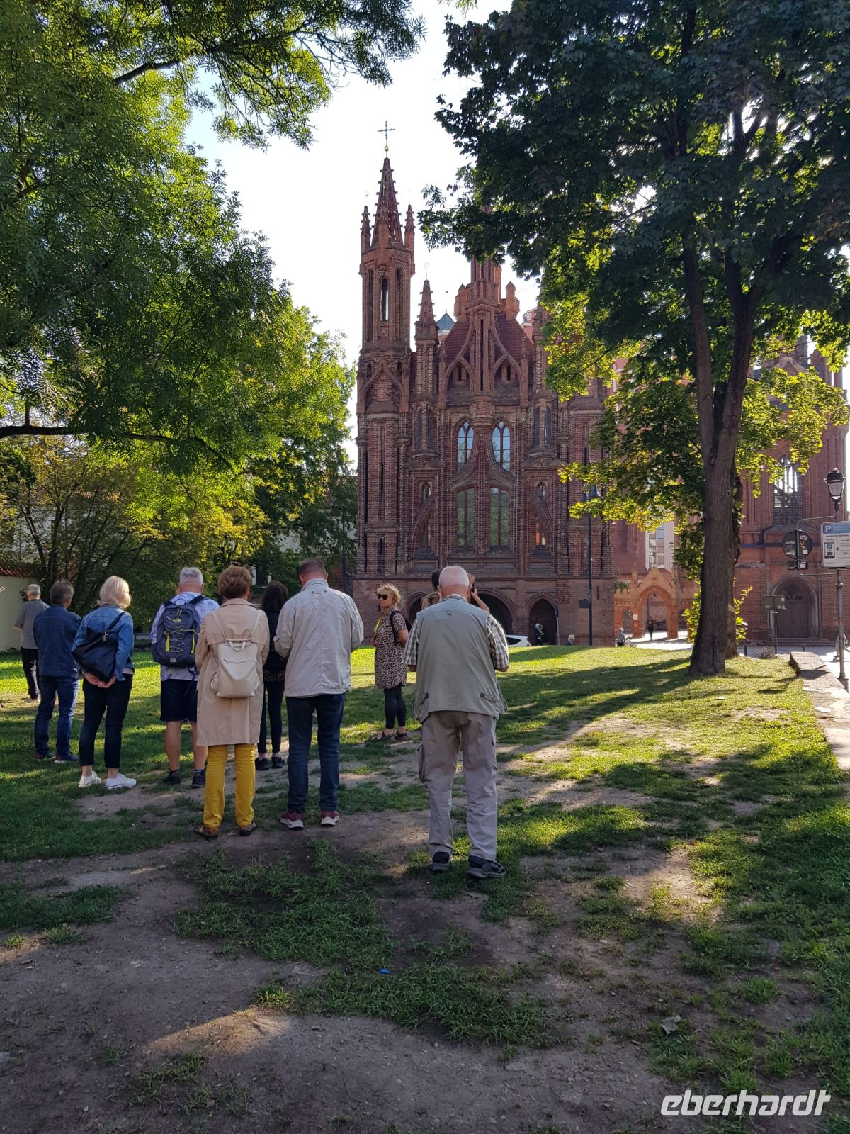 Nach einem guten Frühstück (allerdings etwas hektisch, zu viele Gäste auf ein Mal und einer der Kaffeeautomaten fällt kurzfristig aus), erwartet uns Vilija zu einem 3-stündigen Stadtrundgang. Wir werden mit Audio-Guides ausgestattet, die auch in den nächsten Tagen unsere Begleiter sein werden. Vorbei am geschichtsträchtigen Gediminas-Hügel - hierher verlegte der Großfürst nach einer Legende die litauische Hauptstadt - ist unser erster Stopp am Glockenturm der Kathedrale. Weiter geht es zum Reiterstandbild, das Fürst Gediminas darstellt. Genau hier soll der Fürst seinen Traum von einem eisernen Wolf gehabt haben, der heulte wie hundert Wölfe. Wenig weiter kommen wir zum wieder aufgebauten Fürstenpalast, der zwischen 1547 und 1553 nach Entwürfen des italienischen Architekten Giovanni Cini erbaut wurde, bei einem Stadtbrand 1610 beträchtlichen Schaden nahm, 1655 durch die russische Armee als Kaserne benutzt wurde, von den Litauern beschossen wurde und unter erneut russischer Besatzung dann vollständig zerstört wurde. Weiter führt uns der Weg in die Altstadt mit Burgstrasse - viele kleine Cafes und herrliche Blumenarrangements fallen uns auf - zur Anna-Kirche ( das schönste gotische Bauwerk Litauens). Zwischen Glockenturm und Annenkirche kommen wir zur viel grösseren Bernhardinerkirche, ein Stilgemisch aus Gotik, Renaissance und Barock. Das von der Johanniskirche dominierte Universitätsviertel umfasst einen ganzen Strassenblock der Altstadt. Für einen Betrag von 2,00 Euro können wir sowohl die Johanniskirche und den Großen Hof ( der ein wenig an eine italienische Piazza erinnert ) mit seinen vielfältigen Gebäuden der alten historischen Universität besichtigen. Von hier aus sind es nur wenige Schritte bis zum Präsidentenpalast mit seiner klassizistischen Fassade.