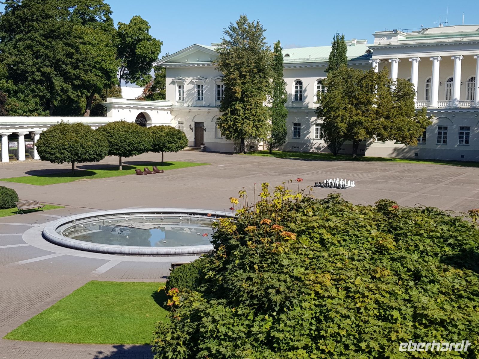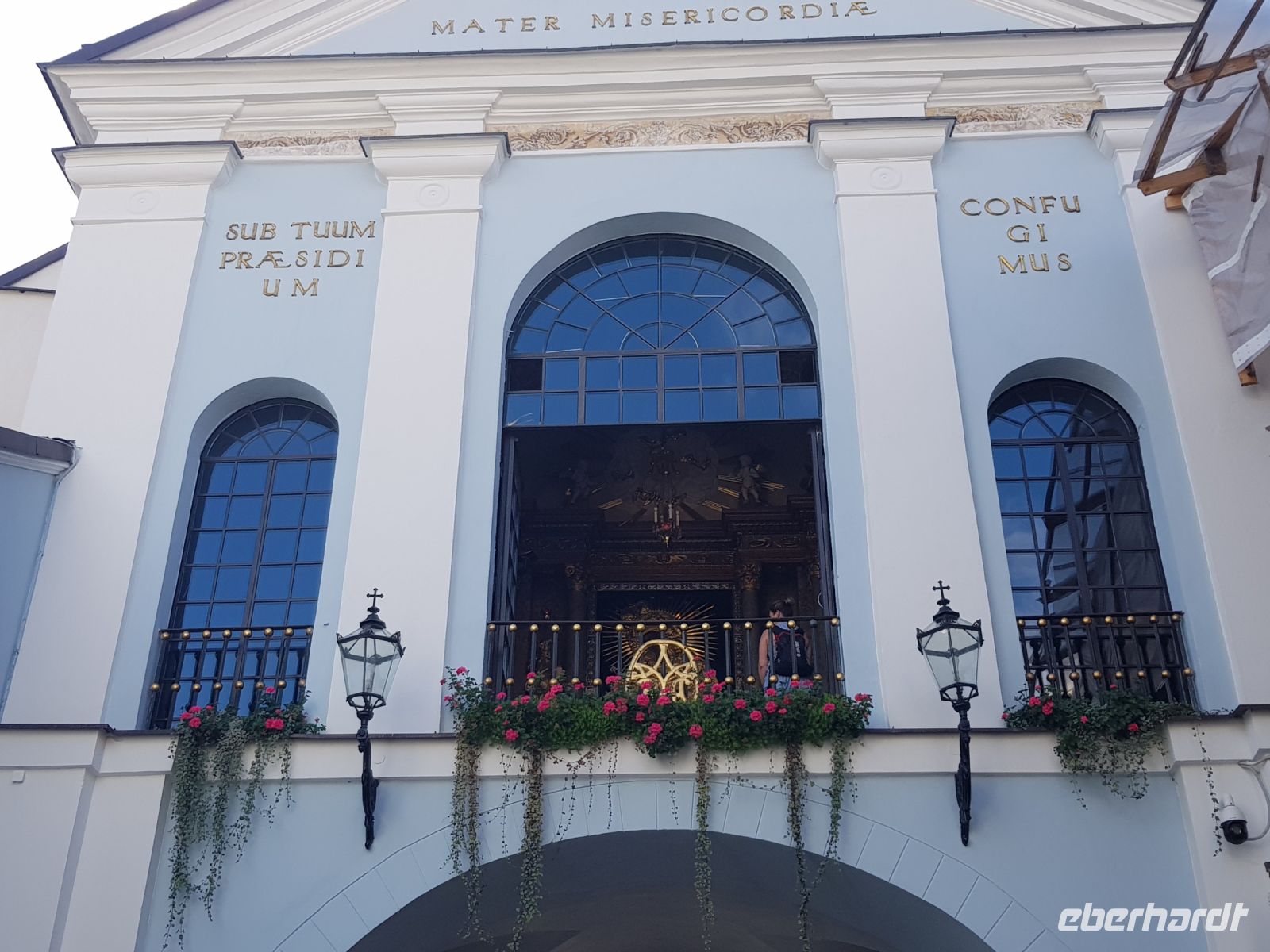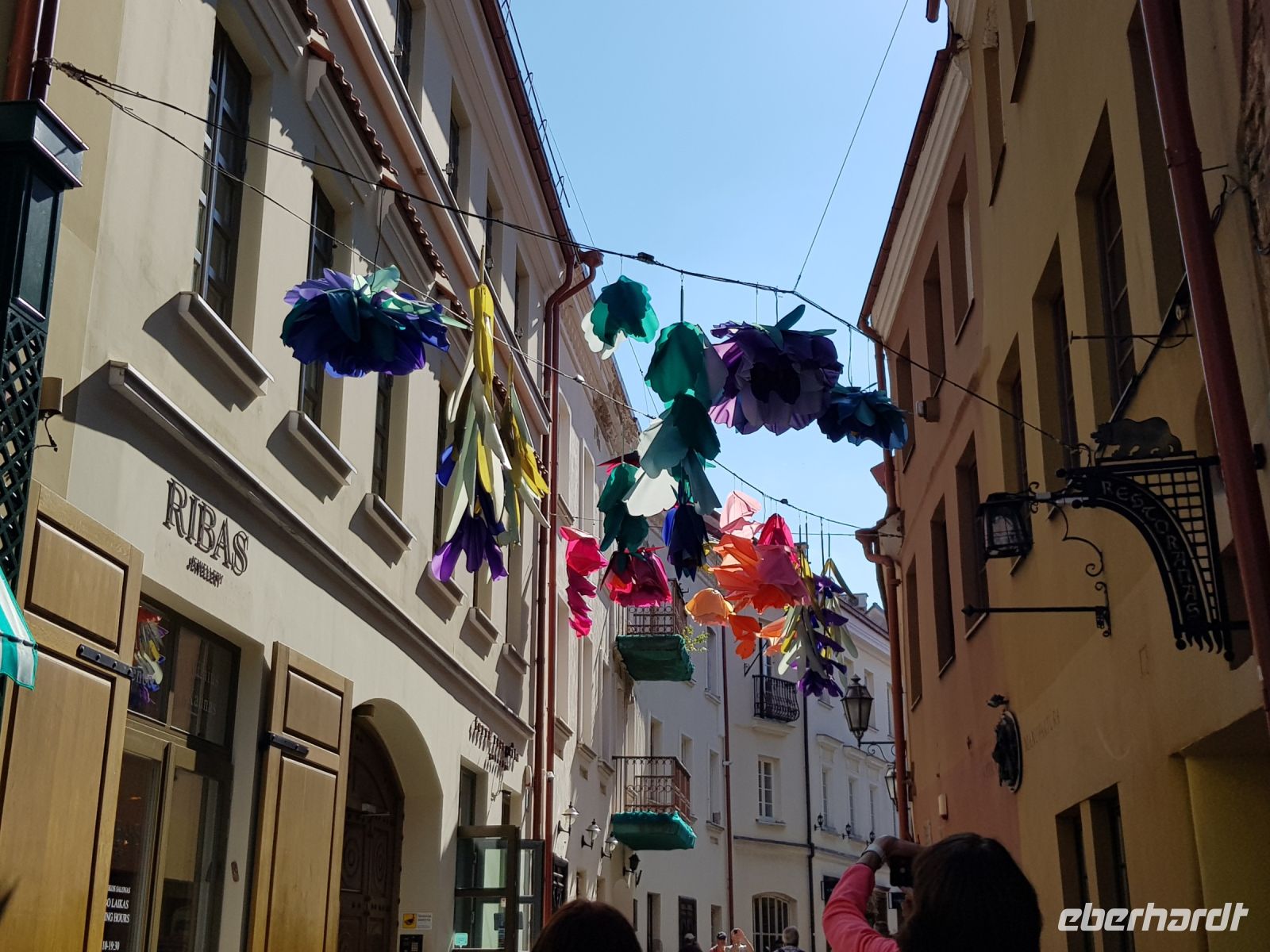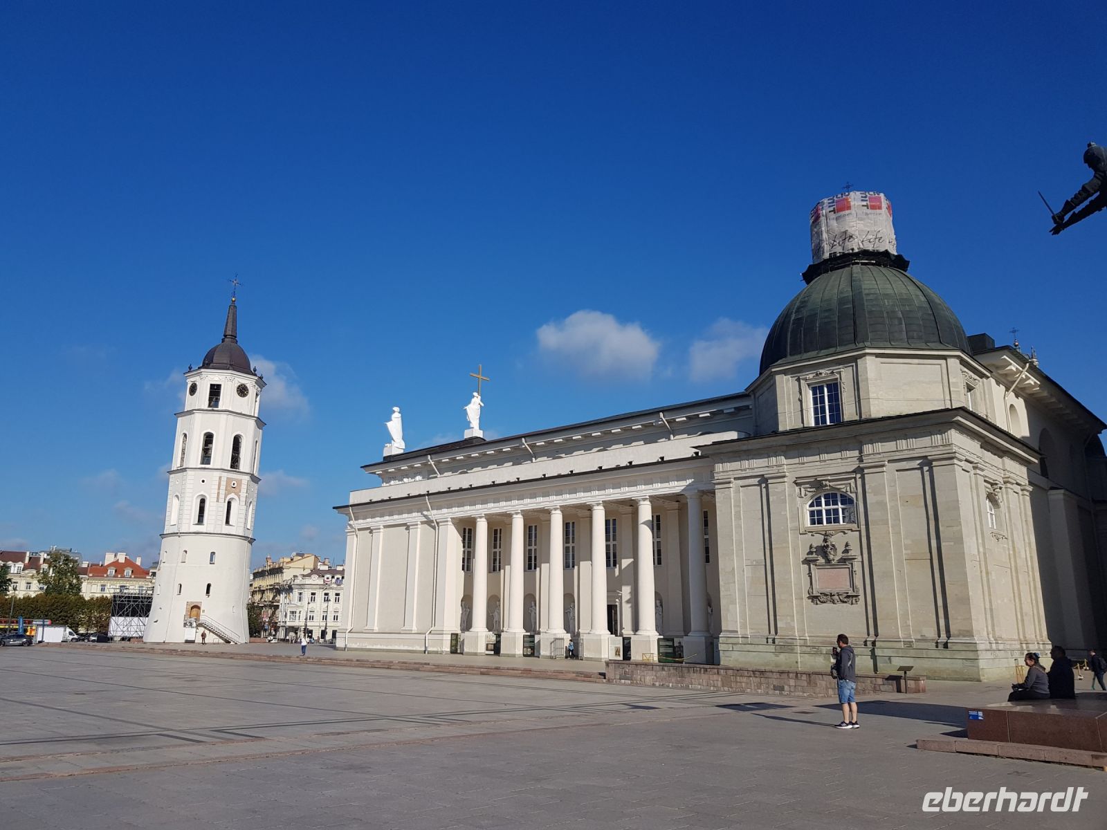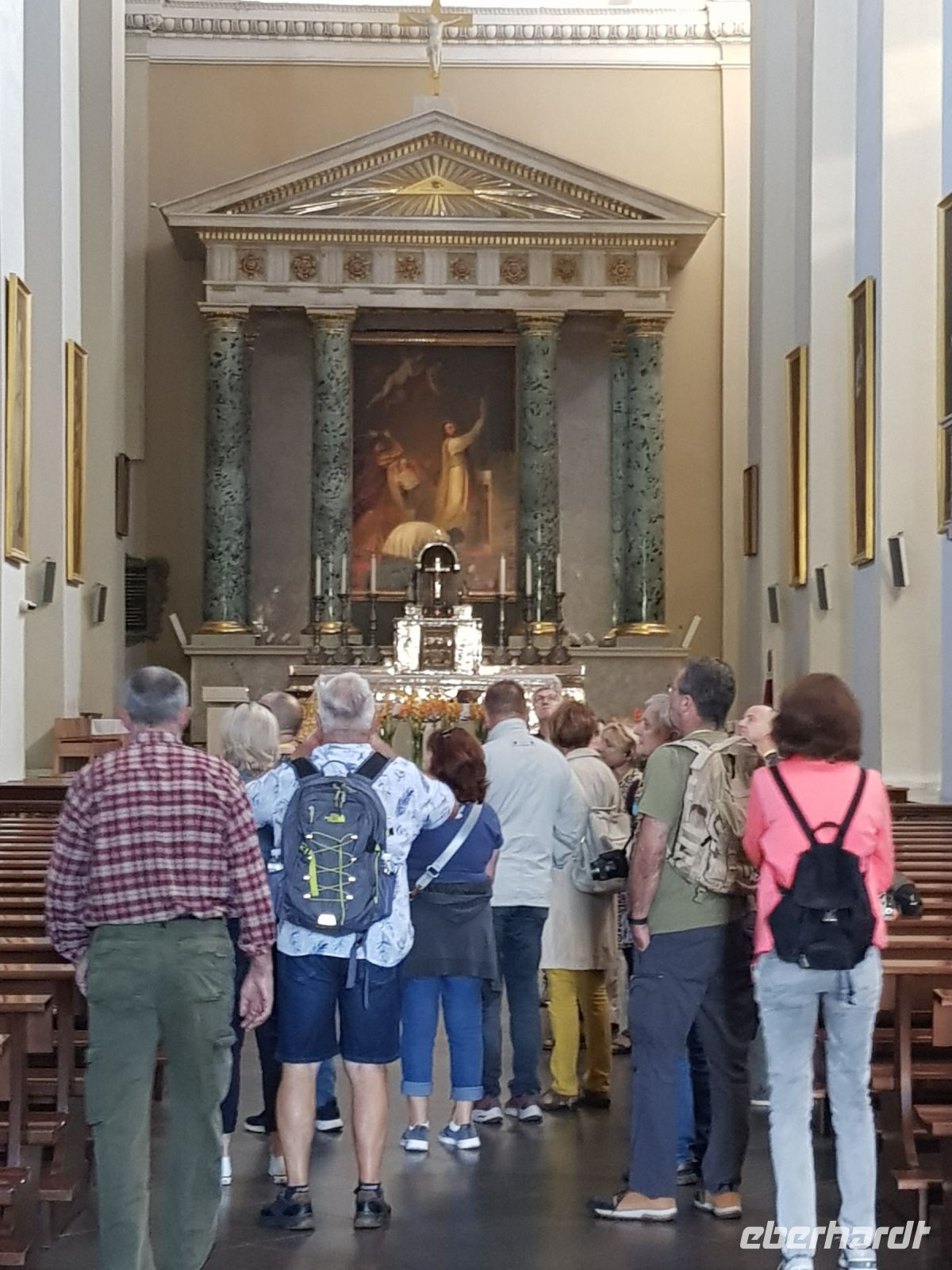 Nach einem guten Frühstück (allerdings etwas hektisch, zu viele Gäste auf ein Mal und einer der Kaffeeautomaten fällt kurzfristig aus), erwartet uns Vilija zu einem 3-stündigen Stadtrundgang. Wir werden mit Audio-Guides ausgestattet, die auch in den nächsten Tagen unsere Begleiter sein werden. Vorbei am geschichtsträchtigen Gediminas-Hügel - hierher verlegte der Großfürst nach einer Legende die litauische Hauptstadt - ist unser erster Stopp am Glockenturm der Kathedrale. Weiter geht es zum Reiterstandbild, das Fürst Gediminas darstellt. Genau hier soll der Fürst seinen Traum von einem eisernen Wolf gehabt haben, der heulte wie hundert Wölfe. Wenig weiter kommen wir zum wieder aufgebauten Fürstenpalast, der zwischen 1547 und 1553 nach Entwürfen des italienischen Architekten Giovanni Cini erbaut wurde, bei einem Stadtbrand 1610 beträchtlichen Schaden nahm, 1655 durch die russische Armee als Kaserne benutzt wurde, von den Litauern beschossen wurde und unter erneut russischer Besatzung dann vollständig zerstört wurde. Weiter führt uns der Weg in die Altstadt mit Burgstrasse - viele kleine Cafes und herrliche Blumenarrangements fallen uns auf - zur Anna-Kirche ( das schönste gotische Bauwerk Litauens). Zwischen Glockenturm und Annenkirche kommen wir zur viel grösseren Bernhardinerkirche, ein Stilgemisch aus Gotik, Renaissance und Barock. Das von der Johanniskirche dominierte Universitätsviertel umfasst einen ganzen Strassenblock der Altstadt. Für einen Betrag von 2,00 Euro können wir sowohl die Johanniskirche und den Großen Hof ( der ein wenig an eine italienische Piazza erinnert ) mit seinen vielfältigen Gebäuden der alten historischen Universität besichtigen. Von hier aus sind es nur wenige Schritte bis zum Präsidentenpalast mit seiner klassizistischen Fassade.