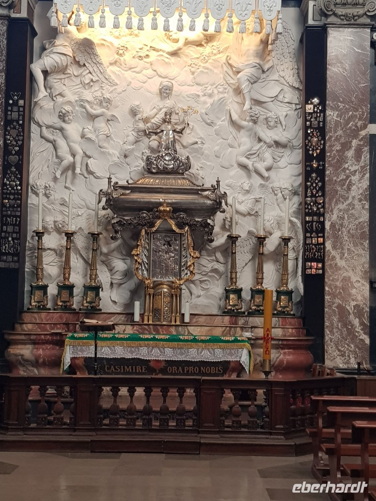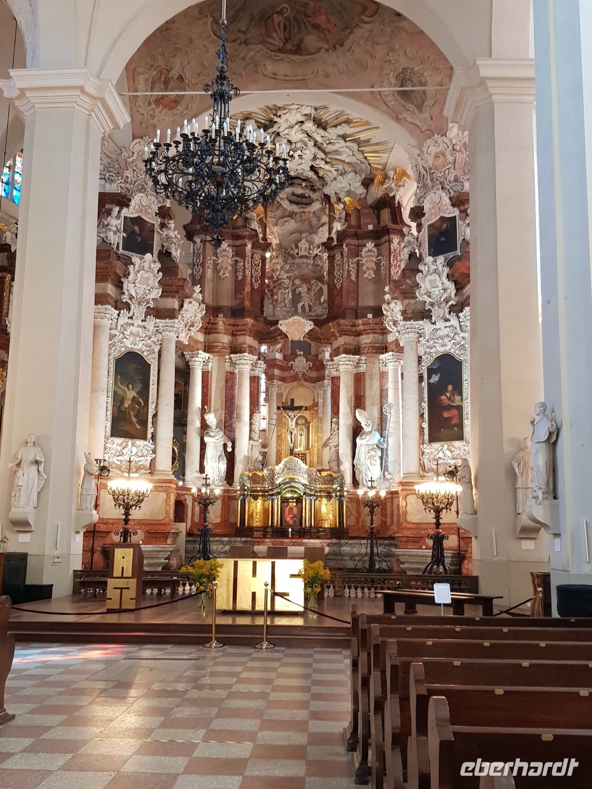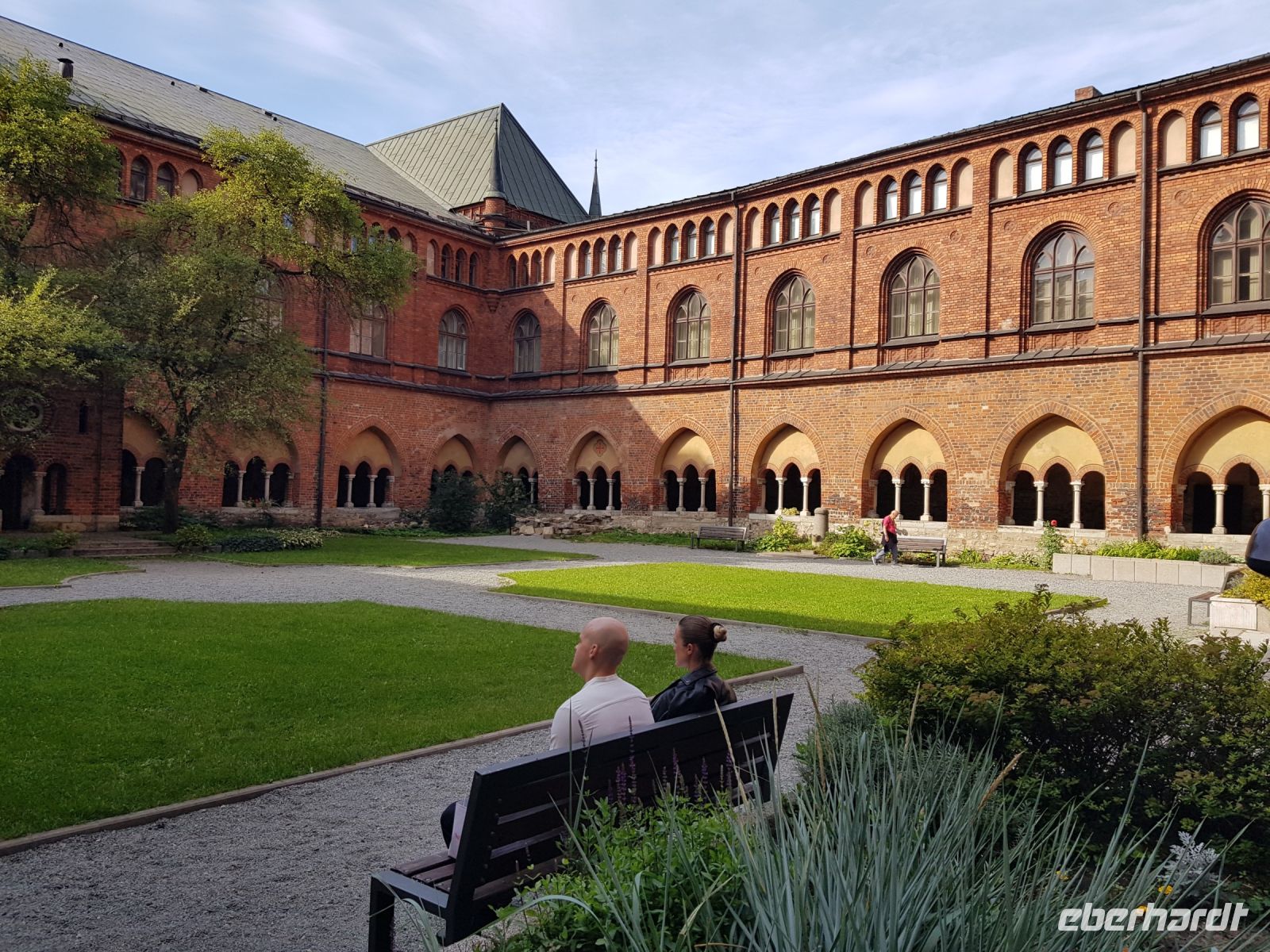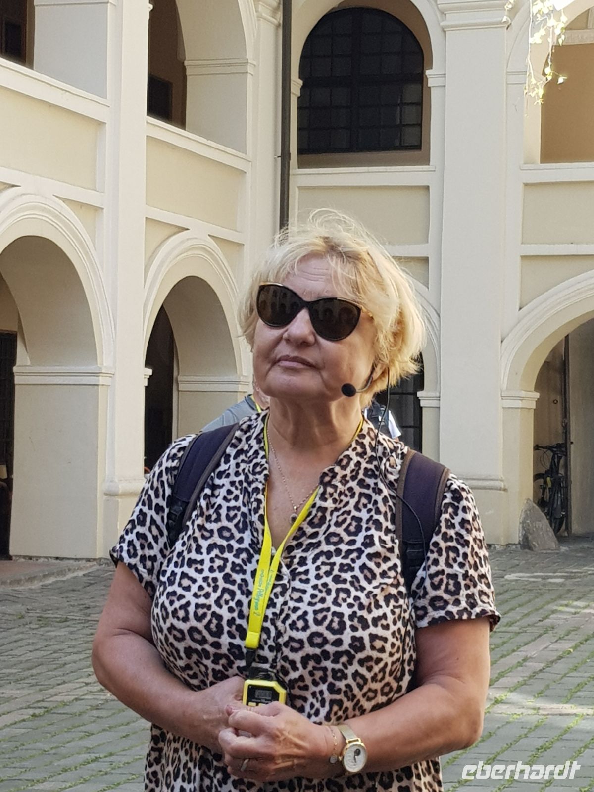 Nach einem guten Frühstück (allerdings etwas hektisch, zu viele Gäste auf ein Mal und einer der Kaffeeautomaten fällt kurzfristig aus), erwartet uns Vilija zu einem 3-stündigen Stadtrundgang. Wir werden mit Audio-Guides ausgestattet, die auch in den nächsten Tagen unsere Begleiter sein werden. Vorbei am geschichtsträchtigen Gediminas-Hügel - hierher verlegte der Großfürst nach einer Legende die litauische Hauptstadt - ist unser erster Stopp am Glockenturm der Kathedrale. Weiter geht es zum Reiterstandbild, das Fürst Gediminas darstellt. Genau hier soll der Fürst seinen Traum von einem eisernen Wolf gehabt haben, der heulte wie hundert Wölfe. Wenig weiter kommen wir zum wieder aufgebauten Fürstenpalast, der zwischen 1547 und 1553 nach Entwürfen des italienischen Architekten Giovanni Cini erbaut wurde, bei einem Stadtbrand 1610 beträchtlichen Schaden nahm, 1655 durch die russische Armee als Kaserne benutzt wurde, von den Litauern beschossen wurde und unter erneut russischer Besatzung dann vollständig zerstört wurde. Weiter führt uns der Weg in die Altstadt mit Burgstrasse - viele kleine Cafes und herrliche Blumenarrangements fallen uns auf - zur Anna-Kirche ( das schönste gotische Bauwerk Litauens). Zwischen Glockenturm und Annenkirche kommen wir zur viel grösseren Bernhardinerkirche, ein Stilgemisch aus Gotik, Renaissance und Barock. Das von der Johanniskirche dominierte Universitätsviertel umfasst einen ganzen Strassenblock der Altstadt. Für einen Betrag von 2,00 Euro können wir sowohl die Johanniskirche und den Großen Hof ( der ein wenig an eine italienische Piazza erinnert ) mit seinen vielfältigen Gebäuden der alten historischen Universität besichtigen. Von hier aus sind es nur wenige Schritte bis zum Präsidentenpalast mit seiner klassizistischen Fassade.