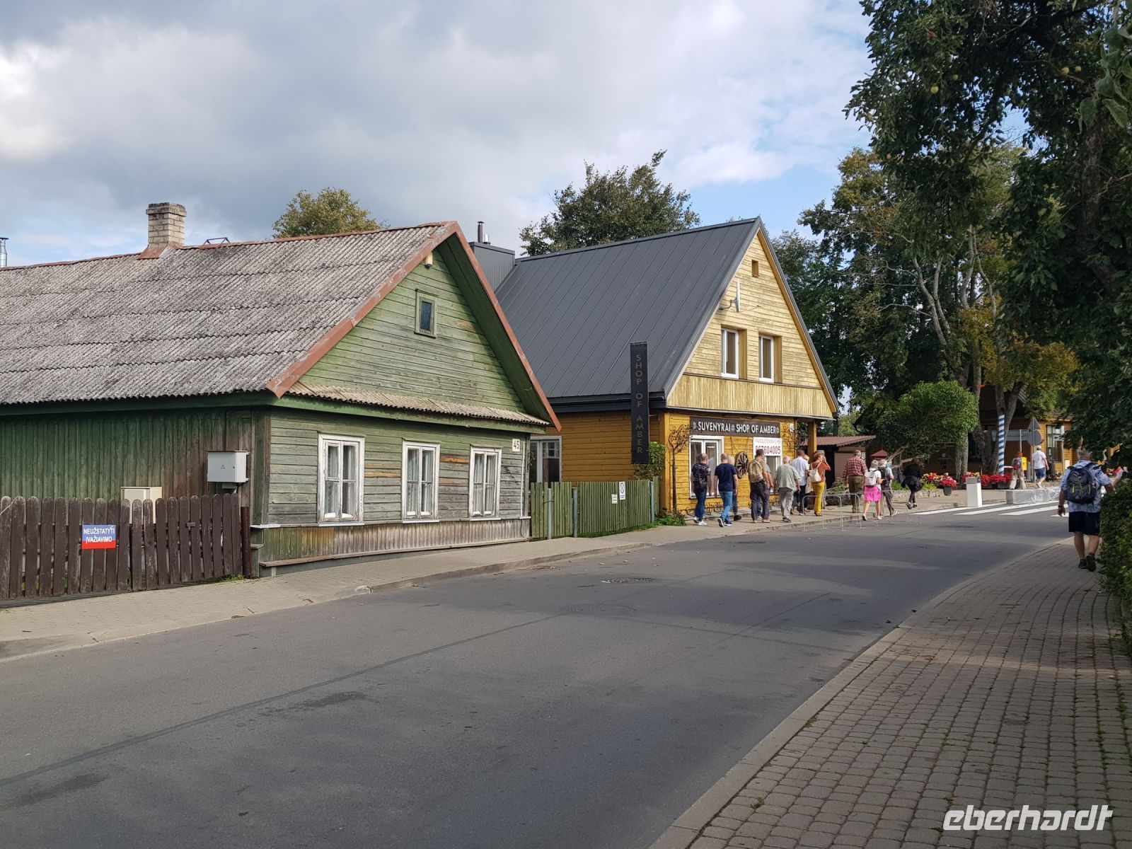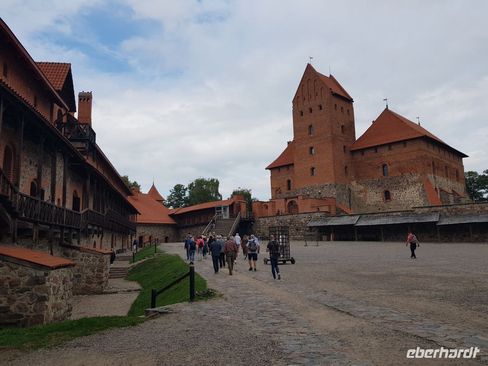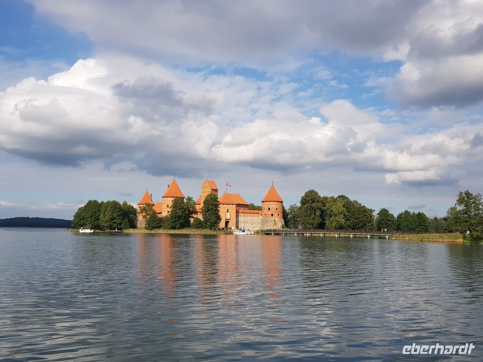 In einer hübschen Seenlandschaft, keine 50 km von Vilnius entfernt, liegt sie, die mächtige Inselburg, die bis zur Stadtgründung von Vilnius litauische Hauptstadt Litauens war. Über einen Holzsteg erreichen wir die Vorburg, die durch eine Brücke mit der Hauptburg verbubden ist. Das dreistöckige kastellartige Gebäude beherbergt allerhand spätmittelalterliche Gegenstände aller Art - hier bekommt man einen Kompaktkurs in litauischer Geschichte. Auch das Umland lernen wir bei einem Spaziergang kennen. Neben den vielen Cafes am Seeufer, Tretbootverleih, Läden für Kunsthandwerk, Ständen mit Bernstein-Utensilien entdecken wir auf dem Weg zum Bus die typischen Holzhäuser mit ihren Vorgärten.
