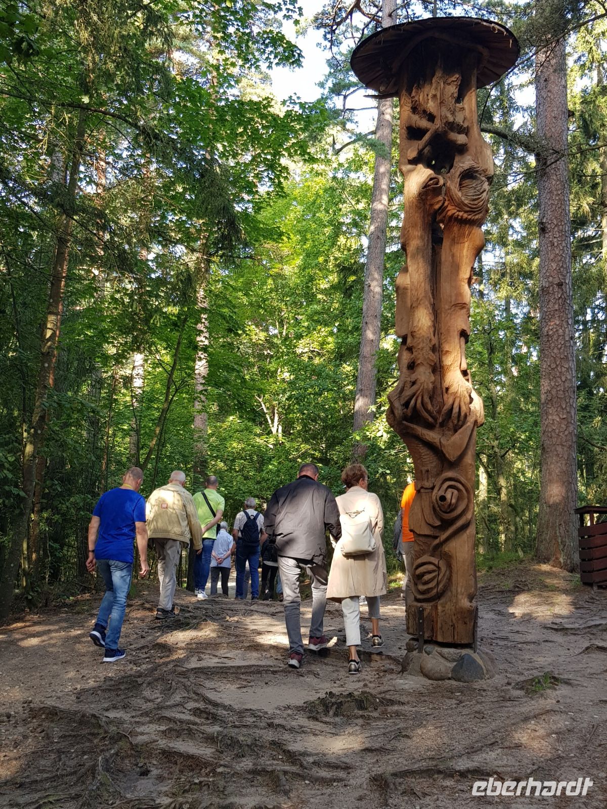 Auf der Landzunge angekommen, geht es rund 50 km gen Westen. Unseren 1.Stopp legen wir in Schwarzort ein, wo ein von Holzskulpturen gesäumter Wanderweg auf den Hexenberg führt. Große Holzfiguren und Holzbänke laden zum Verweilen ein, wir machen einen 1-stündigen Spaziergang durch den Wald, atmen die gesunde Waldluft ein ( schon 20 min. reichen, um aus dem Wald gesünder herauszukommen, als man hineingegangen ist) und Bestaunen die Figuren, die alle eine Geschichte haben, die uns Vilija erzählen kann. Danach fahren wir mit dem Bus zum nächsten Stopp: das große Dünenfeld der Kurischen Nehrung. Die Wanderung entlang der Großen Düne ist ein sehr beeindruckendes Naturerlebnis und bei solch strahlender Sonne haben wir Ausblick bis zur litauischen/russischen Grenze und weiter nördlich auf die Stadt und den Hafen von Nidden.
